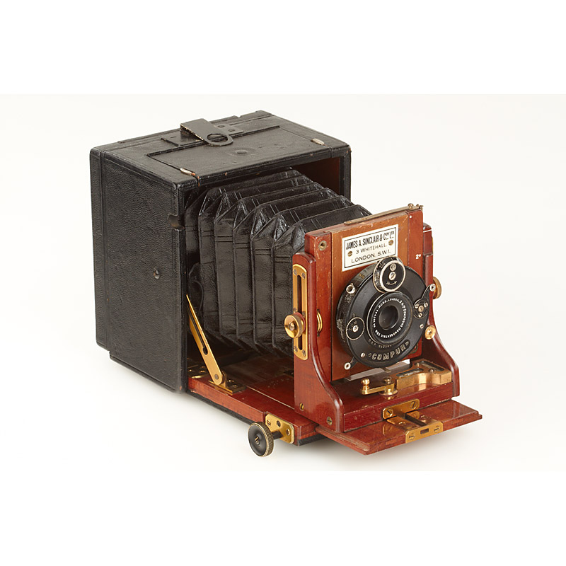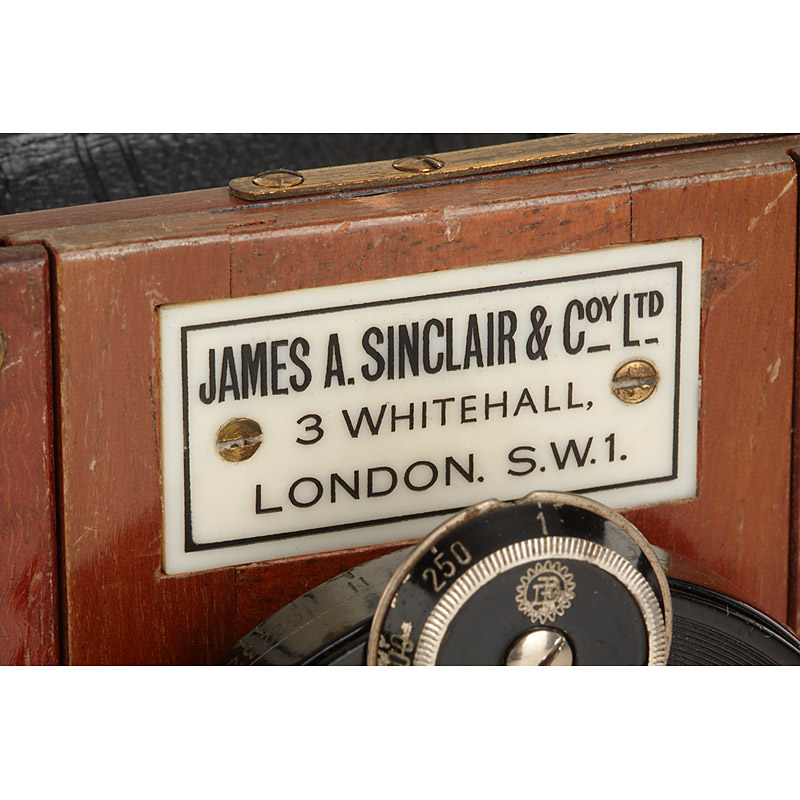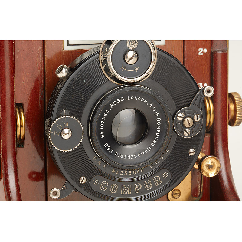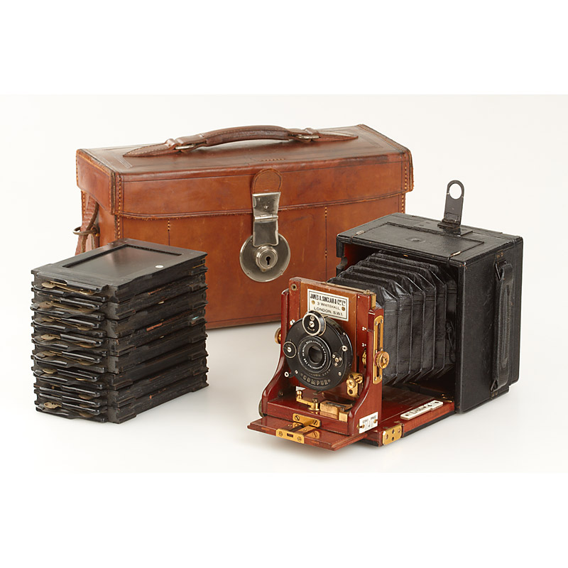 6x9cm version in fine condition, polished-mahogany leather covered body, Ross 6.8/3 1/2' Compound Homocentric in Compur shutter (cap), ground glass holder, 8 double plate film holders, in fitted Sinclair leather case, two spare lens boards and 5 packages of Ilford plates