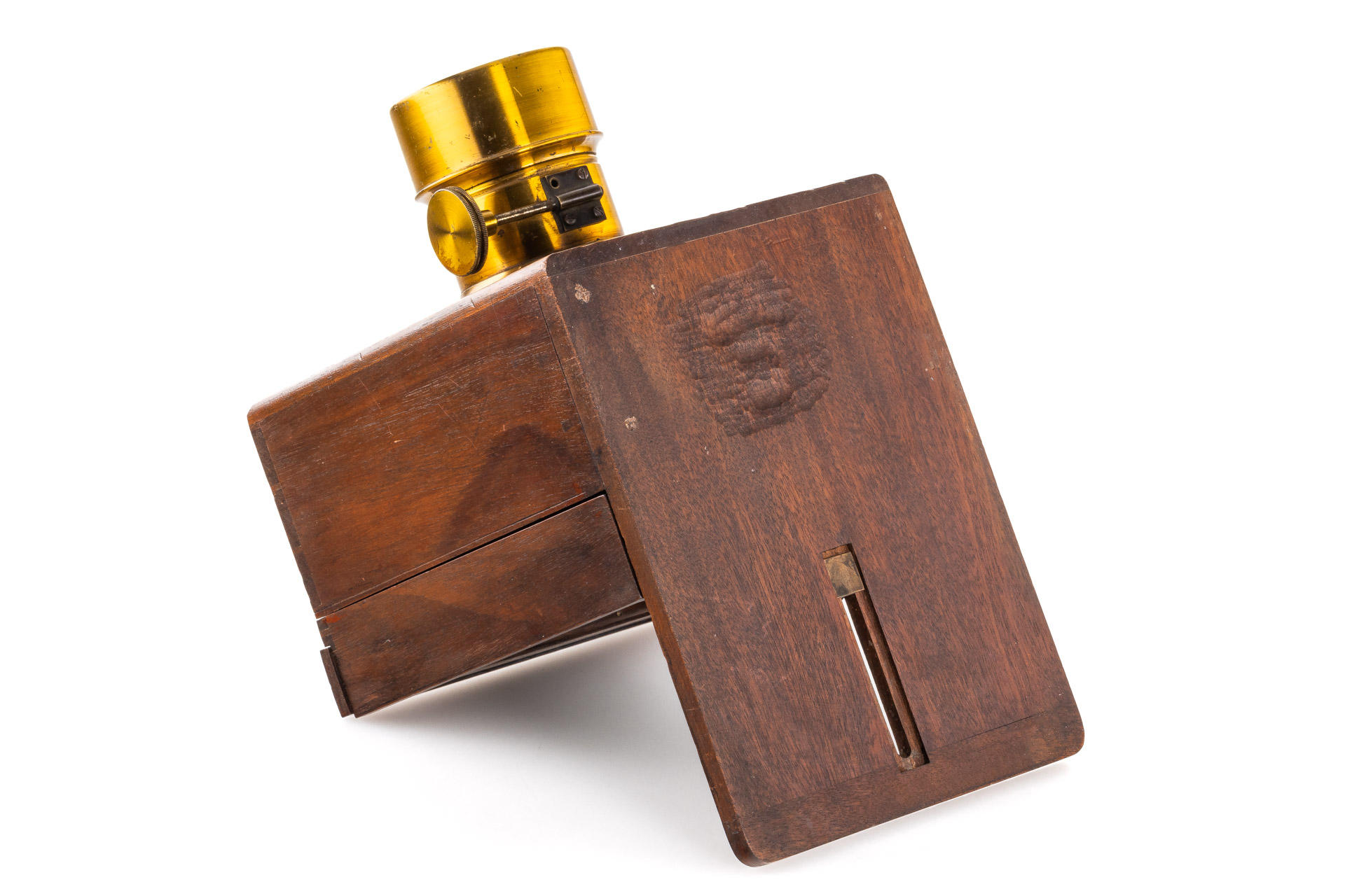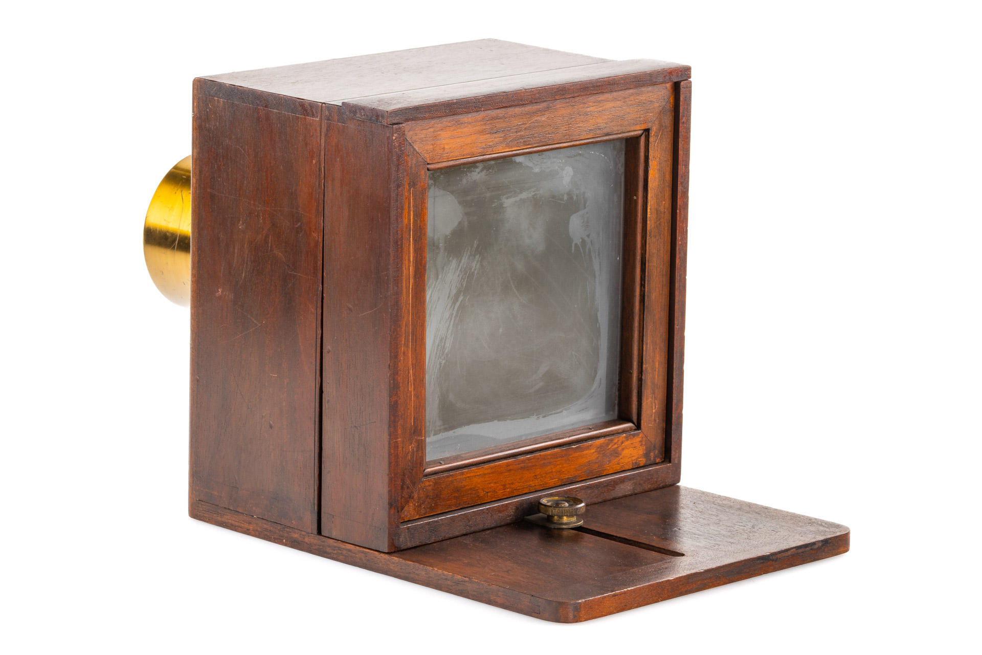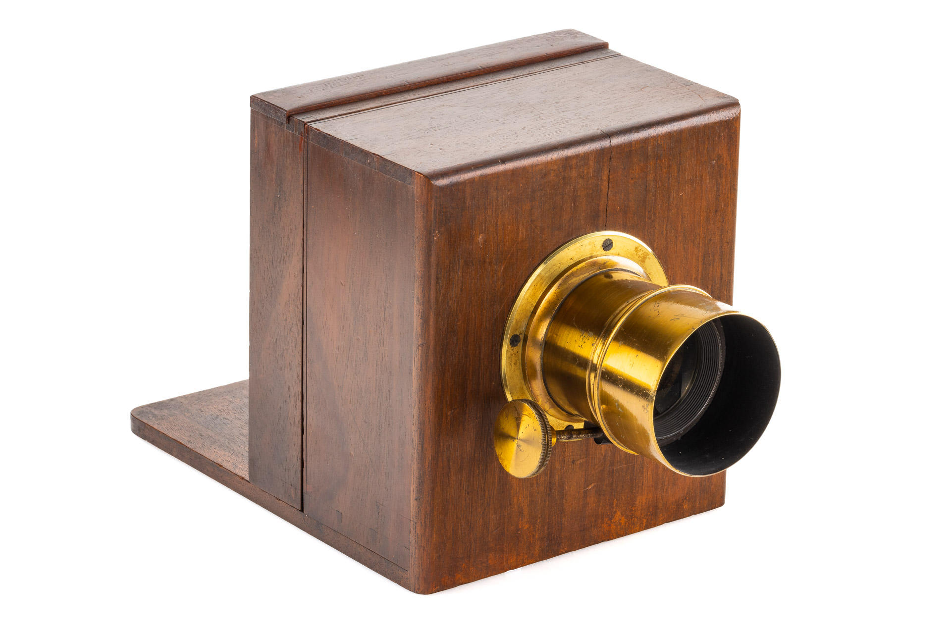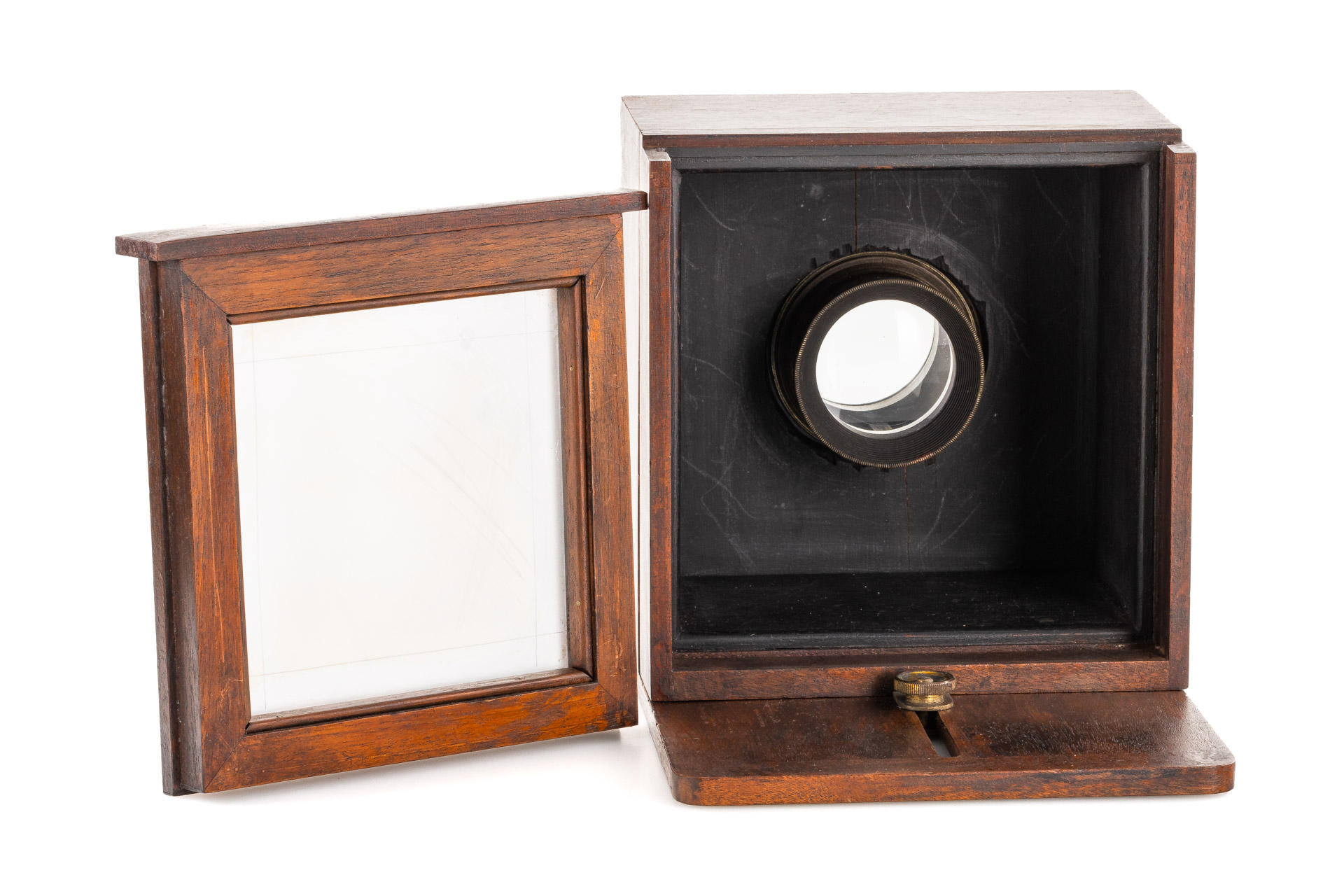 interesting sliding box camera for 10x10cm film plates in very good condition, with sought-after Petzval lens without engraving, with matching focus and film plate holder back