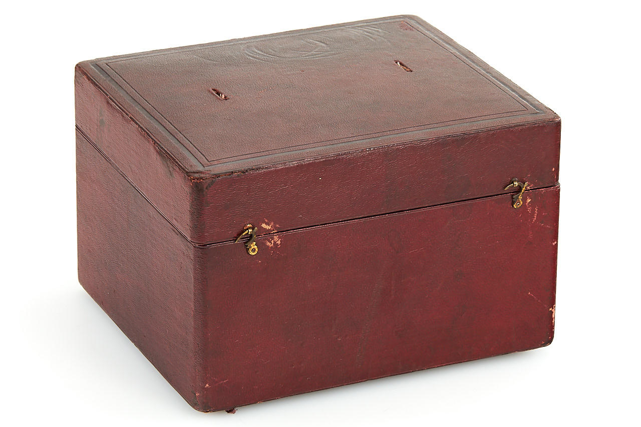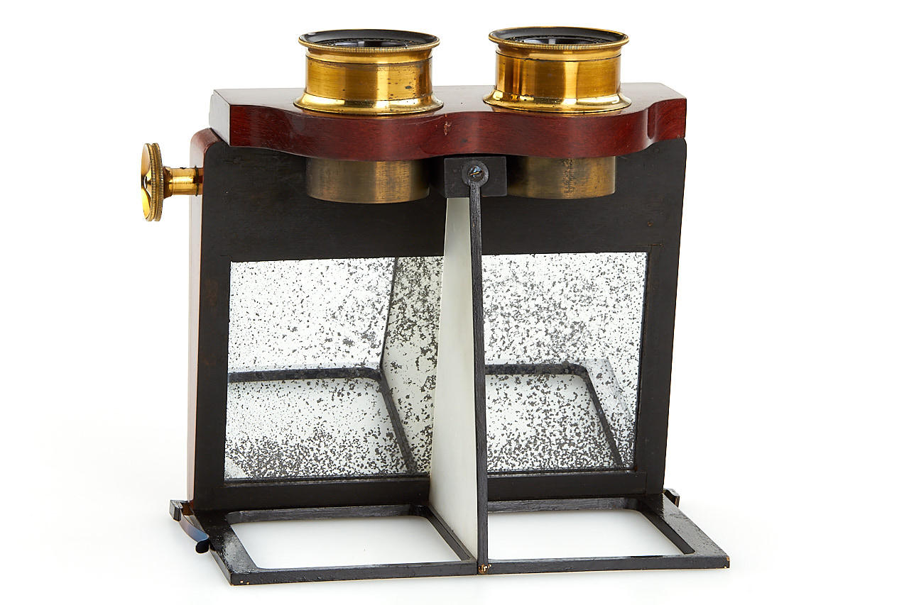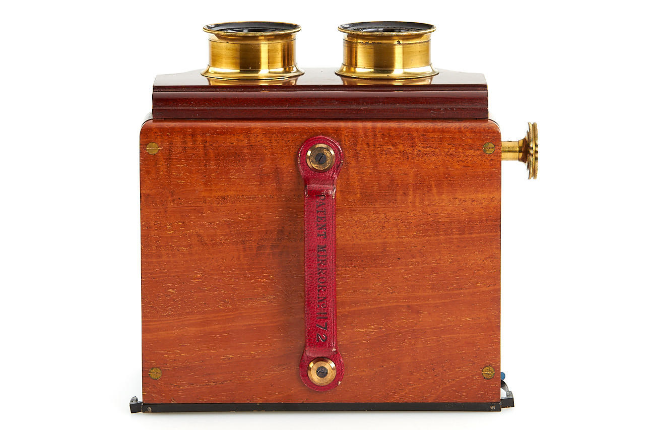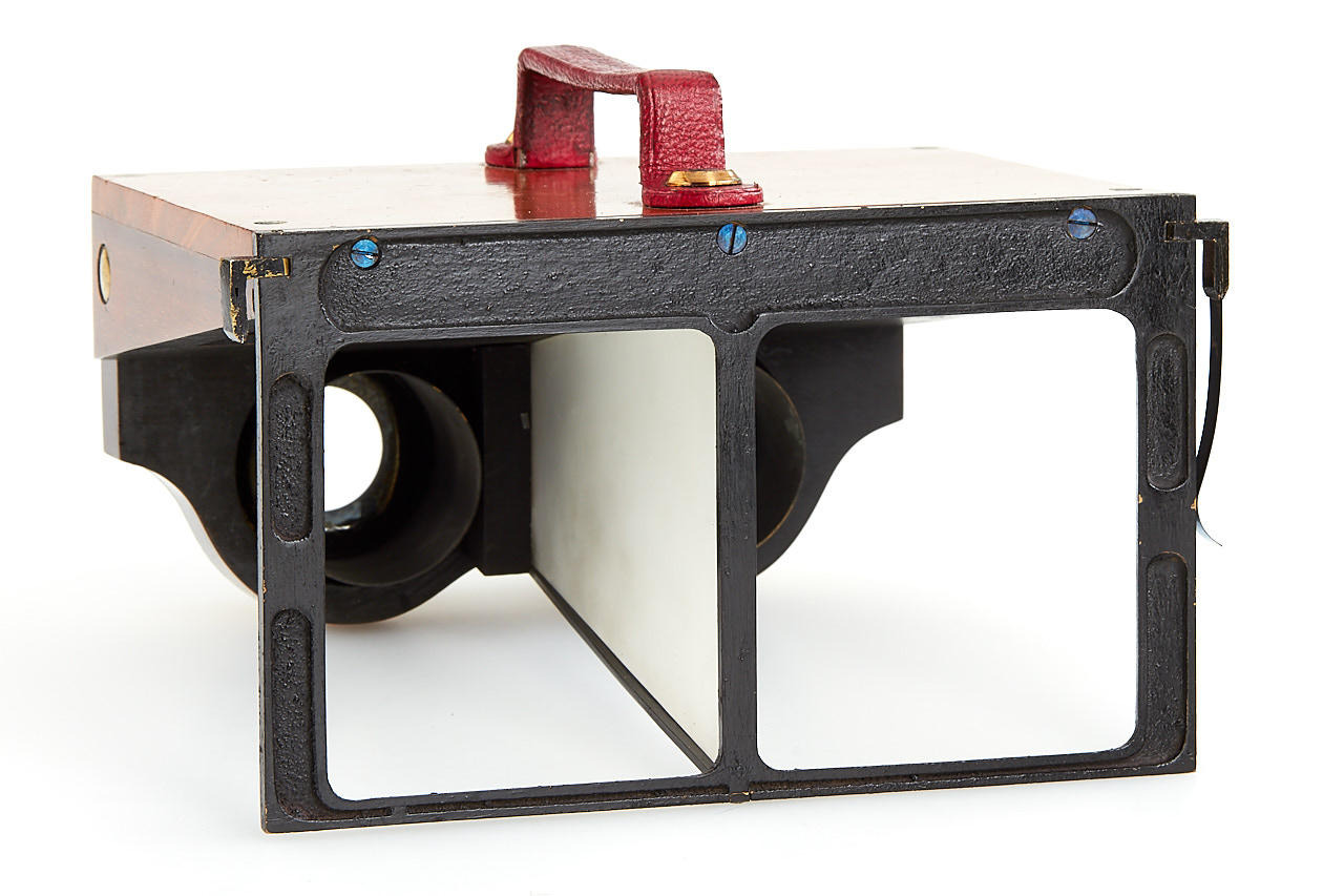 very rare and well made handheld stereo viewer for 8x16cm plates or prints, mahogany body with brass fittings, red handle, in excellent condition (missing one spring holding the photos - still usable), in fitted maker's box (missing box handle)