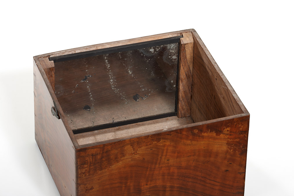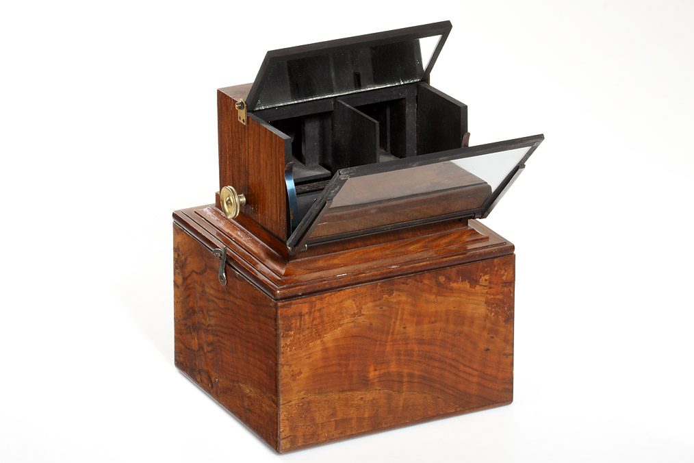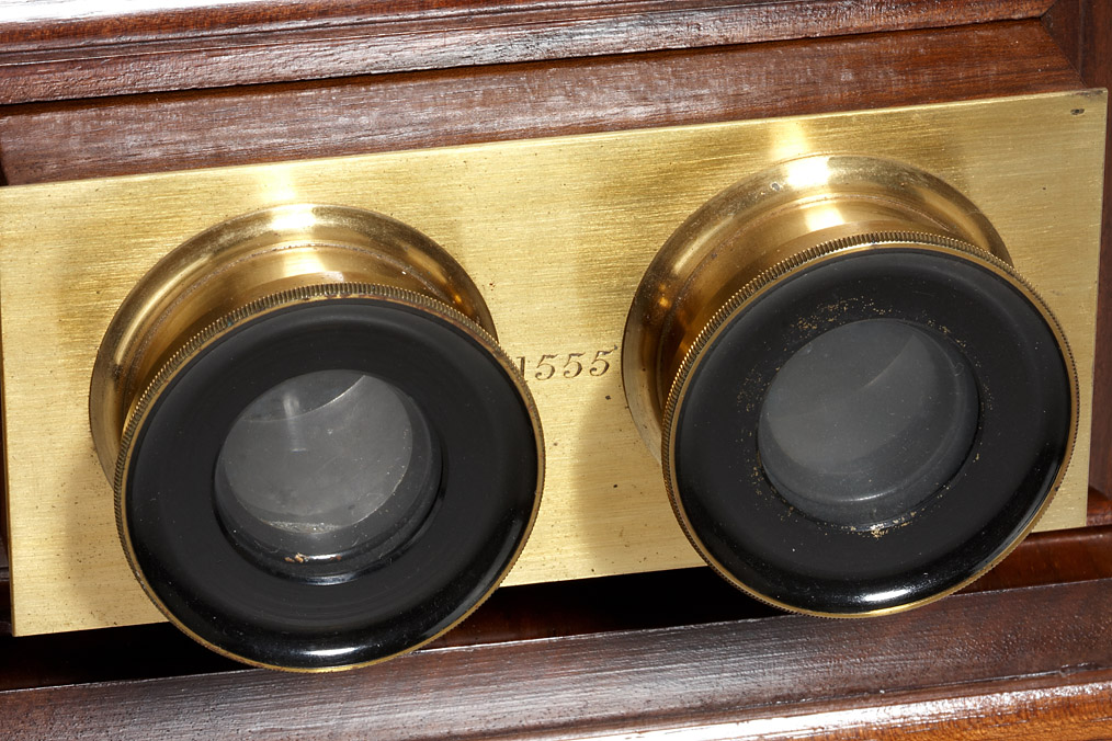 extremely rare second model produced by Smith, Beck & Beck of London. The polished mahogany carrying case with a brass carrying handle on the top of the lid, the stereoscope is built on the underside of the lid which can be reversed and mounted on the top of the carrying case. The viewer is also made of polished mahogany with lacquered brass fittings, hinged at the back with an adjustable bracket to incline the viewer to a convenient viewing angle. The viewer has a hinged mirror for use with cardboard views; with the mirror closed the viewer can be used with glass and tissue views. The prismatic lenses are mounted in brass eyepieces on a brass plate and can be focussed by knurled brass knobs on either side of the viewer. This exceptional stereoscope is in very good overall condition. The classical Smith, Beck & Beck Mirror stereoscope is for sale in this auction.