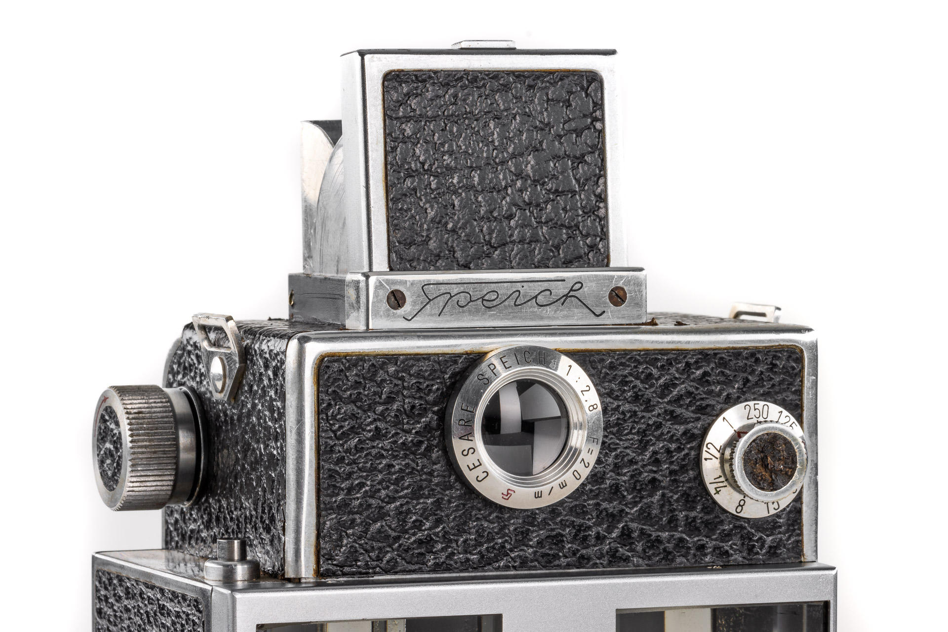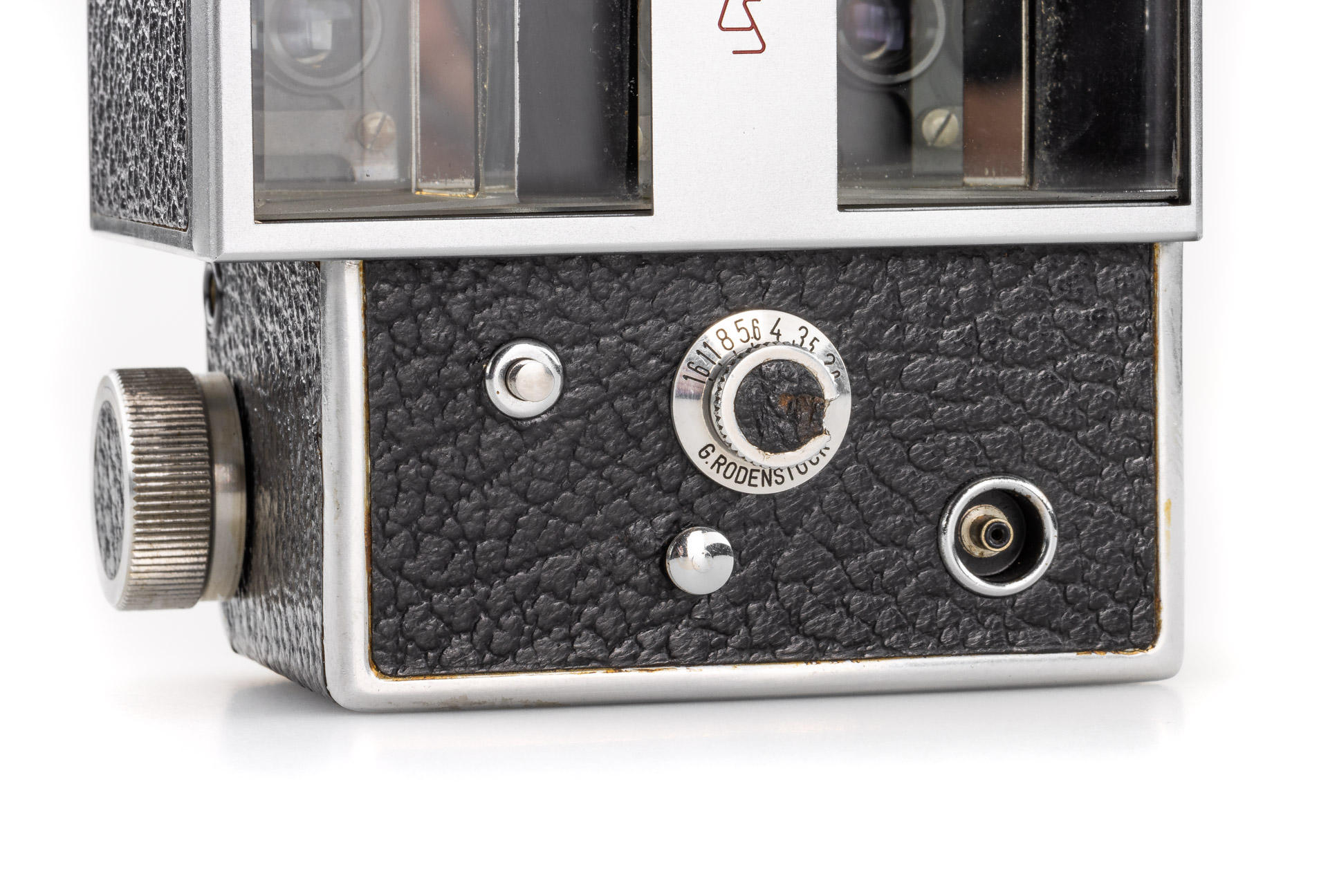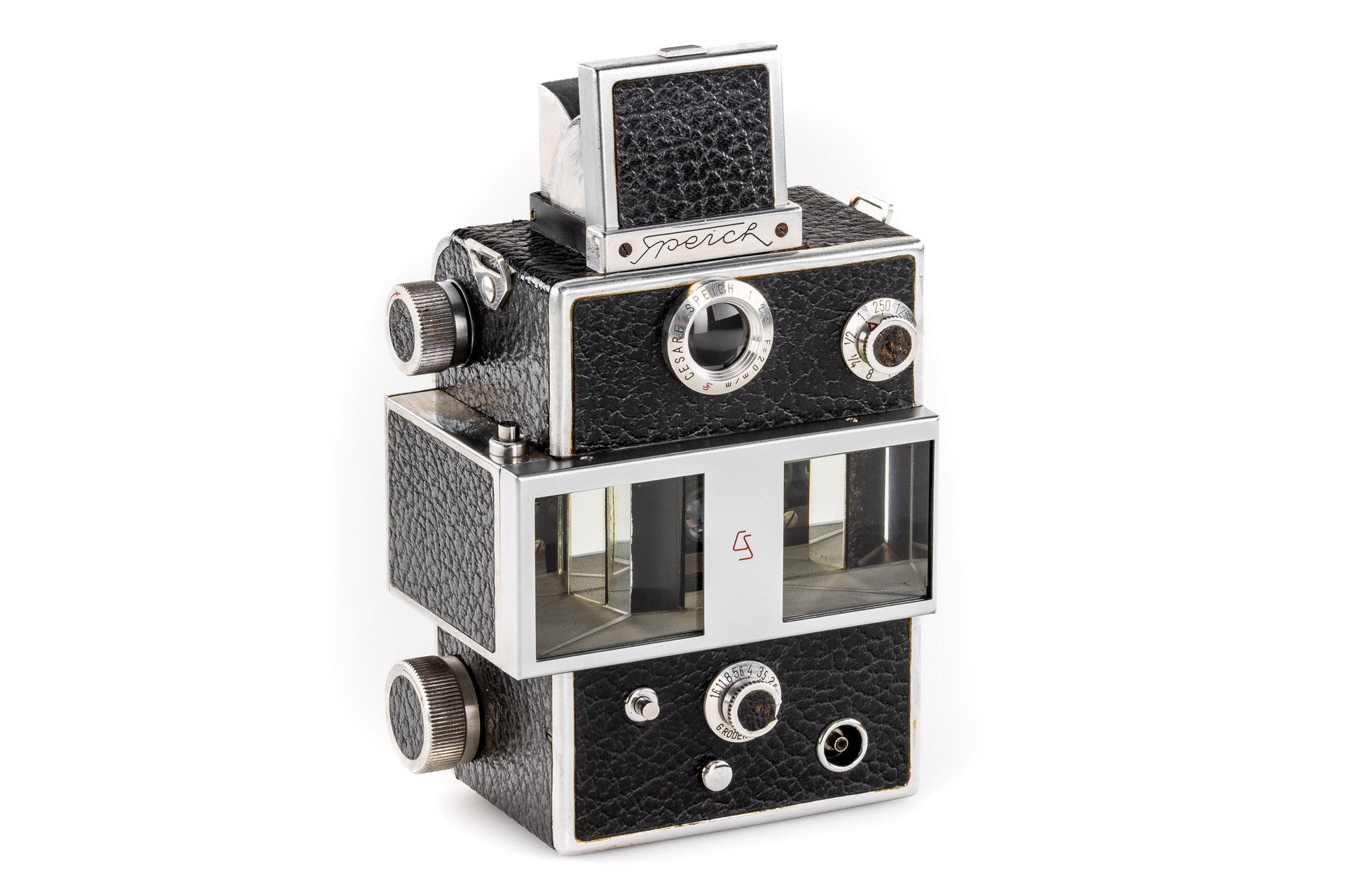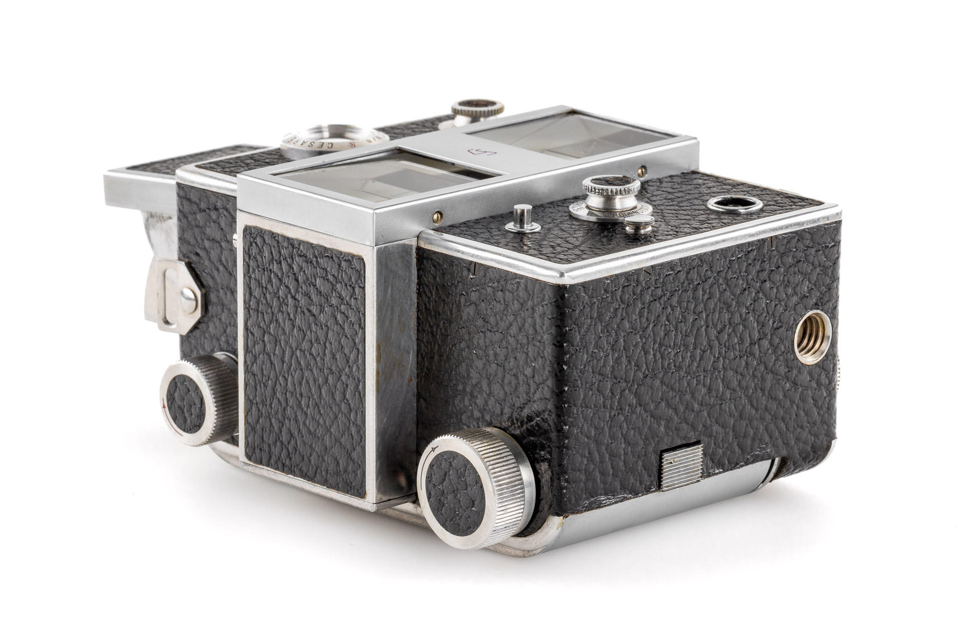 An extremely rare stereo camera for 110 exposures 10x12mm on 35mm film in standard cassettes, with Rodenstock Cesare 2.8/20mm, only approximately 15 prototypes of this unusual camera were produced by Cesare Speich, Genoa, Italy. In very good original condition and working order. It is for sure one of the most sophisticated and unusual stereo 35mm cameras.