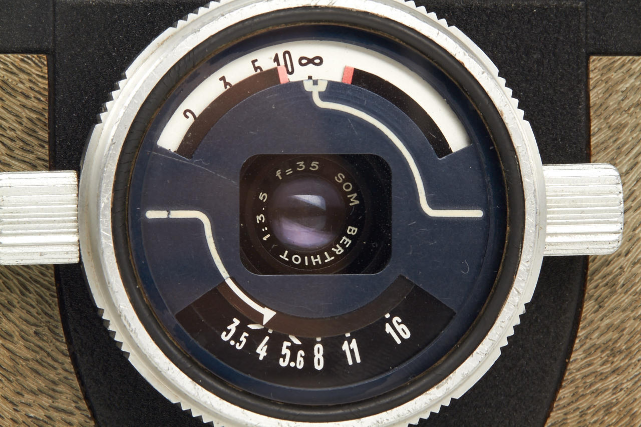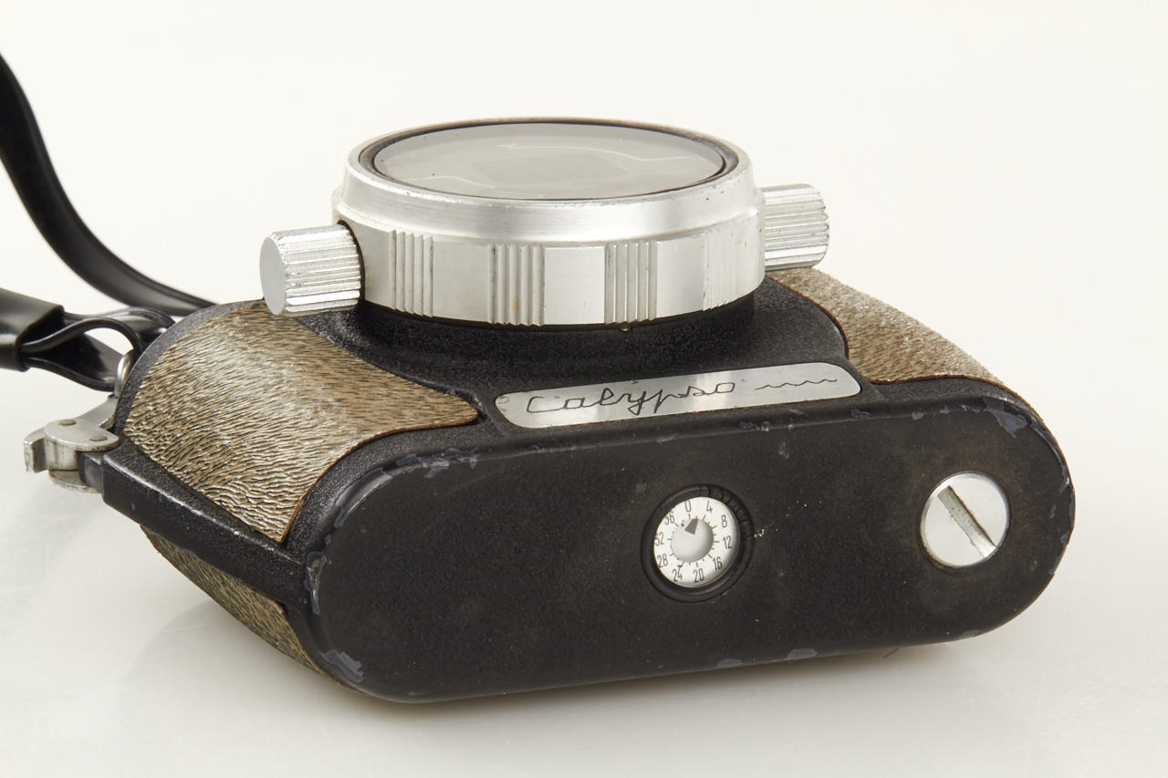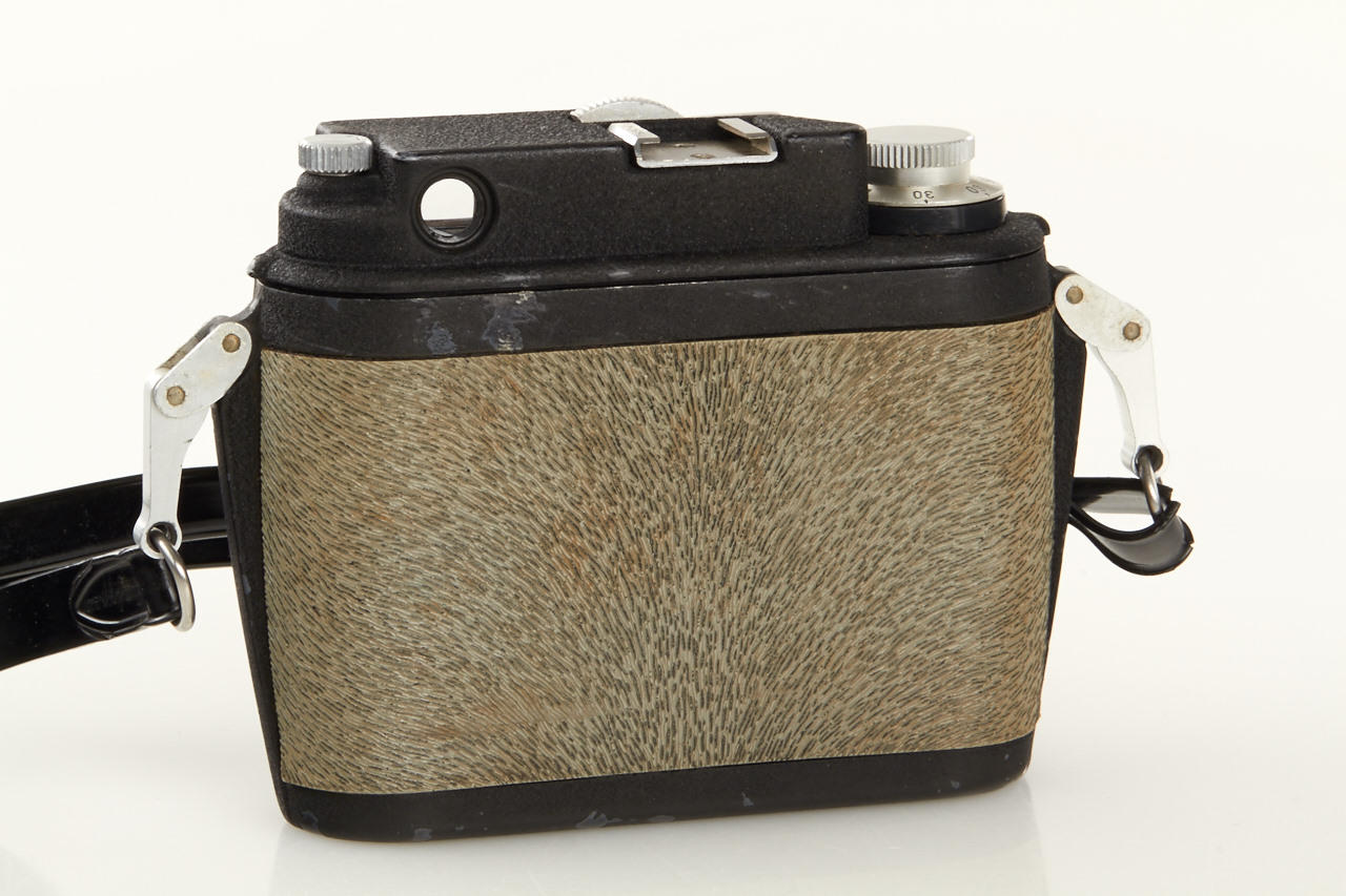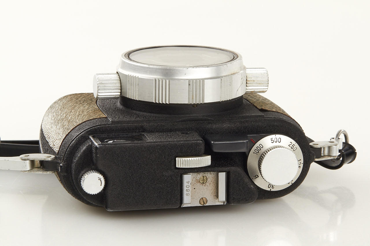 early underwater camera (forerunner of the Nikonos), first type with grey plastic imitation sealskin (1/30-1000 sec.) in very good original condition and perfect working order, Som Berthiot 3.5/35mm no.00582, strap