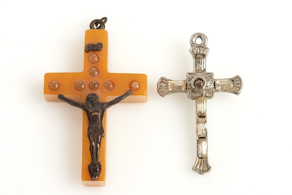 compilation of 6 Stanhope viewers: (1) American novelty galalite pen with 6 functions, c.1925. Single view: nude, (2) bone reversible pen, c.1900. 6 views of Florida, (3) bone binocular charm, c.1920. Two lenses each with 3 views of Mackinac Island, Mich, (4) Bakelite crucifix with seven lenses, c.1930. Single views of the Seven Sorrows, (5) metal rhinestone crucifix, c.1960. Single view: The Lord’s Prayer, (6) black glass shamrock charm, c.1900. McKee Dublin 6 views of Padstow. Ex-Naylor Collection.