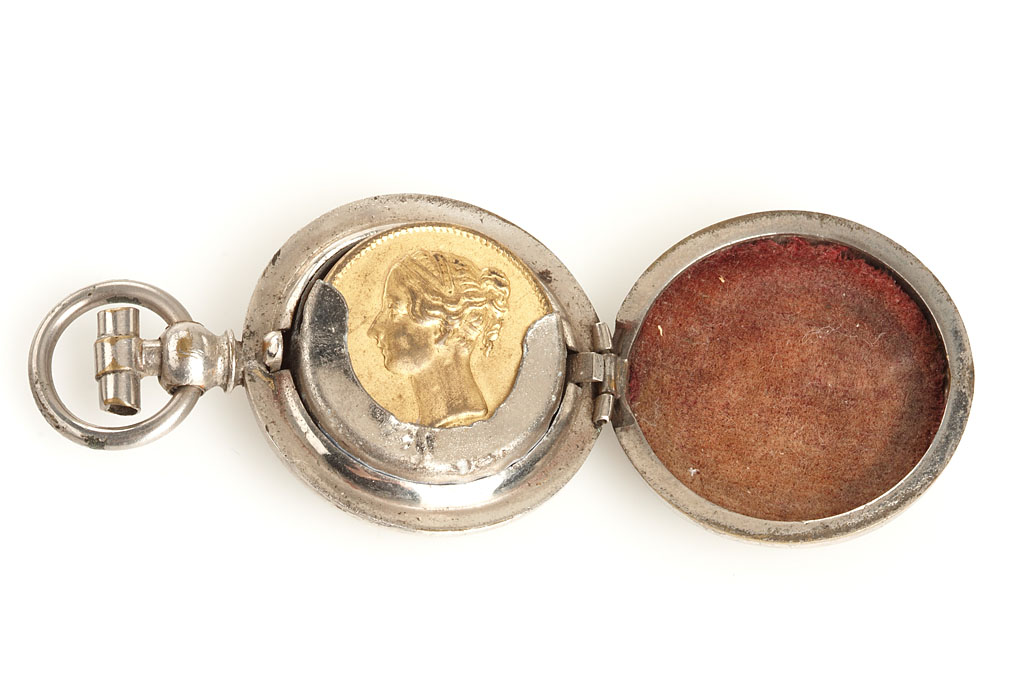 rare metal pendant sovereign holder, with Stanhope lens at the top, c.1890. McKee Dublin, 6 views of Luton. Ex-Naylor Collection.