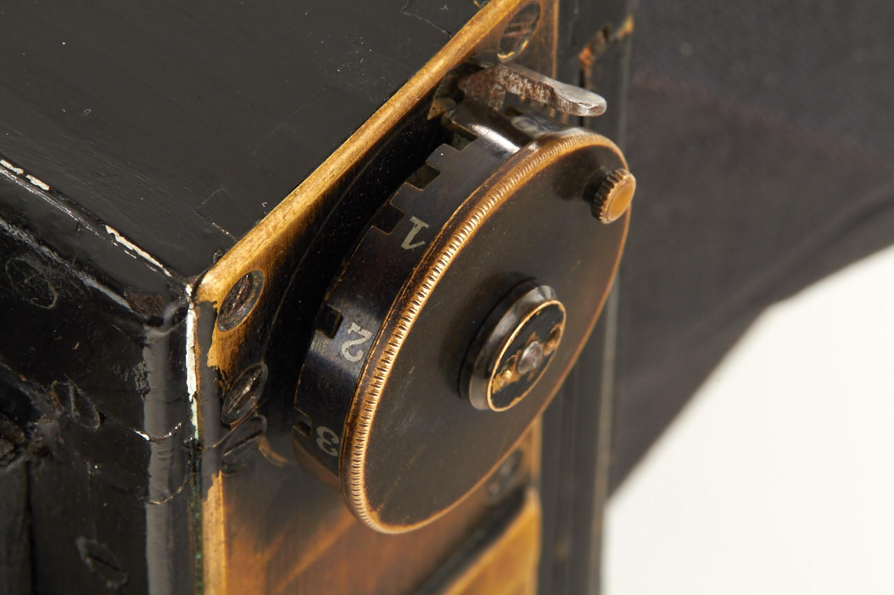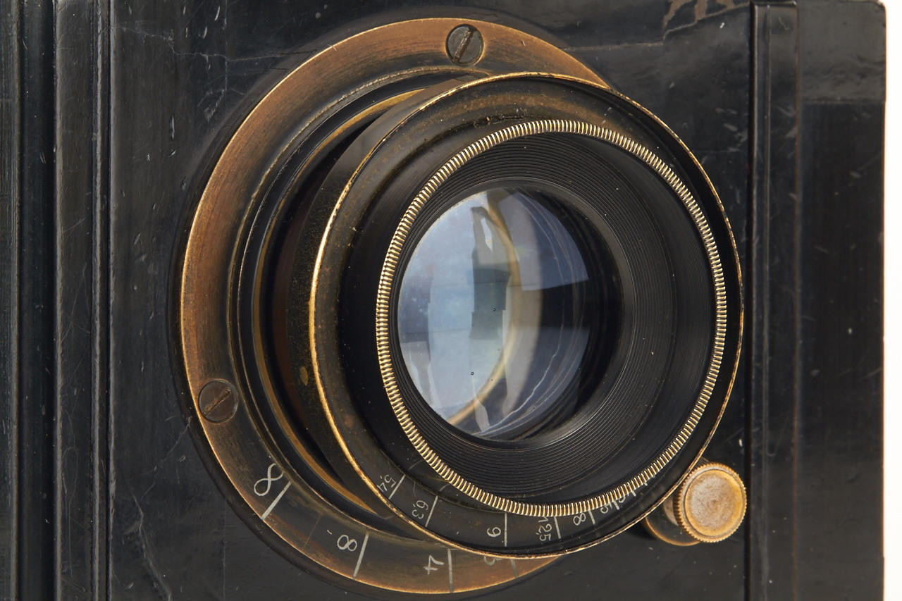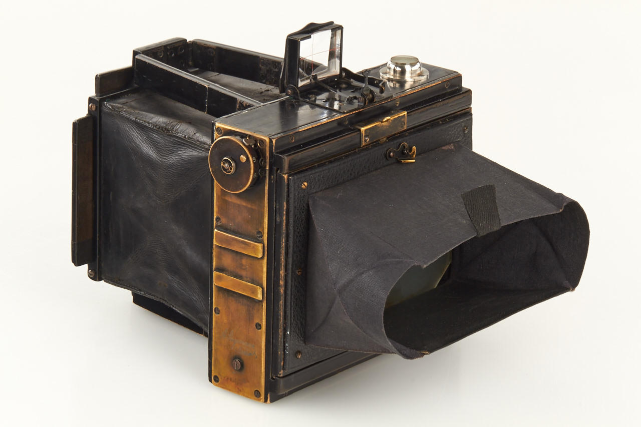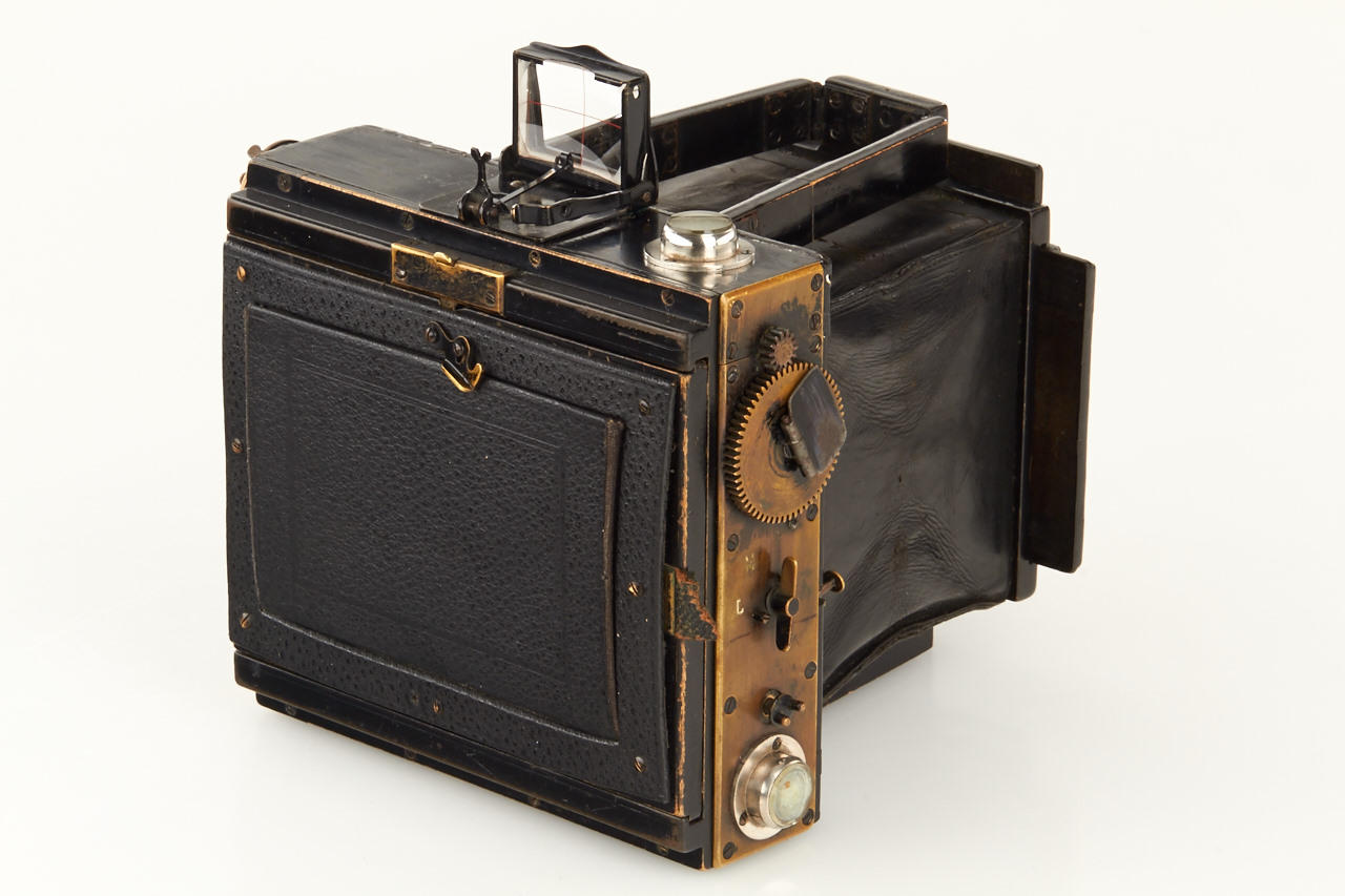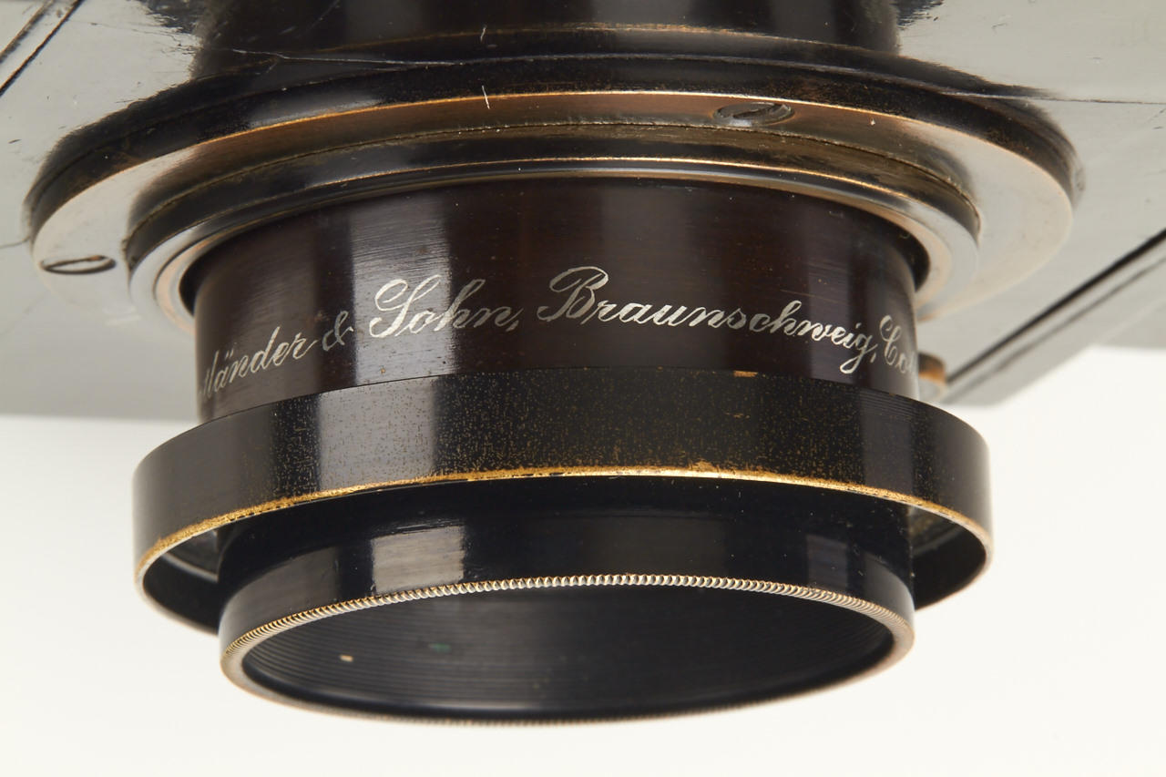 compact strut-folding camera for 9x12cm plates, rare early version with wooden struts, focal plane shutter, matching Voigtländer Collinear II F:5.4 no.3 No.51536, focusing screen