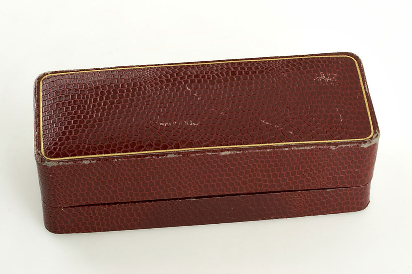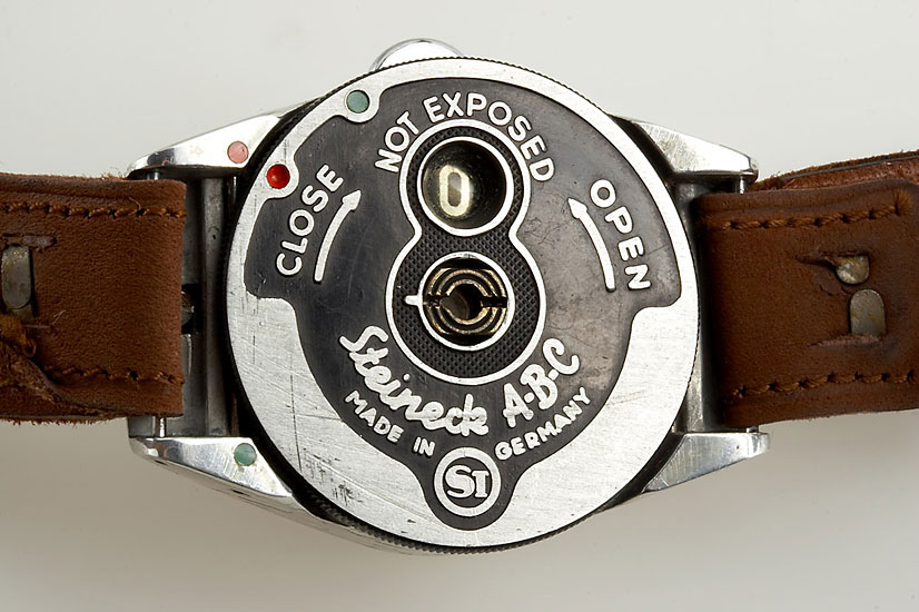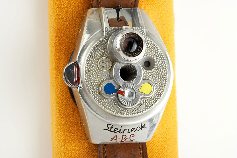 wristwatch camera for 8 exposures on 25mm diameter circular film, Steinheil 2.5/12.5mm VL lens, with brown strap, in original maker's box with reptile leather, guarantee card