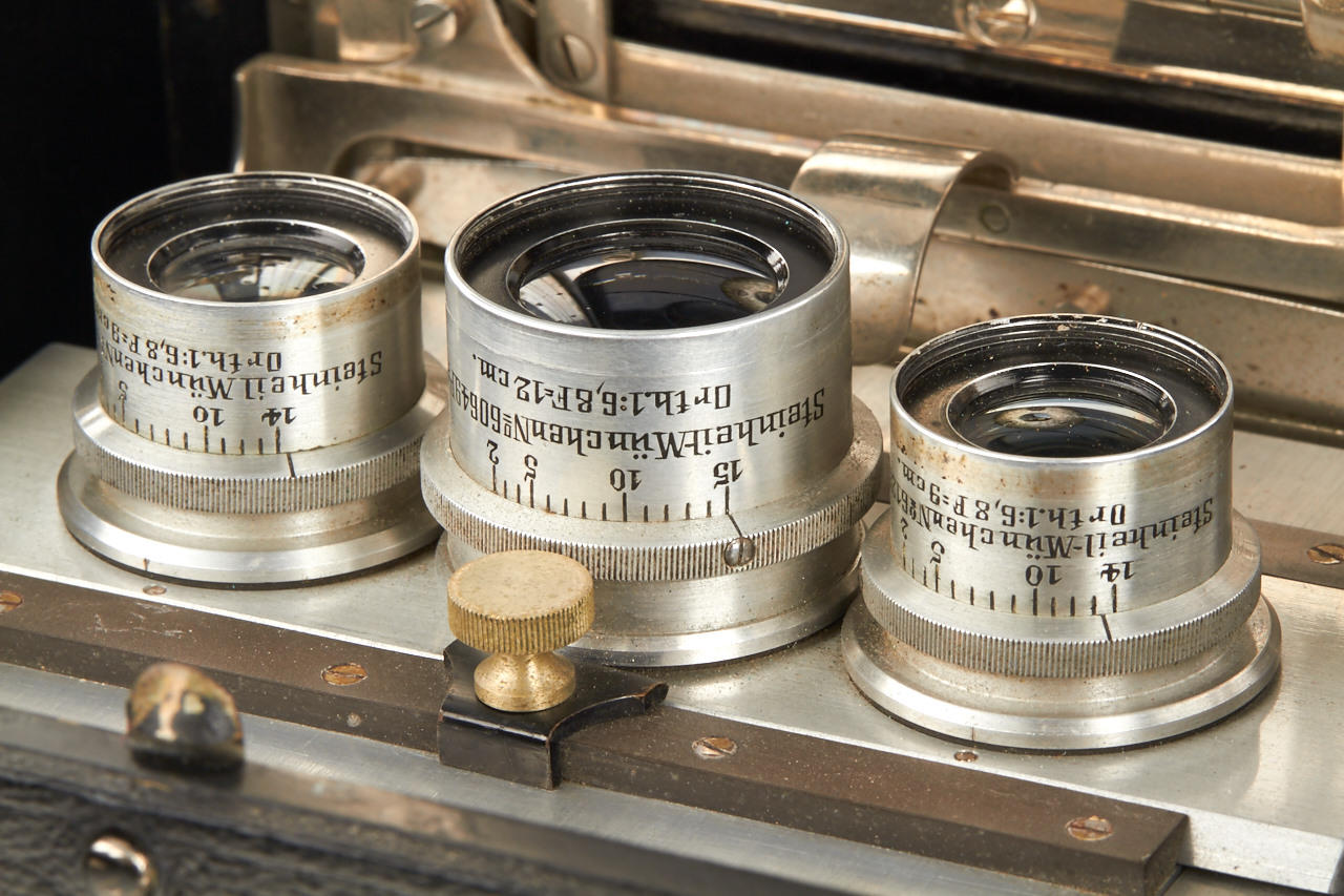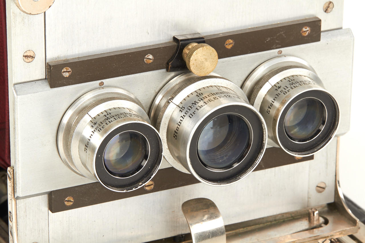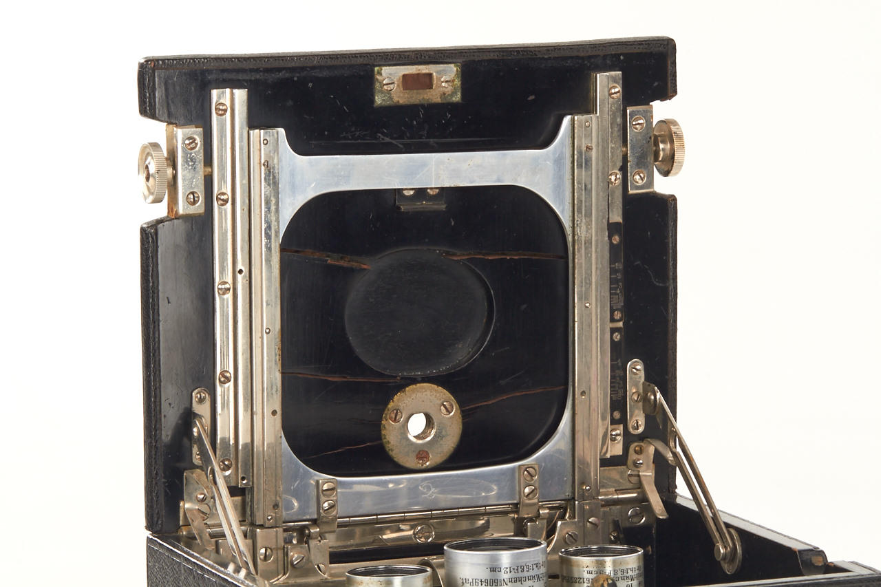 rare folding-bed camera for stereo and panoramic exposures on 9x14cm plates, the camera is in very good condition (focal plane shutter not operable), equipped with a pair of Steinheil Orthostigmat 6.8/9cm no.61285 and 61286 for stereo pictures and one Steinheil Orthostigmat 6.8/12cm no.60649 on aluminium lens board (very expensive at that time)