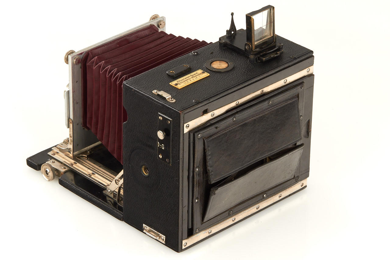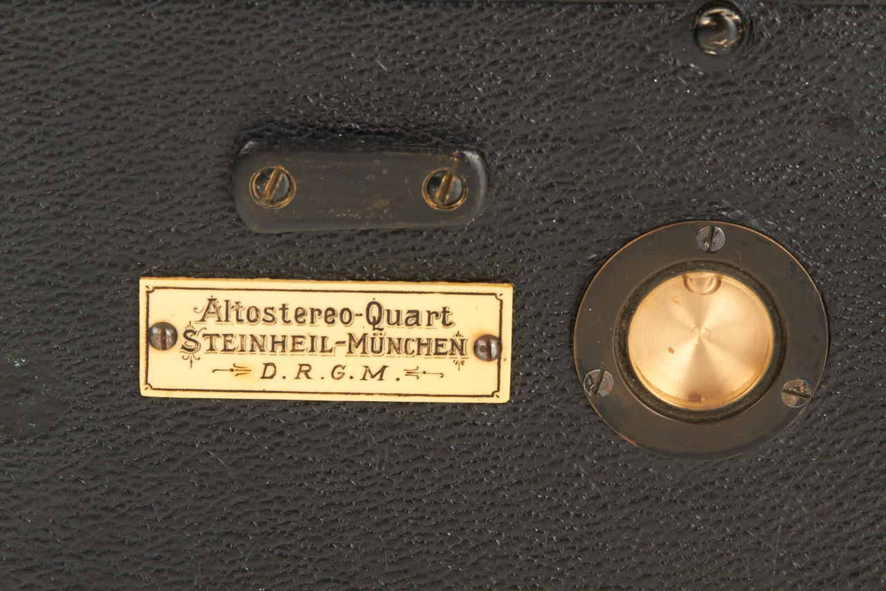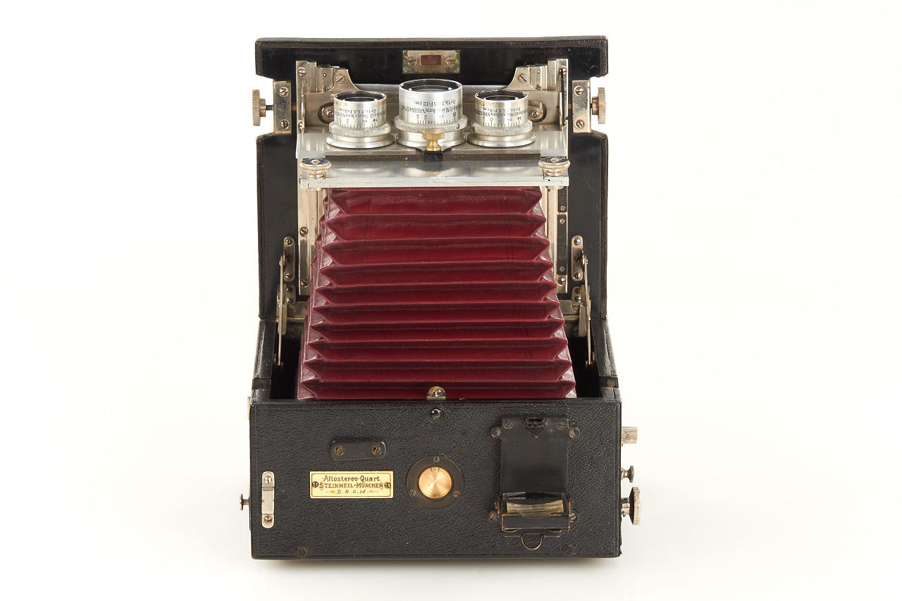 rare folding-bed camera for stereo and panoramic exposures on 9x14cm plates, the camera is in very good condition (focal plane shutter not operable), equipped with a pair of Steinheil Orthostigmat 6.8/9cm no.61285 and 61286 for stereo pictures and one Steinheil Orthostigmat 6.8/12cm no.60649 on aluminium lens board (very expensive at that time)