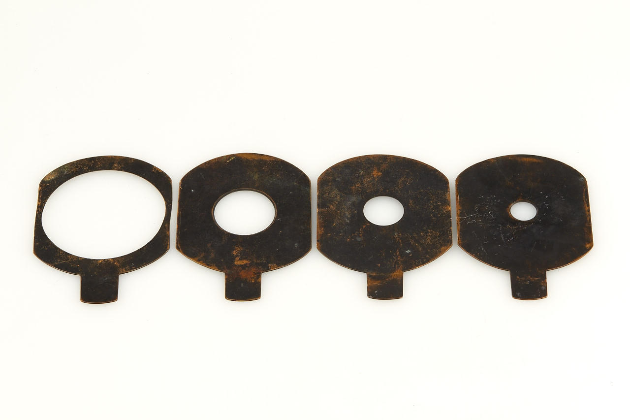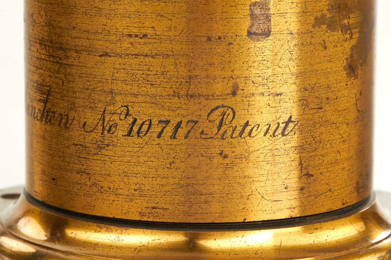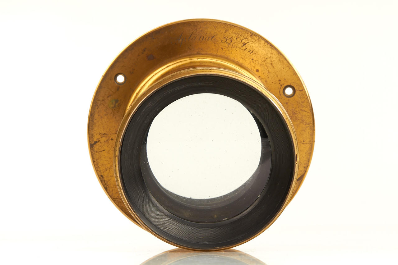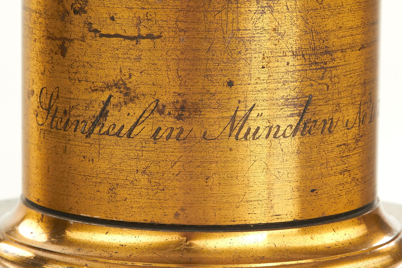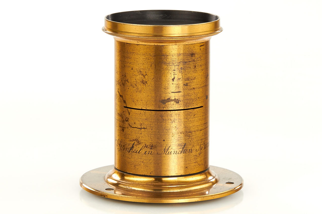 early brass Steinheil lens, focal length c.60cm, front and rear element diameter c.7,5cm, total height c.15cm, very good condition, with 4 Waterhouse stops and mounting ring