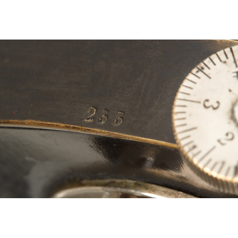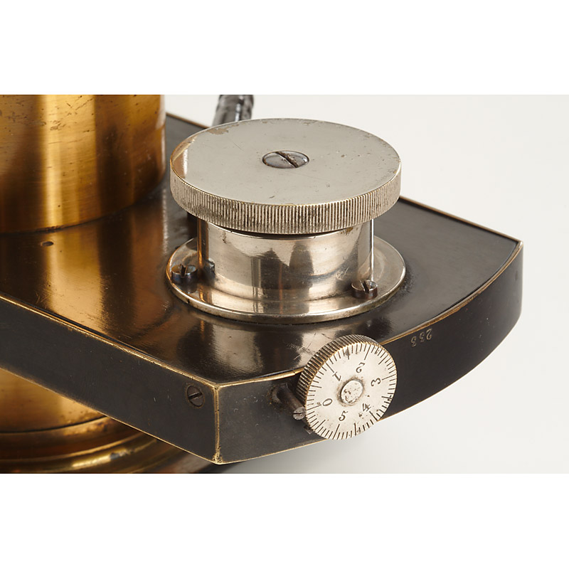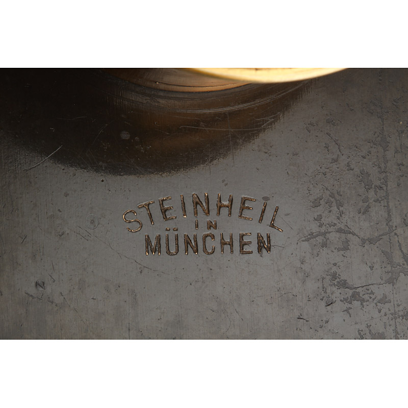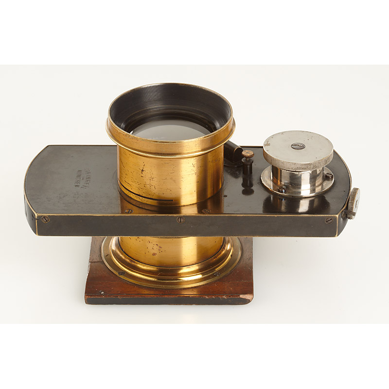 unbranded brass lens in special Steinheil shutter (slow but working) with mounting ring on wooden lens board, cap, height: 10cm, lens diameter: c.5cm