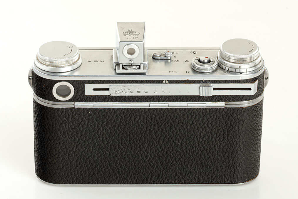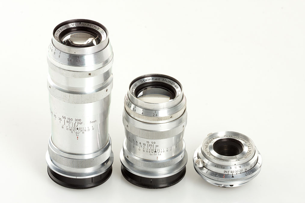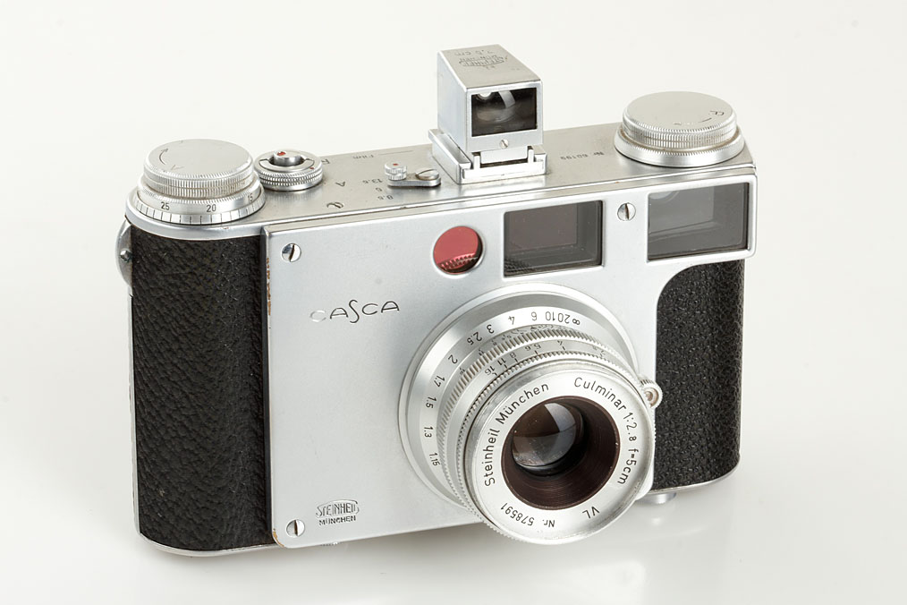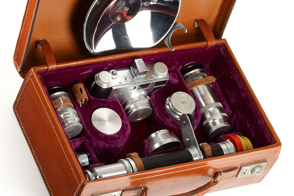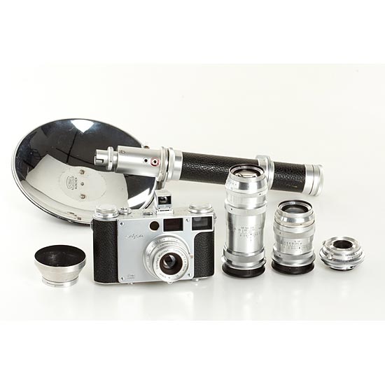 very early Casca II in very fine working condition with rare 4.5/3.5cm Orthostigmat no.572396, Culminar 2.8/50mm no.578591, 35mm Steinheil finder, Culminar VL 2.8/8.5cm no.572391, Culminar VL 4.5/13.5cm no.561749, original flash, 3 Cenei filters, all lenses with caps, all in fitted leather outfit case