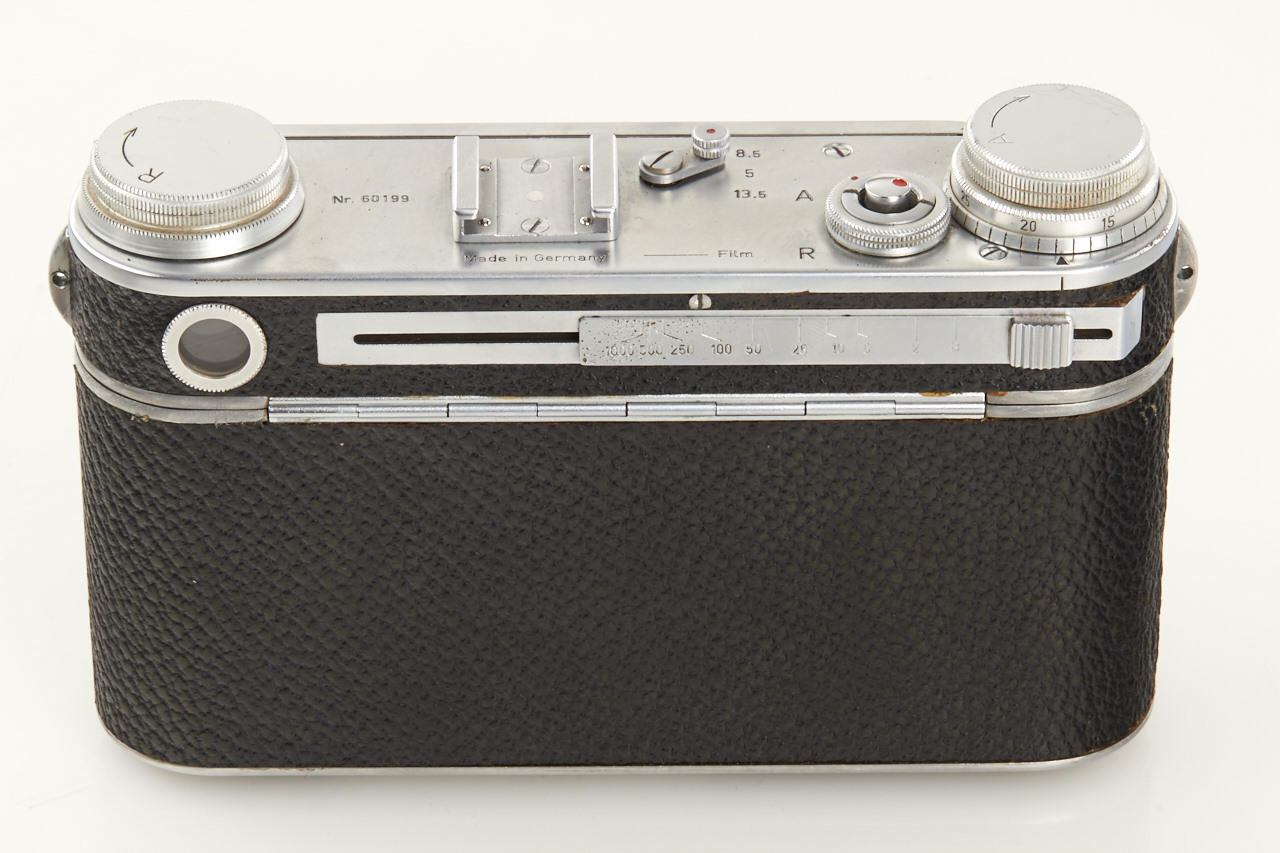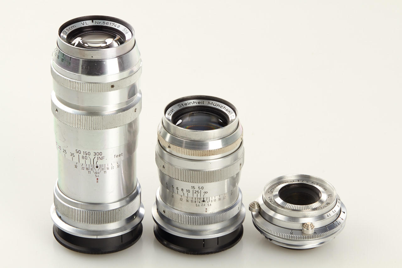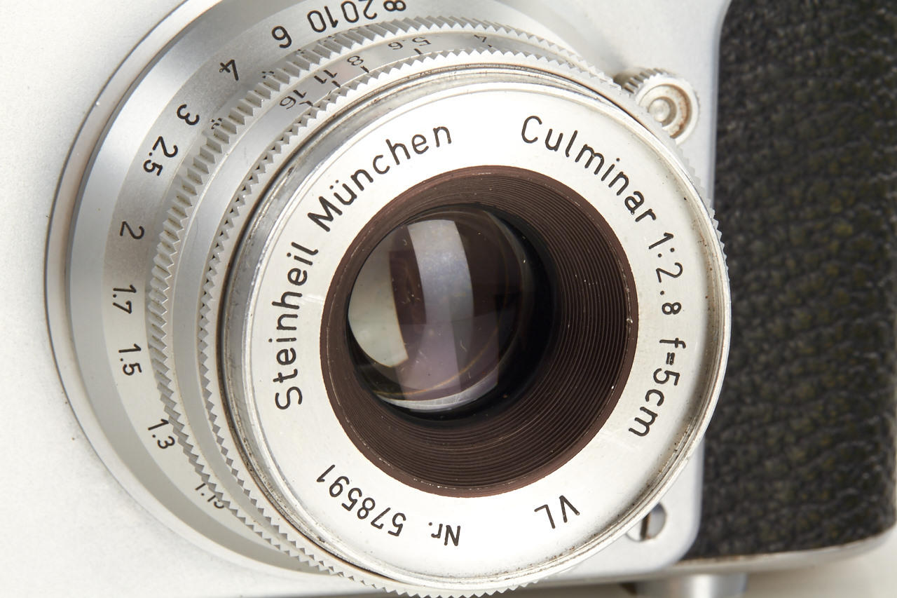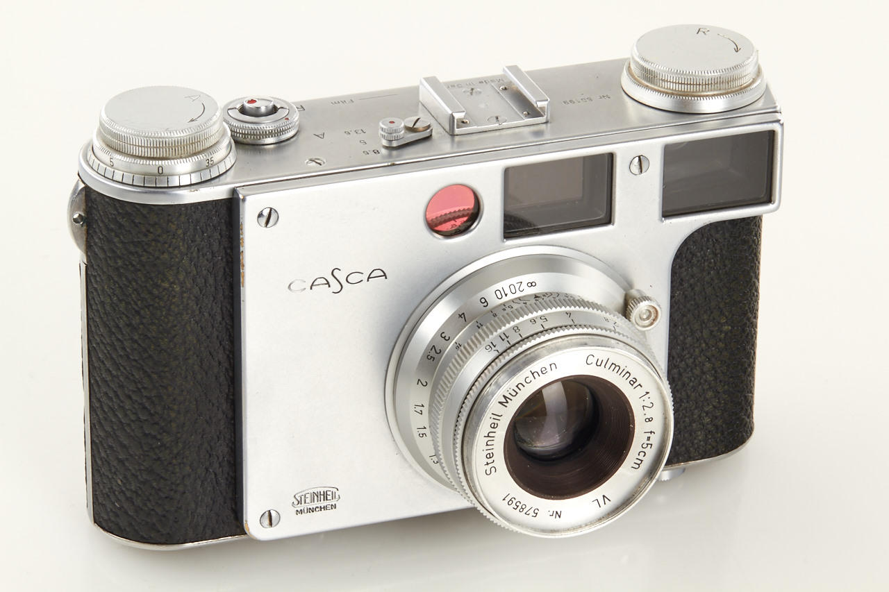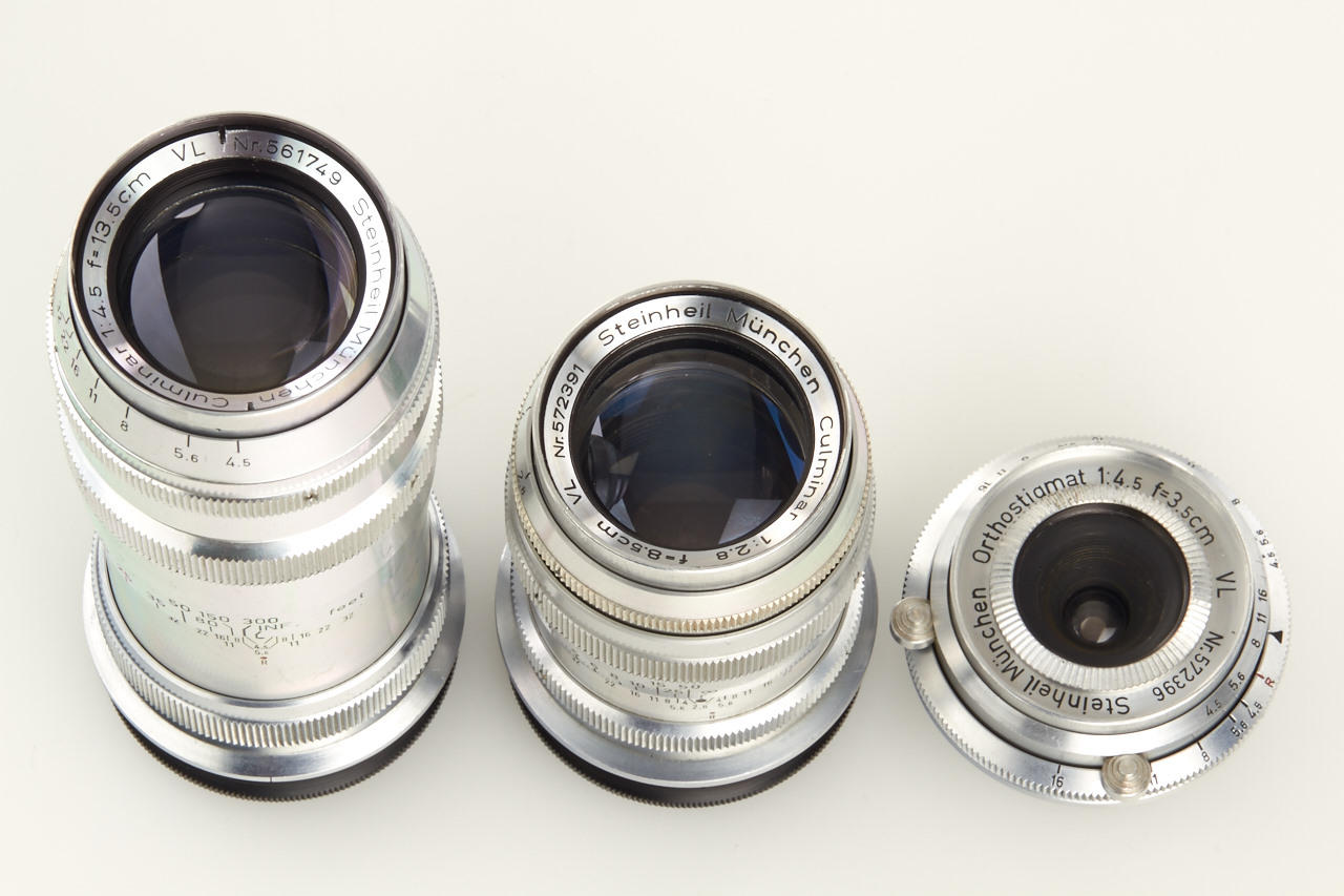 fantastic outfit including very early Casca II in fine working condition with Culminar 2.8/50mm no.578591, rare 4.5/3.5cm Orthostigmat no.572396 including 35mm Steinheil finder, Culminar VL 2.8/8.5cm no.572391, Culminar VL 4.5/13.5cm no.561749, original flash, 3 Cenei filters, all lenses with caps, all in fitted leather outfit case