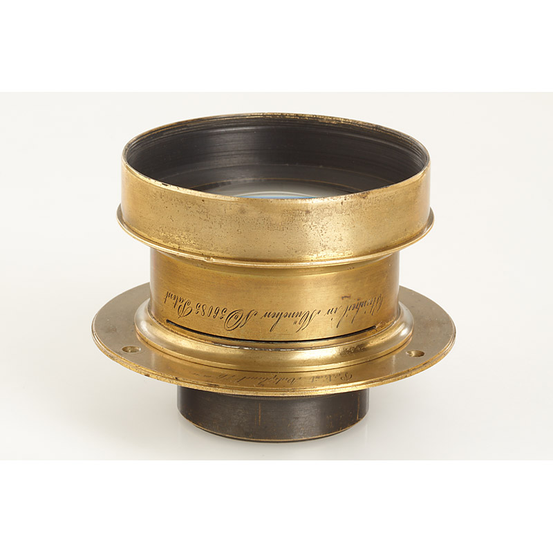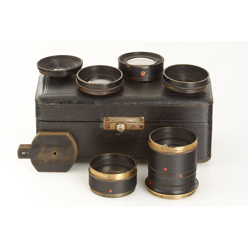 (1) Portrait-Antiplanet 76mm no.36083 with some small marks, approx. focal length 25cm, front lens diameter c.7.5cm, rear lens diameter c.5.5cm, total height incl. hood c.9cm, (2) lens engraved 'Steinheil in München No.5490 Patent', approx. 80cm focal length, lens diameter c.8.5cm, rear lens diameter c. 7cm, mounting ring, total height c.18.5cm, (3) Steinheil casket set complete with 6 lenses (14-40cm focal length depending on combination) and 8 waterhouse stops, all in fitted case (3)