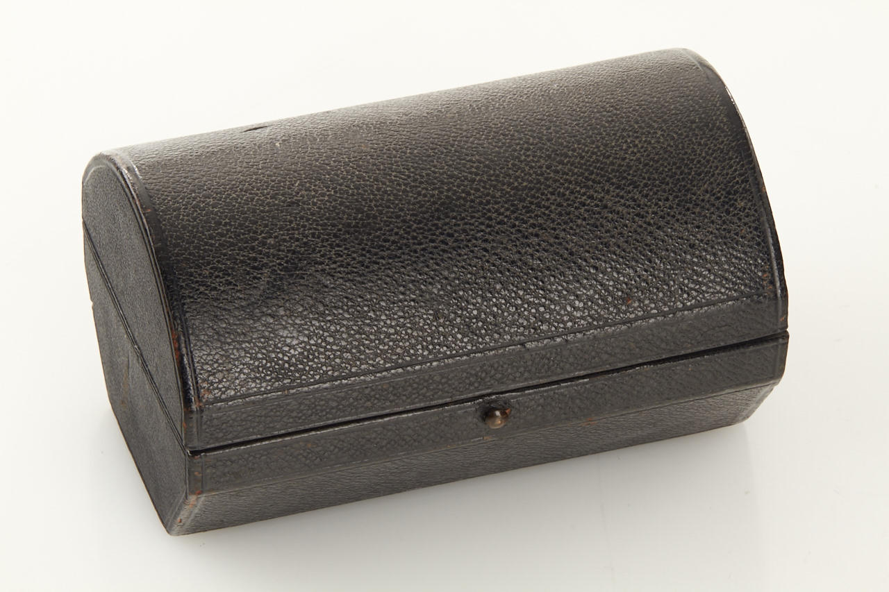 combination lens with one front element and two rear elements, barrel with iris diaphragm (early German aperture scale in mm), in good condition, with original yellow filter and leather-covered Steinheil case
