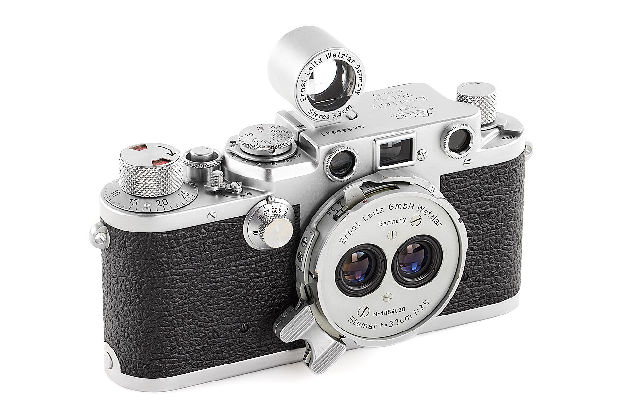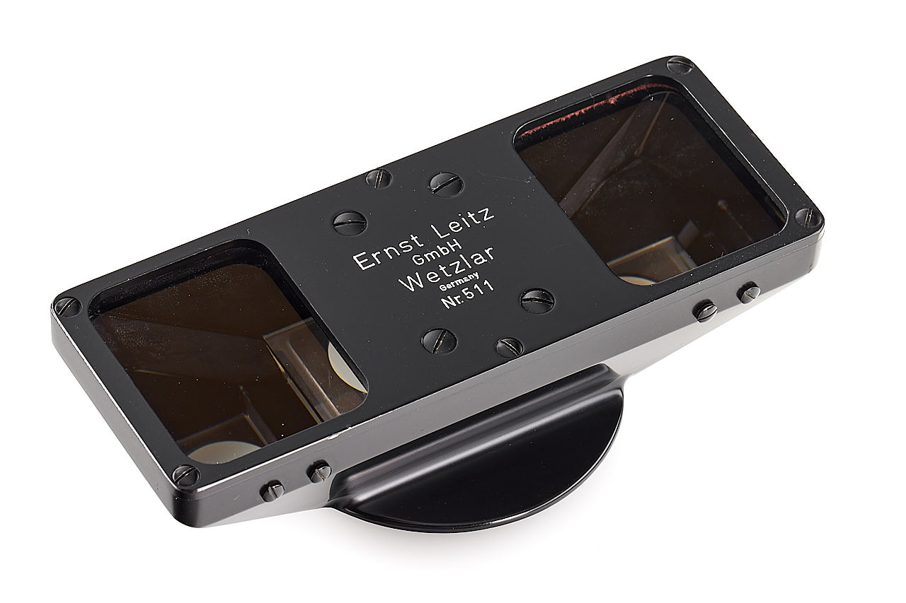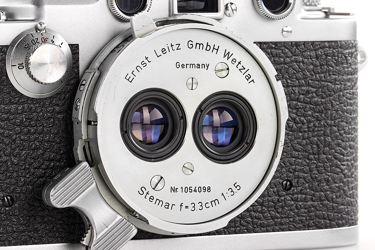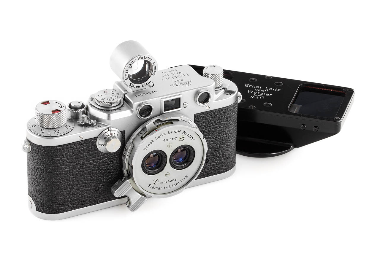 In 1953 Leitz Wetzlar produced a small number of 3.3cm stereo lenses and accessories, all within nos.10554001-1054100, this outfit is in perfect near mint condition and includes Wetzlar Stemar 3.5/3.3cm no.1054098, Wetzlar prism no.511, Ernst Leitz Wetzlar prototype 3.3cm stereo finder - all in fine condition and clean lenses with Leica IIIf no.568541.