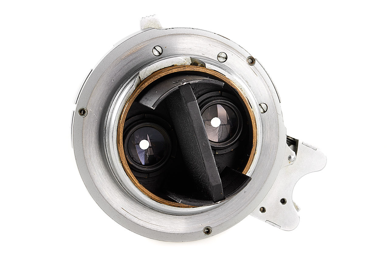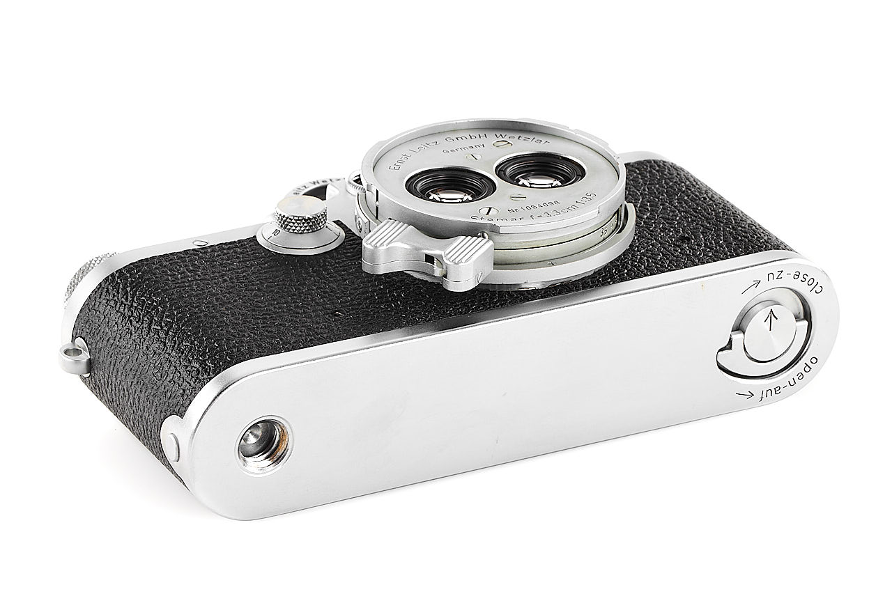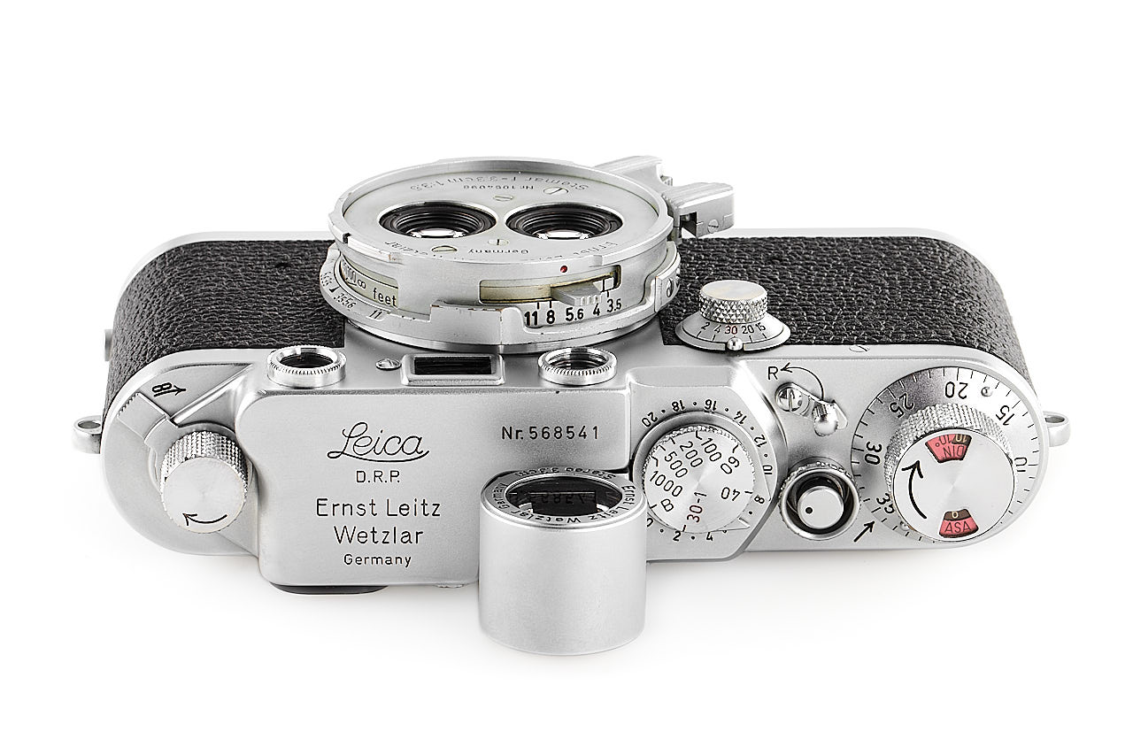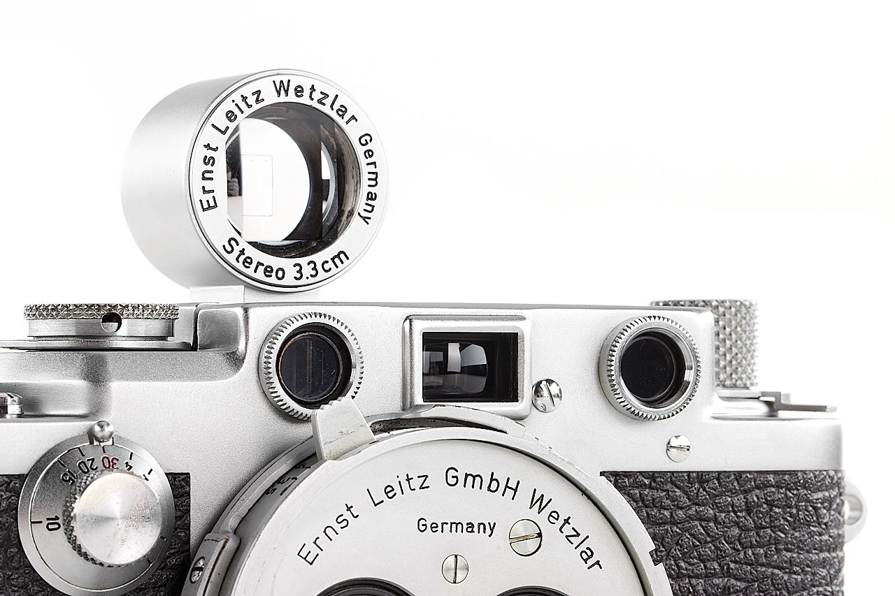 In 1953 Leitz Wetzlar produced a small number of 3.3cm stereo lenses and accessories, all within nos.10554001-1054100, this outfit is in perfect near mint condition and includes Wetzlar Stemar 3.5/3.3cm no.1054098, Wetzlar prism no.511, Ernst Leitz Wetzlar prototype 3.3cm stereo finder - all in fine condition and clean lenses with Leica IIIf no.568541.