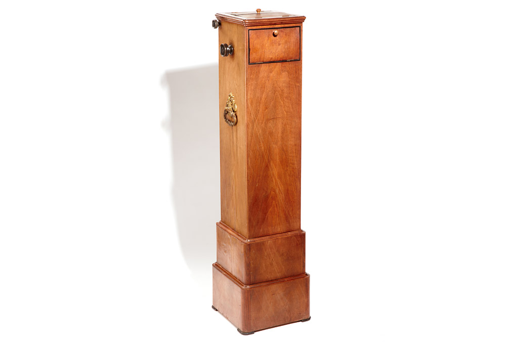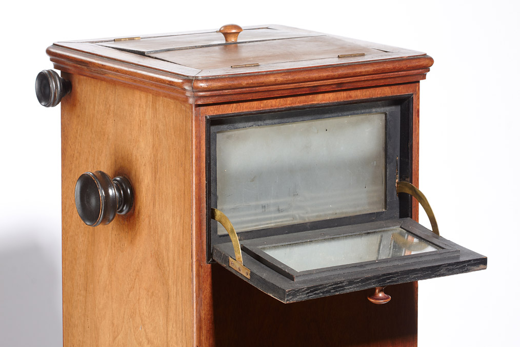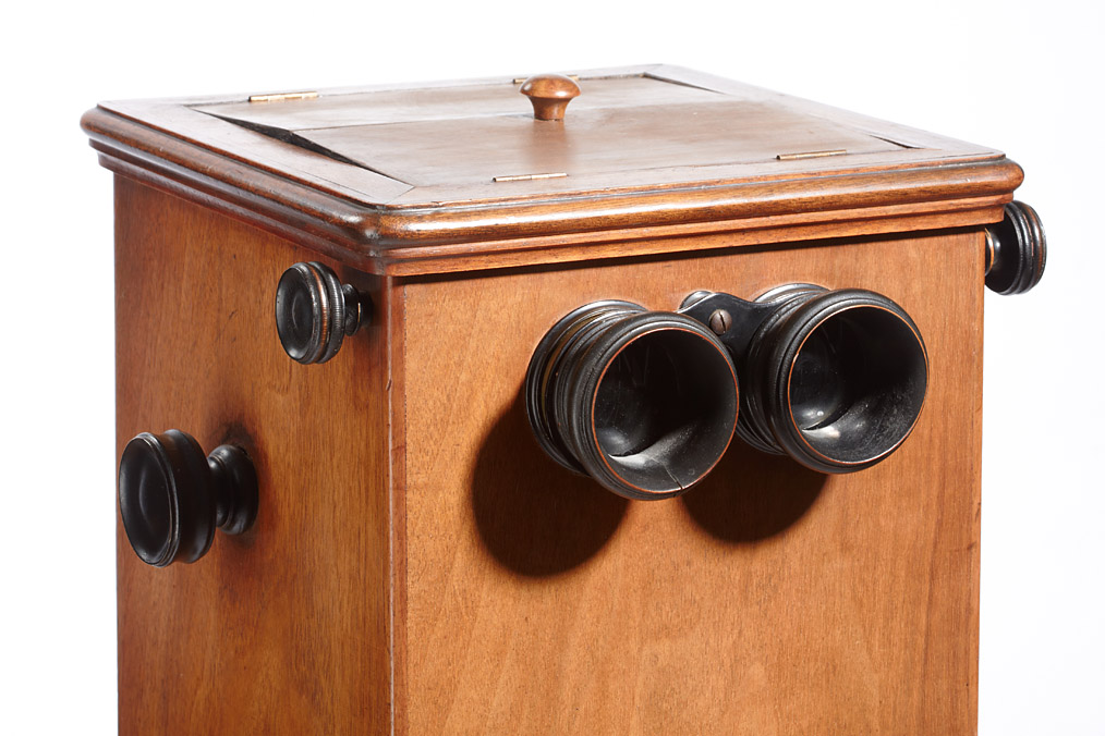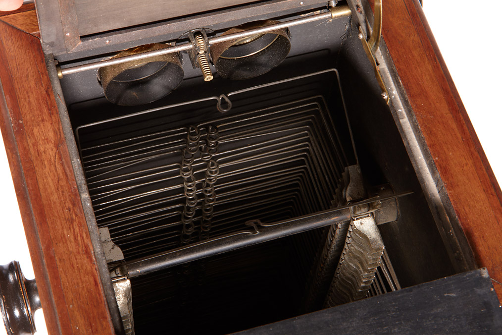 attractive French stereo viewer for over 200 9x18cm cards or slides, the floor-mounted wooden body is 120cm high, adjustable eye-pieces, very fine brass handles. The chain driven mechanism works properly although a complete filling with glass plates might make it too heavy to be operated.