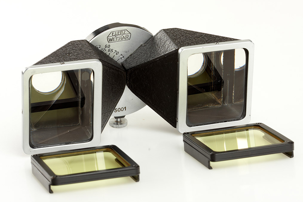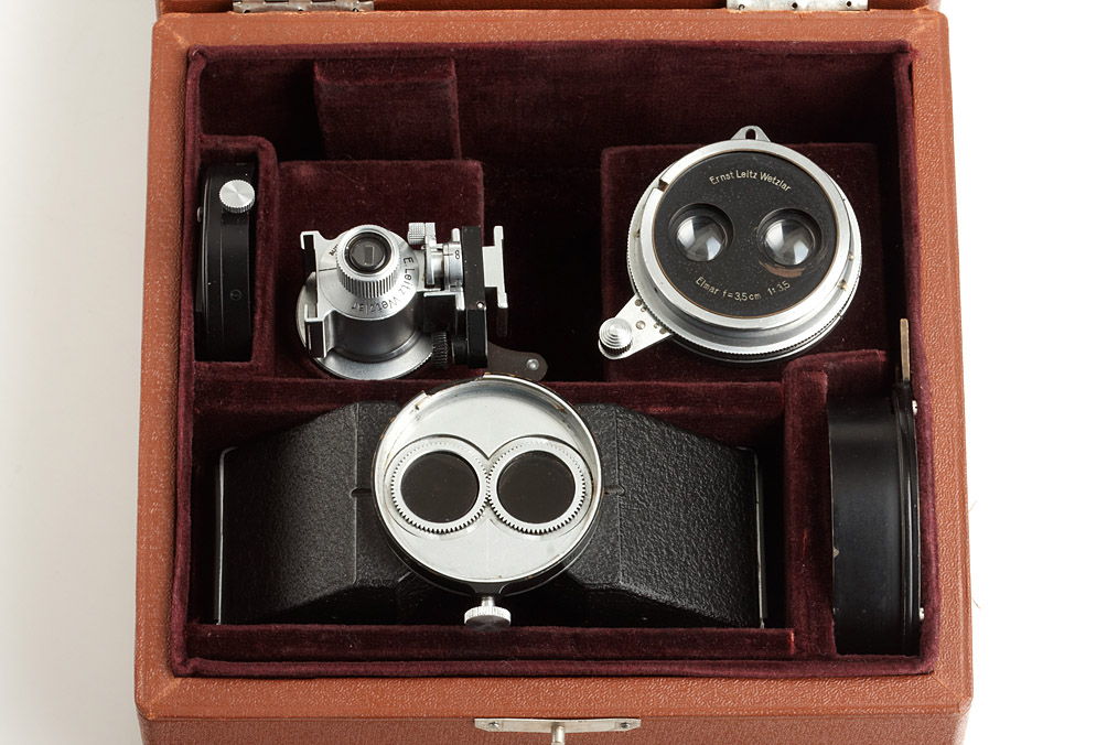 the first pre-war outfit produced including un-numbered Stereo Elmar OWENO 3.5/3.5cm, the very first OTEMO prism no.5001, original yellow filters, special Vidom stereo finder, polarizing filter OVUTO, condenser, all in matching outfit case. This outfit and its accessories are illustrated in Lager Vol.III pages 278, 279, 280, 282 - ex Leica Museum, the most important Stereo outfit by Leitz !