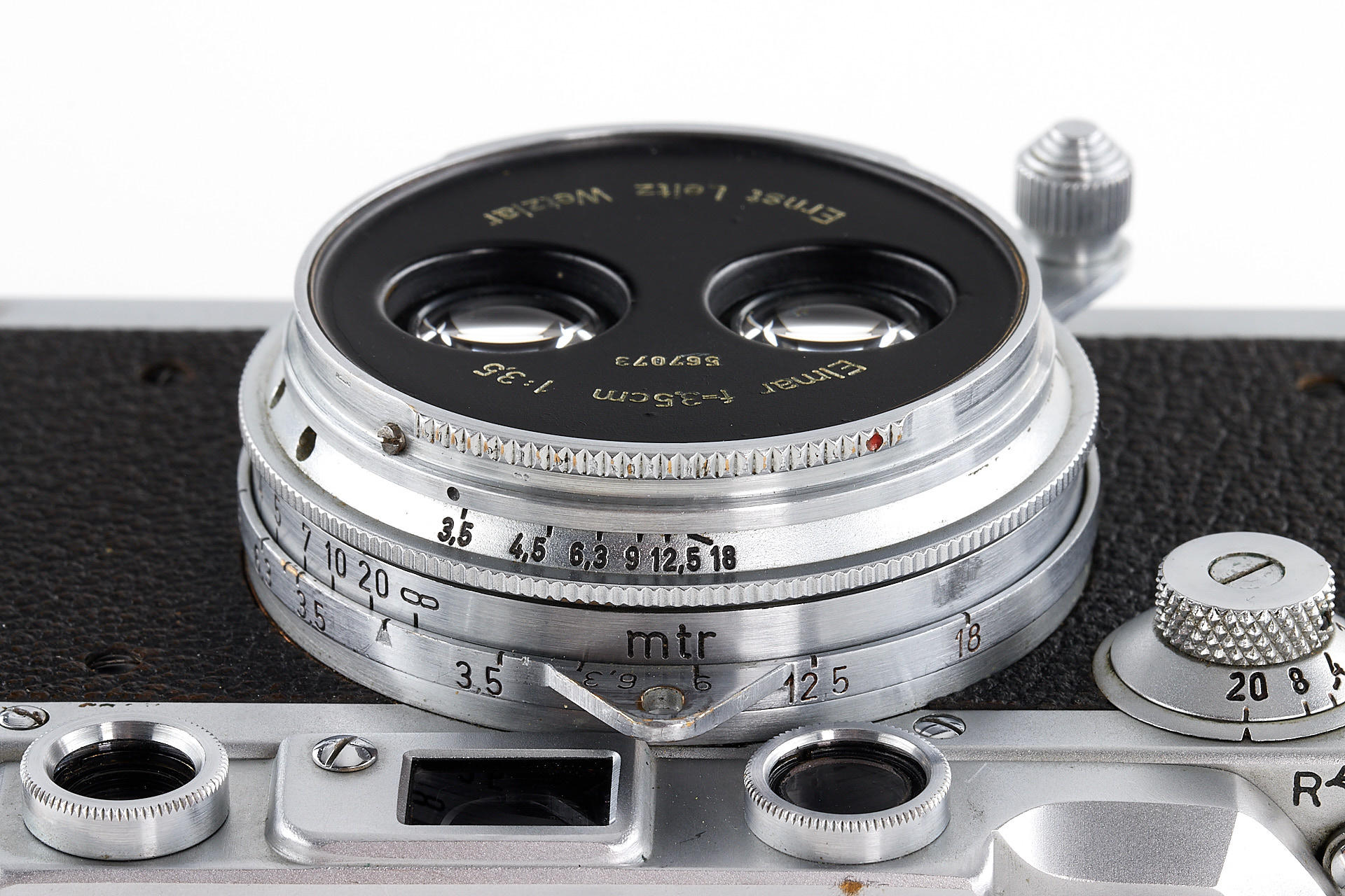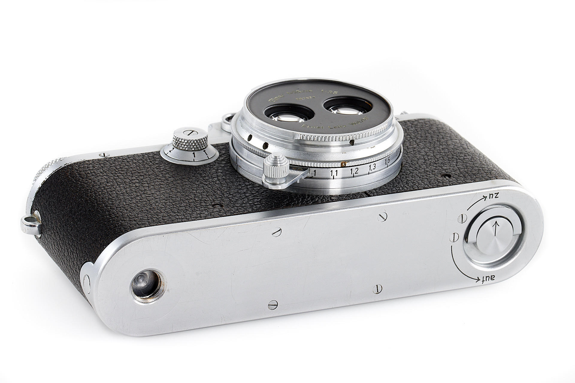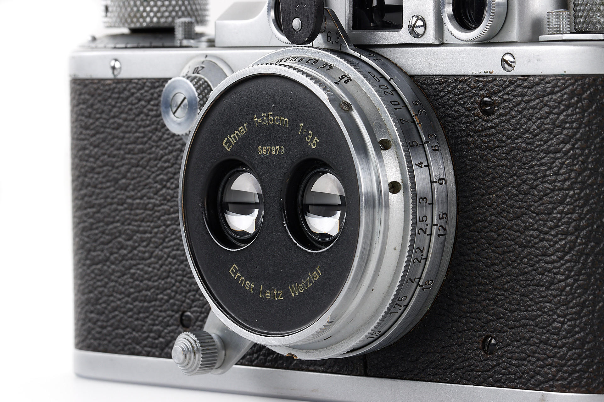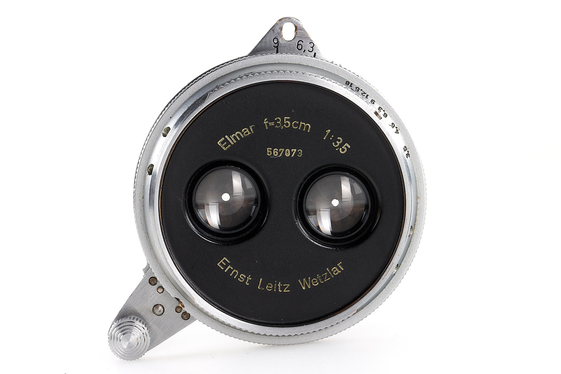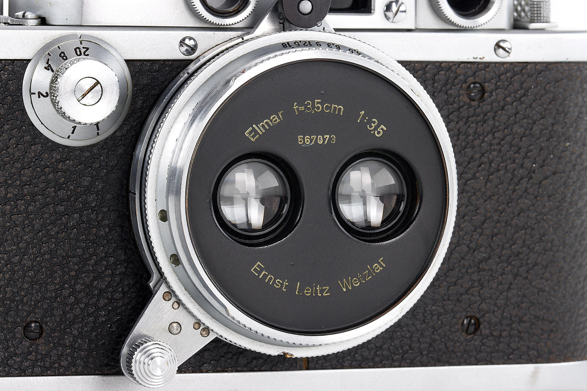 extremely rare pre-war stereo lens, from the second batch made in 1941, in near-mint condition and working order, with stereo VIDOM finder with arm for centring the lens, and Leica IIIb body no.345843. Only 89 of Stereo-Elmar lenses have been made in 1940/41, only a few survived in such good condition.