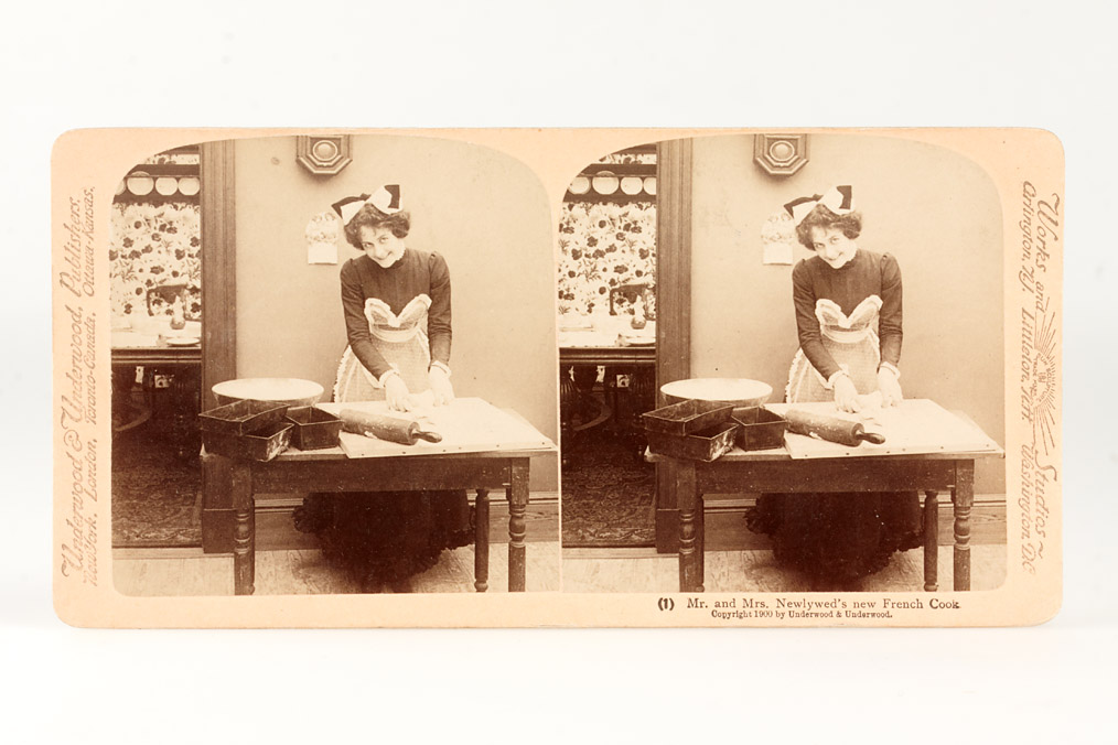 two corresponding sets of ten original cards in each set, one by Keystone the other one by Underwood and Underwood. In both sets the same tale of a marriage crisis caused by a new French cook is told - the only difference is the decor and the performers. Although some cards are missing (17 in total), this is a wonderful example of the American stereo production around 1900. The connection between the narration in these pictures and early cinema is still waiting for further research.(20)
