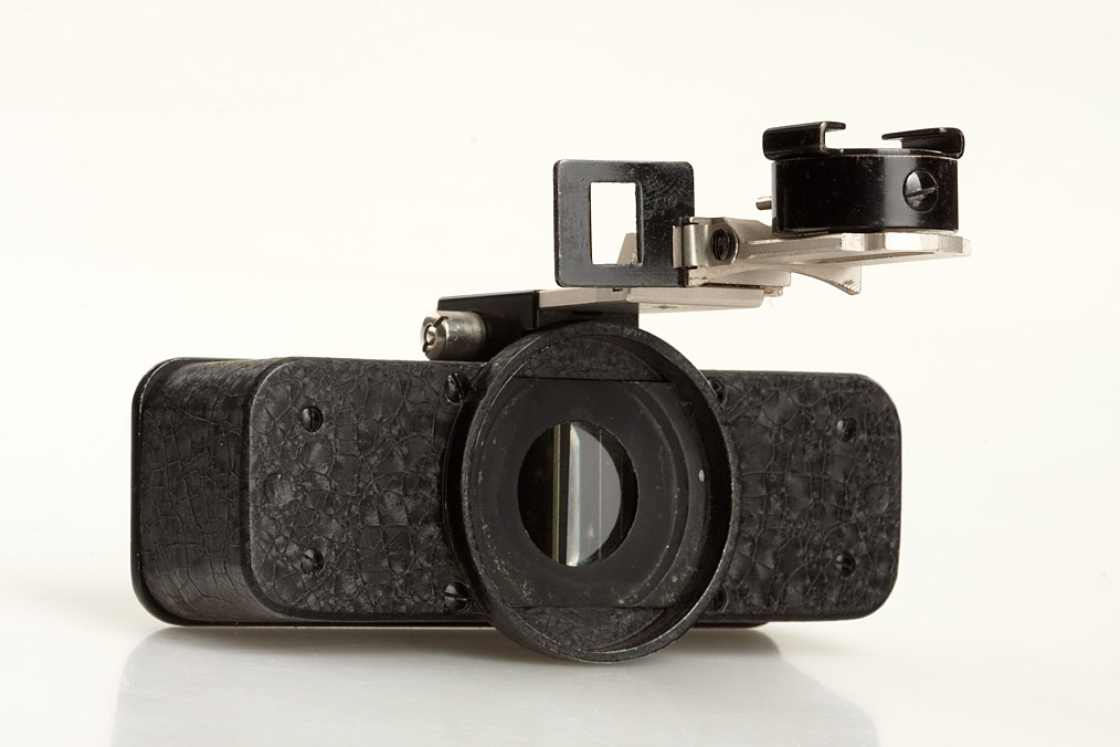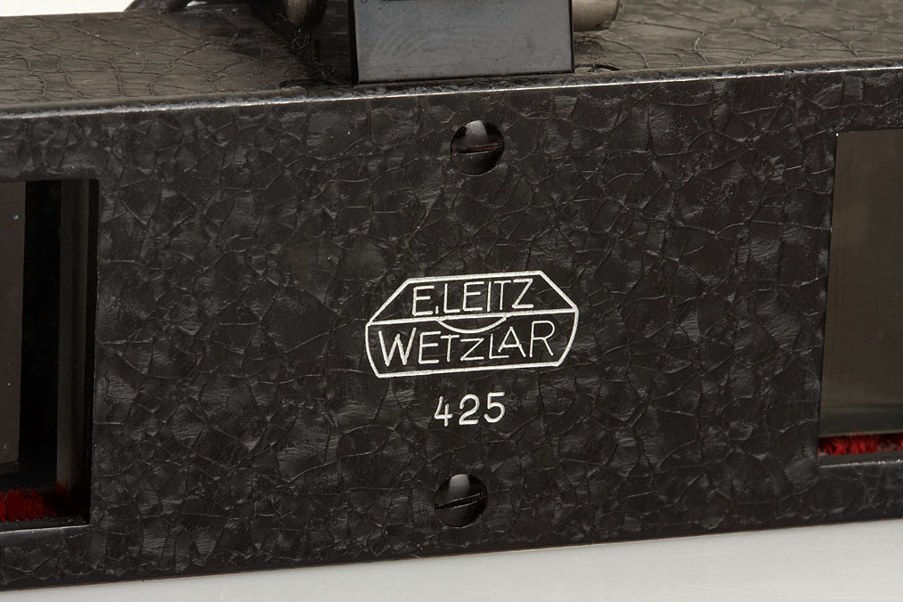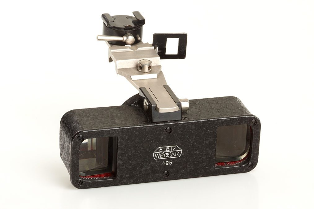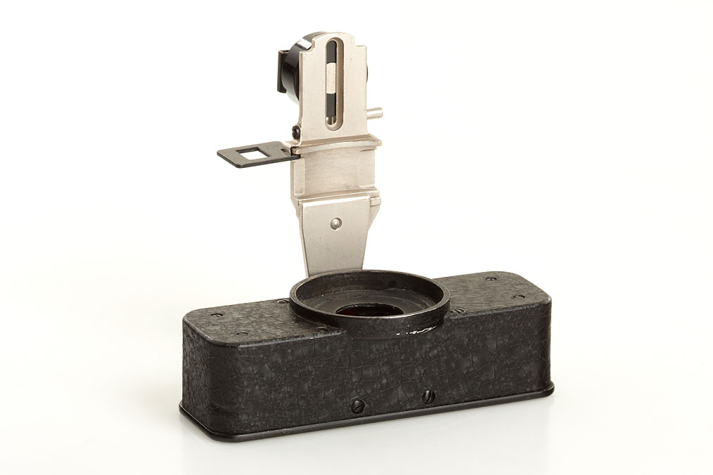 early first version Stereoly attachment with nickel arm and mask for Leica I or Standard, in excellent condition with case and maker's box