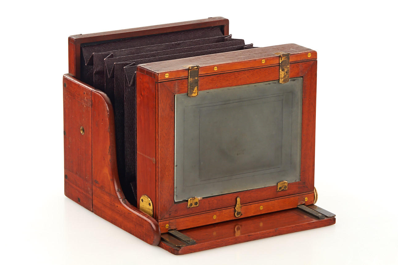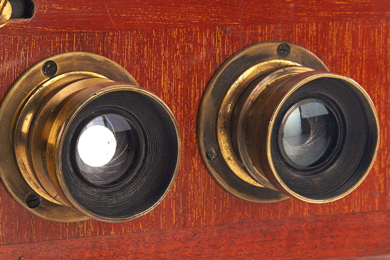 mahogany stereo camera for 6.5x5" exposures, in very fine condition, one setting screw on front missing, original bellows, dual Goerz Anastigmat Serie III 150mm lenses nos.19927/19560