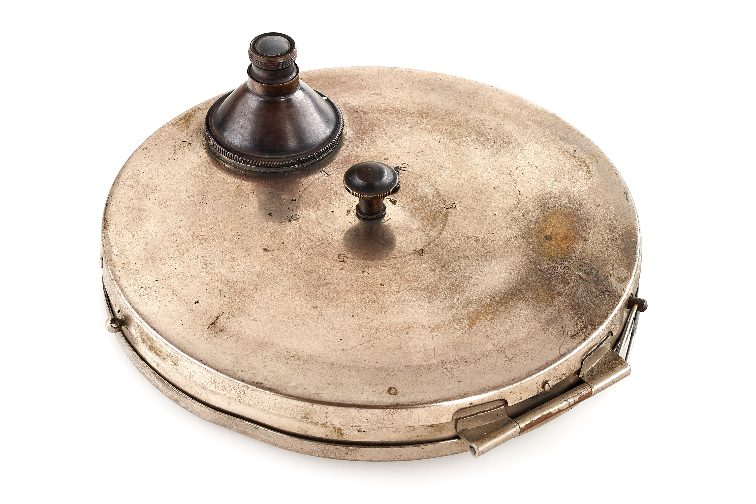 Rare round metal detective camera for 6 exposures 4x4cm on round glass plates, in used condition and working order, showing some signs of corrosion, film plates holder and some other parts missing.