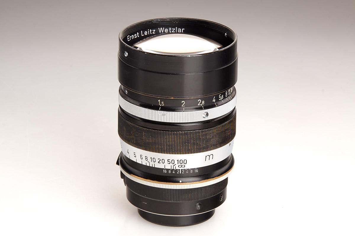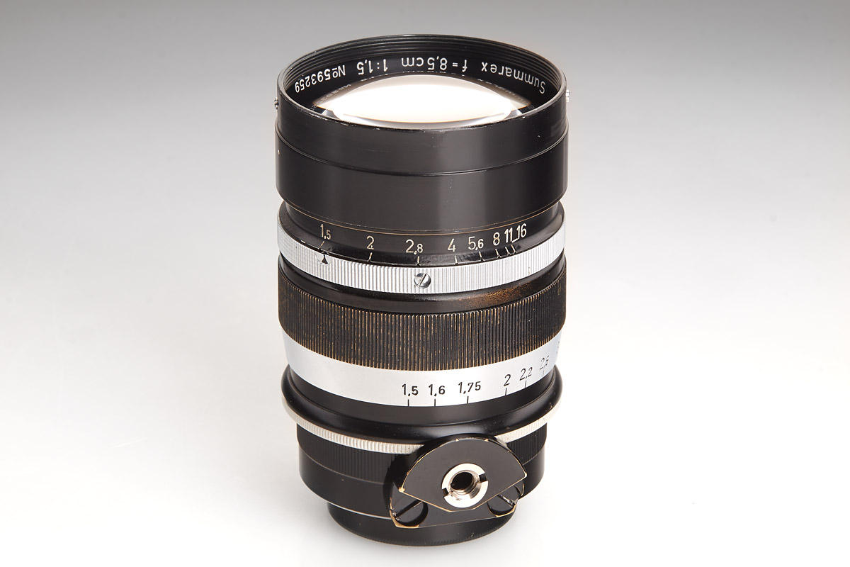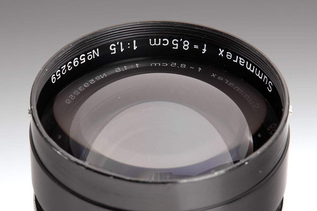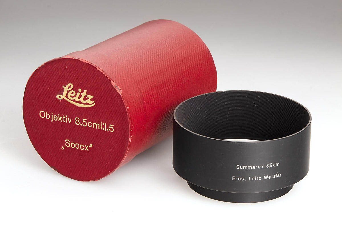 Original black paint Summarex in fantastic condition with clean optics. Complete with both caps (aluminum front cap), original black aluminum hood engraved “Summarex 8,5 cm Ernst Leitz Wetzlar”, red maker’s box marked: “Leitz Objektiv 8,5 cm 1:1,5 Soocx”. LITERATURE James L. Lager (ed.), Leica Illustrated History, Vol. II, 1994, p. 68-71; Dennis Laney (ed.), Leica Collectors Guide, 2nd. Ed., 2005, p. 249-250. The Summarex was the first high speed medium focal length lens for the Leica. It was a complicated, 7-element design in 5 groups with a maximum aperture of f/1.5. Earliest samples of that new lens were prepared in 1941 and still are named “9 cm Summar”. First lenses of the 8.5 cm Summarex were delivered in 1943 for military applications. Early experiments with lens coatings also included those wartime Summarex. Finally, the Summarex was commercially introduced to the civilian market in 1949 under catalogue code SOOCX. From the beginning, lenses so far produced were finished in black paint. Within the same year and first serial number batch, however, the finish was then changed to silver chrome. The total number of black Summarex lenses produced was less than 300. Therefore, today it is difficult to find a black paint Summarex in original and clean condition. Interestingly, the change from black to chrome finish also included a re-design of the large sunshade supplied with the lens, as well as of the cap. Accessories from the later chrome finish version cannot be used with the early black lenses, and so a black Summarex lens with its original accessories is extremely scarce. The Summarex remained in the Leitz catalogue until as late as 1962, after a total production of only 4,342 pieces. Das Summarex war das erste hochlichtstarke Objektiv mittlerer Brennweite zur Leica. Es handelte sich um einen komplizierten, 7-linsigen Aufbau in 5 Gruppen mit einer Lichtstärke von 1:1,5. Früheste Muster zu diesem neuen Objektiv waren noch mit „Summar 9 cm“ bezeichnet. Die ersten Summarex 8,5 cm Objektive wurden im Jahr 1943 an militärische Dienststellen ausgeliefert. Die Summerex Objektive waren zu dieser Zeit bereits Bestandteil von Versuchsreihen für eine Vergütung der Linsen. Auf dem zivilen Markt wurde das Summarex schließlich im Jahr 1949 unter dem Katalognamen SOOCX eingeführt. Objektive, die seit Beginn bis dato produziert waren, hatten eine schwarz lackierte Fassung. Noch im selben Jahr wurden innerhalb des ersten Seriennummernkreises die Summarex Objektive auf eine Version in silbern verchromter Ausführung umgestellt. Insgesamt sind von dem schwarzen Summarex weniger als 300 Exemplare hergestellt worden. So ist es heute recht schwierig, ein original schwarz lackiertes Summarex in guter Erhaltung zu finden. Mit der Umstellung von schwarz auf chrom wurden interessanterweise auch die mit dem Objektiv gelieferte große Sonnenblende und der Frontdeckel umkonstruiert. Diese Zubehörteile der späteren verchromten Version können daher an den frühen schwarzen Objektiven nicht verwendet werden. Ein komplett schwarzes Summarex mit den originalen Zubehörteilen ist daher extrem rar. Das Summarex wurde nach einer Gesamtproduktionszahl von nur 4.342 Exemplaren erst im Jahr 1962 eingestellt.