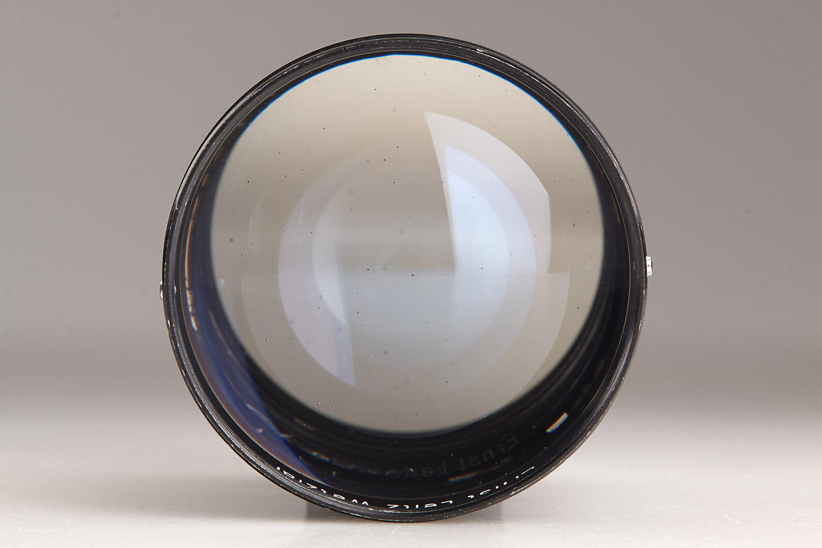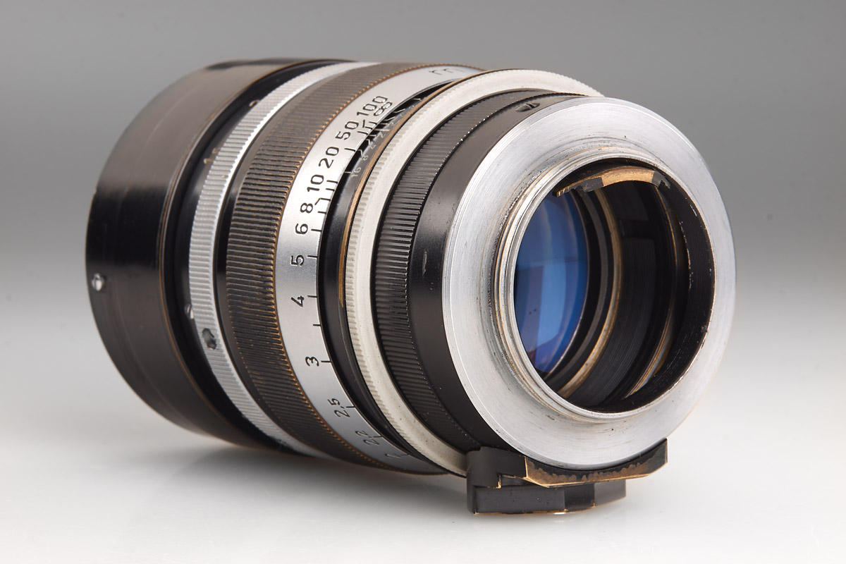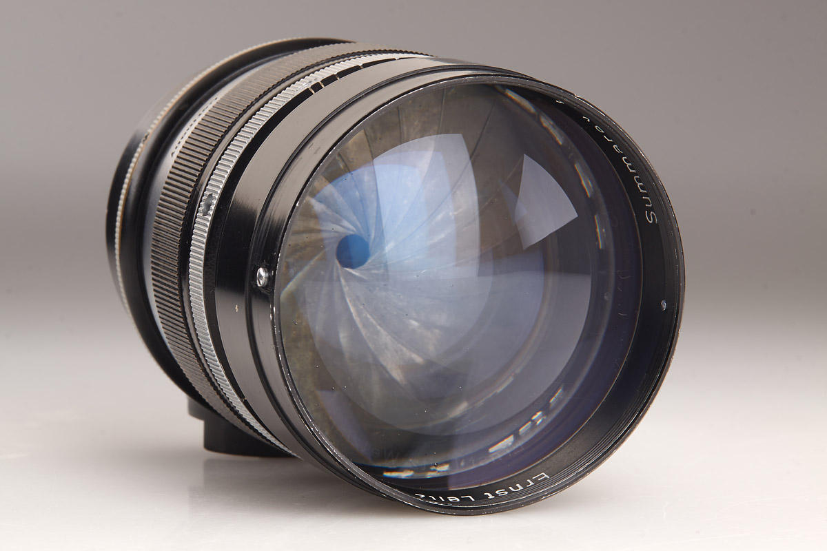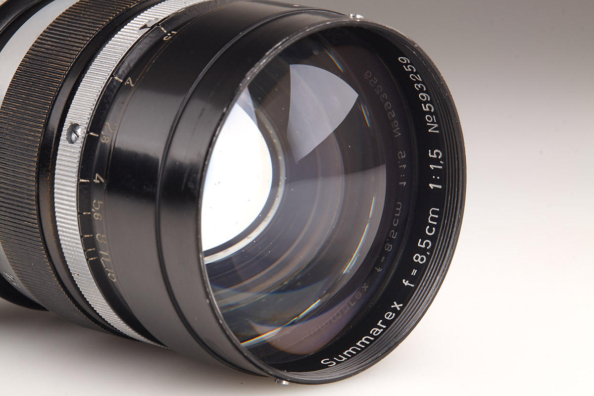 Original black paint Summarex in fantastic condition with clean optics. Complete with both caps (aluminum front cap), original black aluminum hood engraved “Summarex 8,5 cm Ernst Leitz Wetzlar”, red maker’s box marked: “Leitz Objektiv 8,5 cm 1:1,5 Soocx”. LITERATURE James L. Lager (ed.), Leica Illustrated History, Vol. II, 1994, p. 68-71; Dennis Laney (ed.), Leica Collectors Guide, 2nd. Ed., 2005, p. 249-250. The Summarex was the first high speed medium focal length lens for the Leica. It was a complicated, 7-element design in 5 groups with a maximum aperture of f/1.5. Earliest samples of that new lens were prepared in 1941 and still are named “9 cm Summar”. First lenses of the 8.5 cm Summarex were delivered in 1943 for military applications. Early experiments with lens coatings also included those wartime Summarex. Finally, the Summarex was commercially introduced to the civilian market in 1949 under catalogue code SOOCX. From the beginning, lenses so far produced were finished in black paint. Within the same year and first serial number batch, however, the finish was then changed to silver chrome. The total number of black Summarex lenses produced was less than 300. Therefore, today it is difficult to find a black paint Summarex in original and clean condition. Interestingly, the change from black to chrome finish also included a re-design of the large sunshade supplied with the lens, as well as of the cap. Accessories from the later chrome finish version cannot be used with the early black lenses, and so a black Summarex lens with its original accessories is extremely scarce. The Summarex remained in the Leitz catalogue until as late as 1962, after a total production of only 4,342 pieces. Das Summarex war das erste hochlichtstarke Objektiv mittlerer Brennweite zur Leica. Es handelte sich um einen komplizierten, 7-linsigen Aufbau in 5 Gruppen mit einer Lichtstärke von 1:1,5. Früheste Muster zu diesem neuen Objektiv waren noch mit „Summar 9 cm“ bezeichnet. Die ersten Summarex 8,5 cm Objektive wurden im Jahr 1943 an militärische Dienststellen ausgeliefert. Die Summerex Objektive waren zu dieser Zeit bereits Bestandteil von Versuchsreihen für eine Vergütung der Linsen. Auf dem zivilen Markt wurde das Summarex schließlich im Jahr 1949 unter dem Katalognamen SOOCX eingeführt. Objektive, die seit Beginn bis dato produziert waren, hatten eine schwarz lackierte Fassung. Noch im selben Jahr wurden innerhalb des ersten Seriennummernkreises die Summarex Objektive auf eine Version in silbern verchromter Ausführung umgestellt. Insgesamt sind von dem schwarzen Summarex weniger als 300 Exemplare hergestellt worden. So ist es heute recht schwierig, ein original schwarz lackiertes Summarex in guter Erhaltung zu finden. Mit der Umstellung von schwarz auf chrom wurden interessanterweise auch die mit dem Objektiv gelieferte große Sonnenblende und der Frontdeckel umkonstruiert. Diese Zubehörteile der späteren verchromten Version können daher an den frühen schwarzen Objektiven nicht verwendet werden. Ein komplett schwarzes Summarex mit den originalen Zubehörteilen ist daher extrem rar. Das Summarex wurde nach einer Gesamtproduktionszahl von nur 4.342 Exemplaren erst im Jahr 1962 eingestellt.