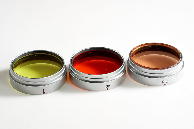 very early lens for M-mount, cap, keeper, XOONS metal hood, 3 bayonet mount filters (Green 1, Red 1, Orange)