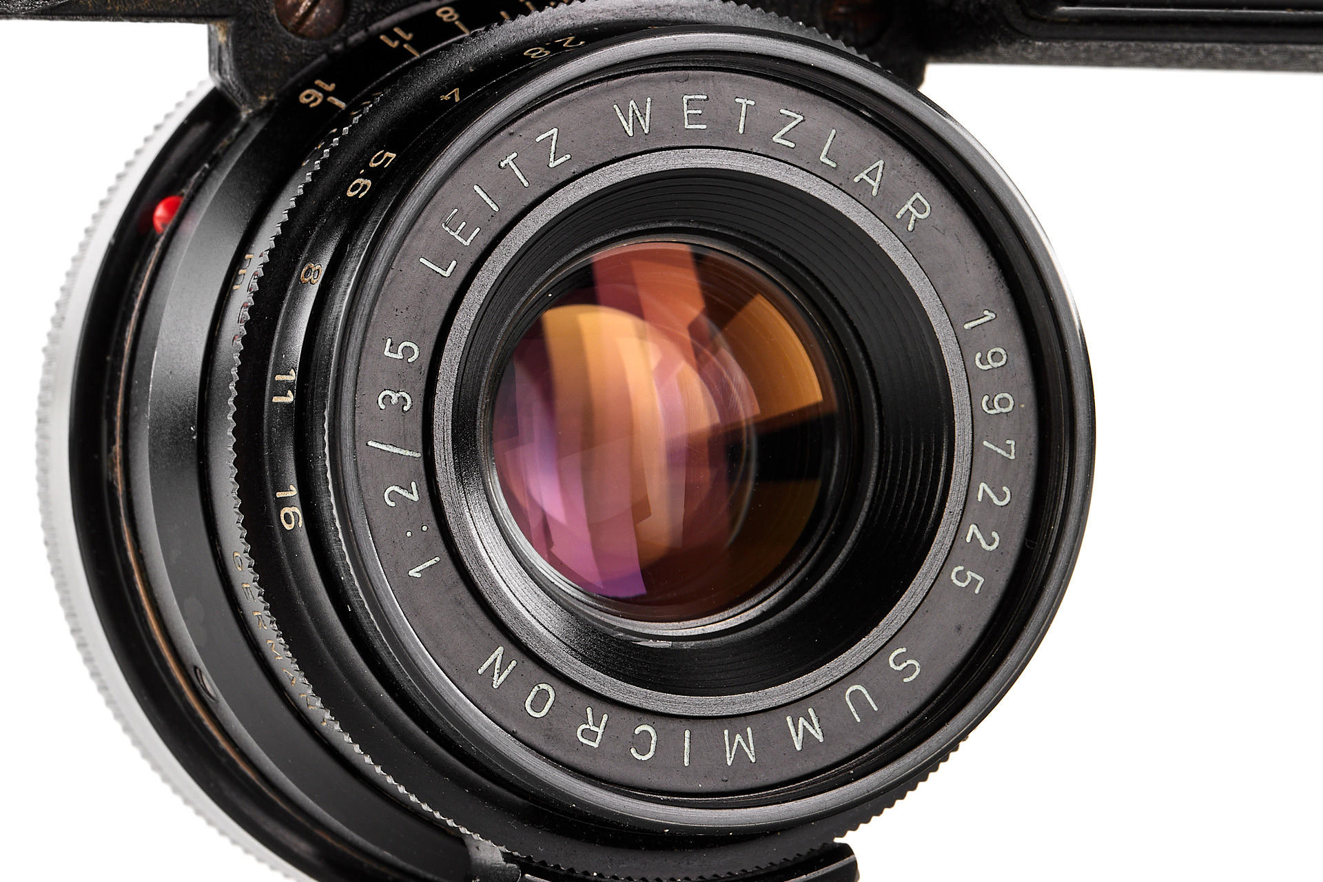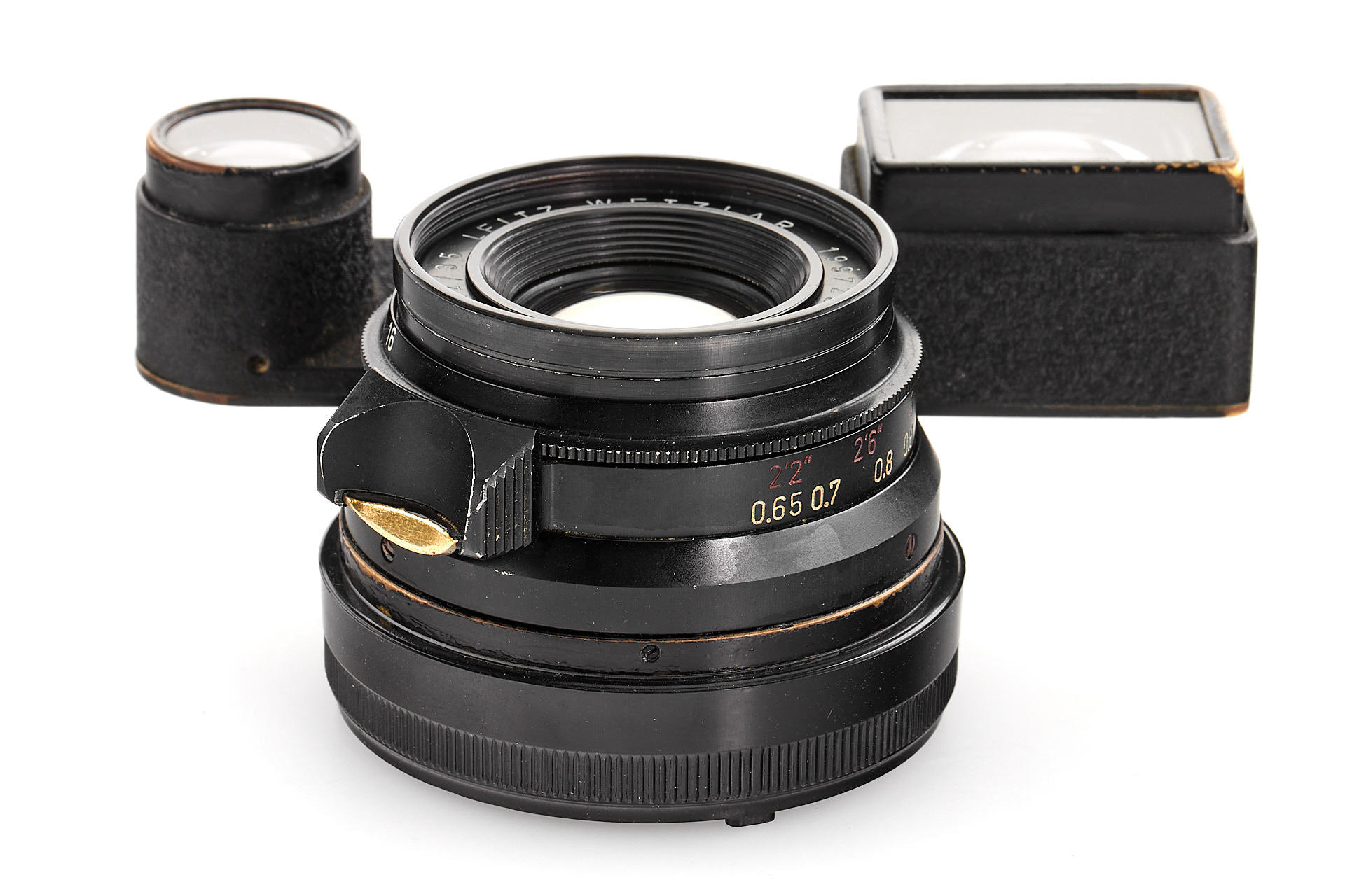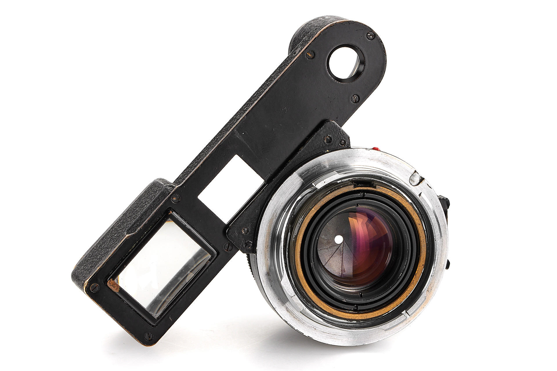 sought-after 8-element Summicron with goggles for M3, with black painted infinity lock, rim around the mount and goggles, very good optics with only a few hairline marks, delivered to Manca, New York on 17.03.1965