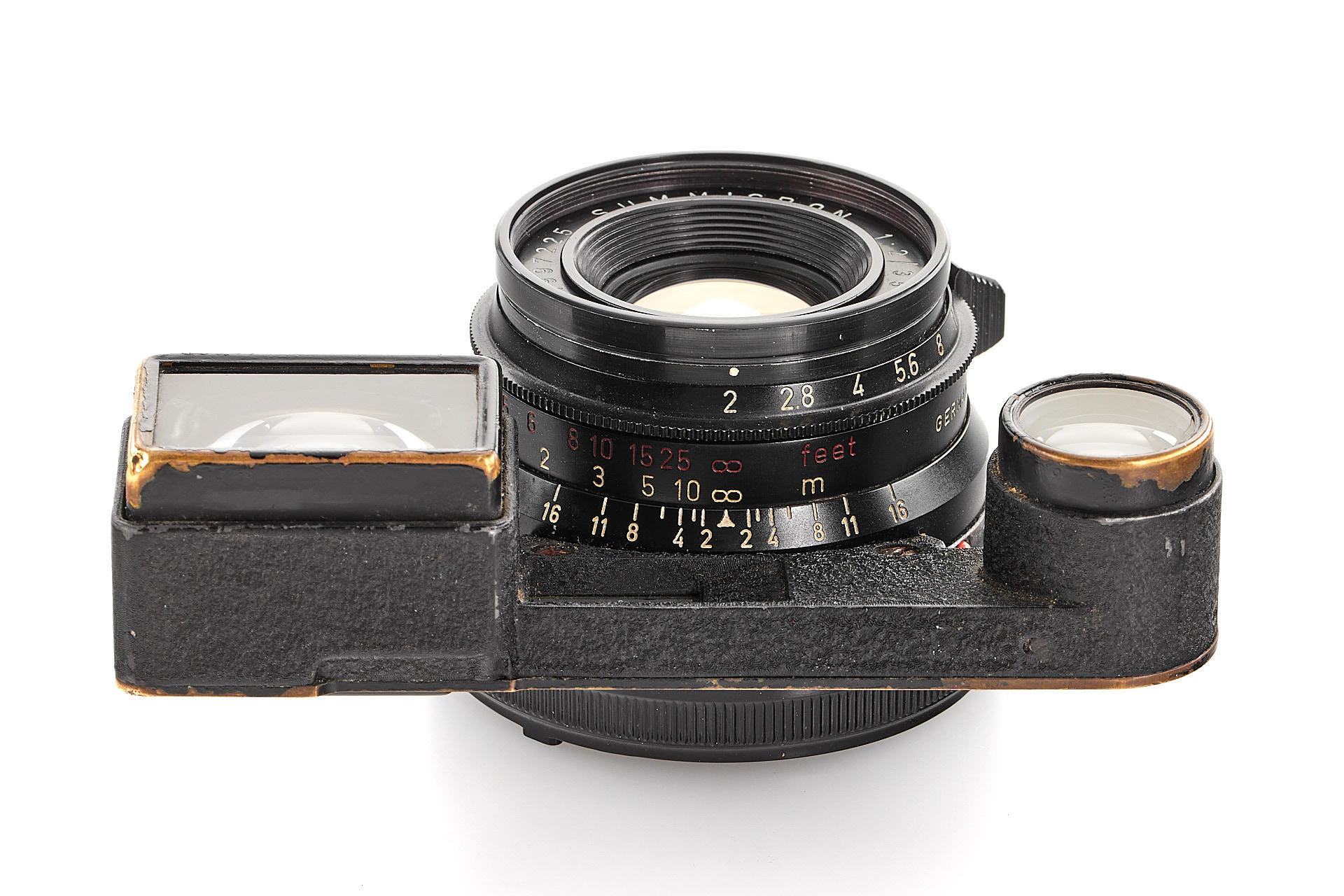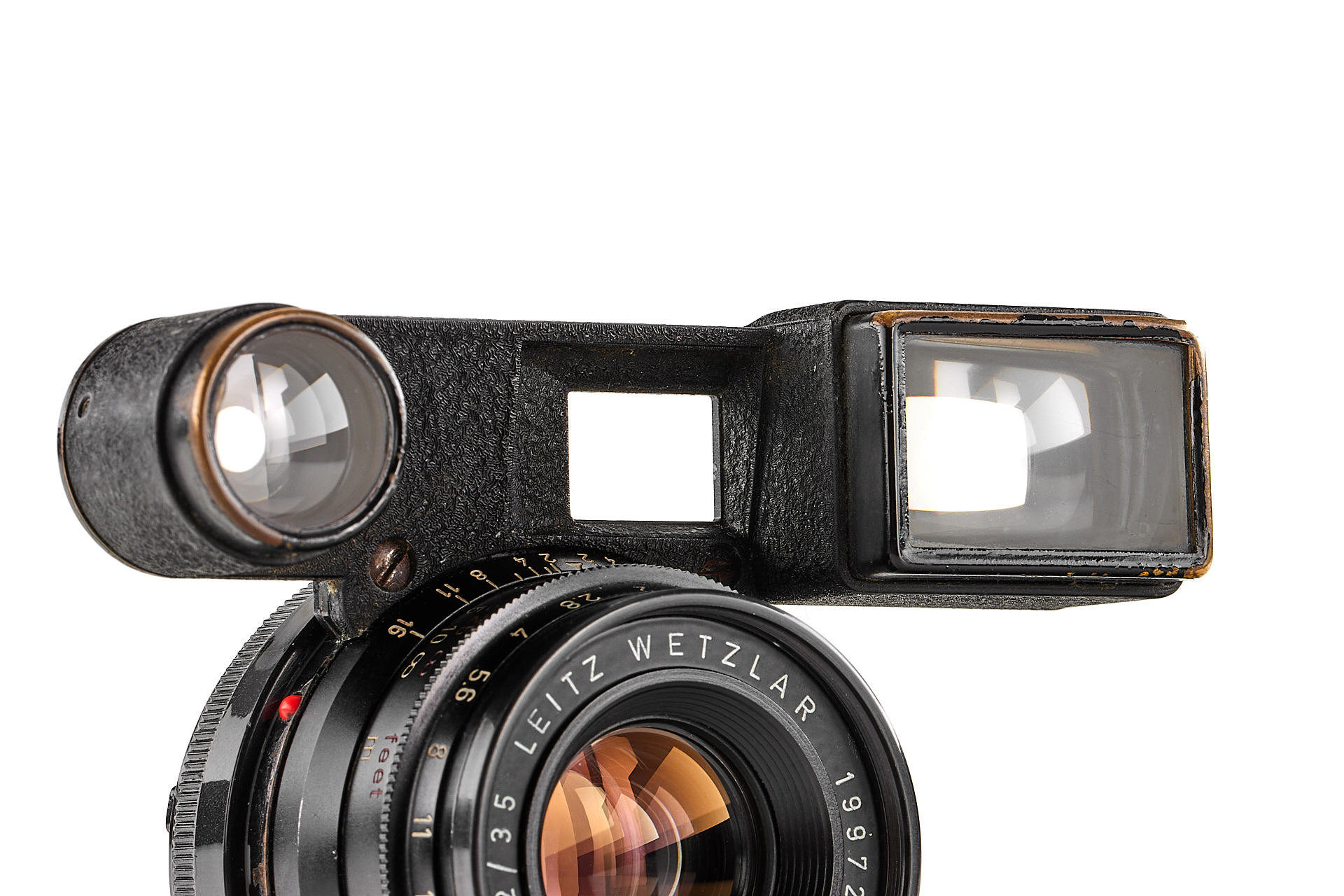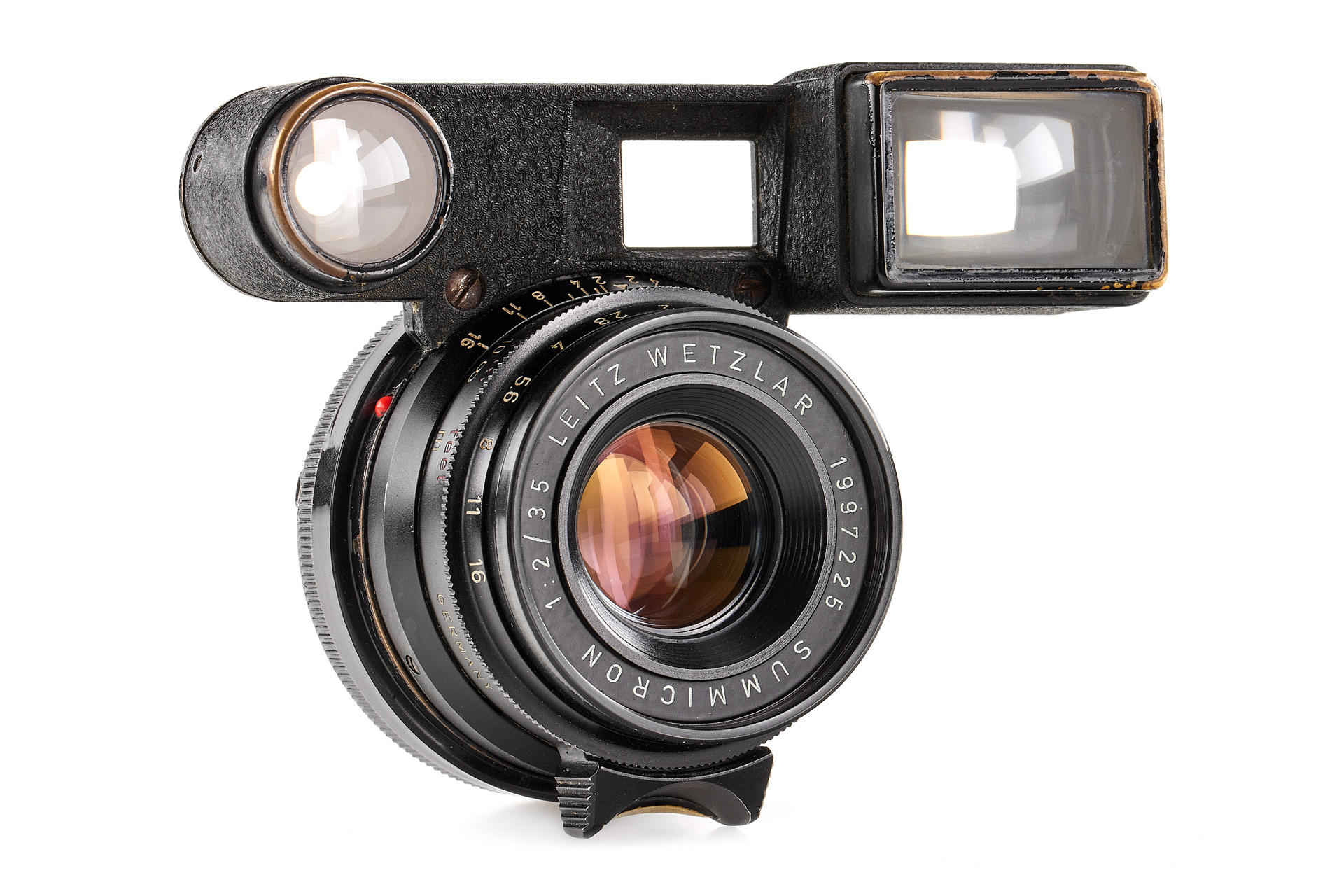 sought-after 8-element Summicron with goggles for M3, with black painted infinity lock, rim around the mount and goggles, very good optics with only a few hairline marks, delivered to Manca, New York on 17.03.1965