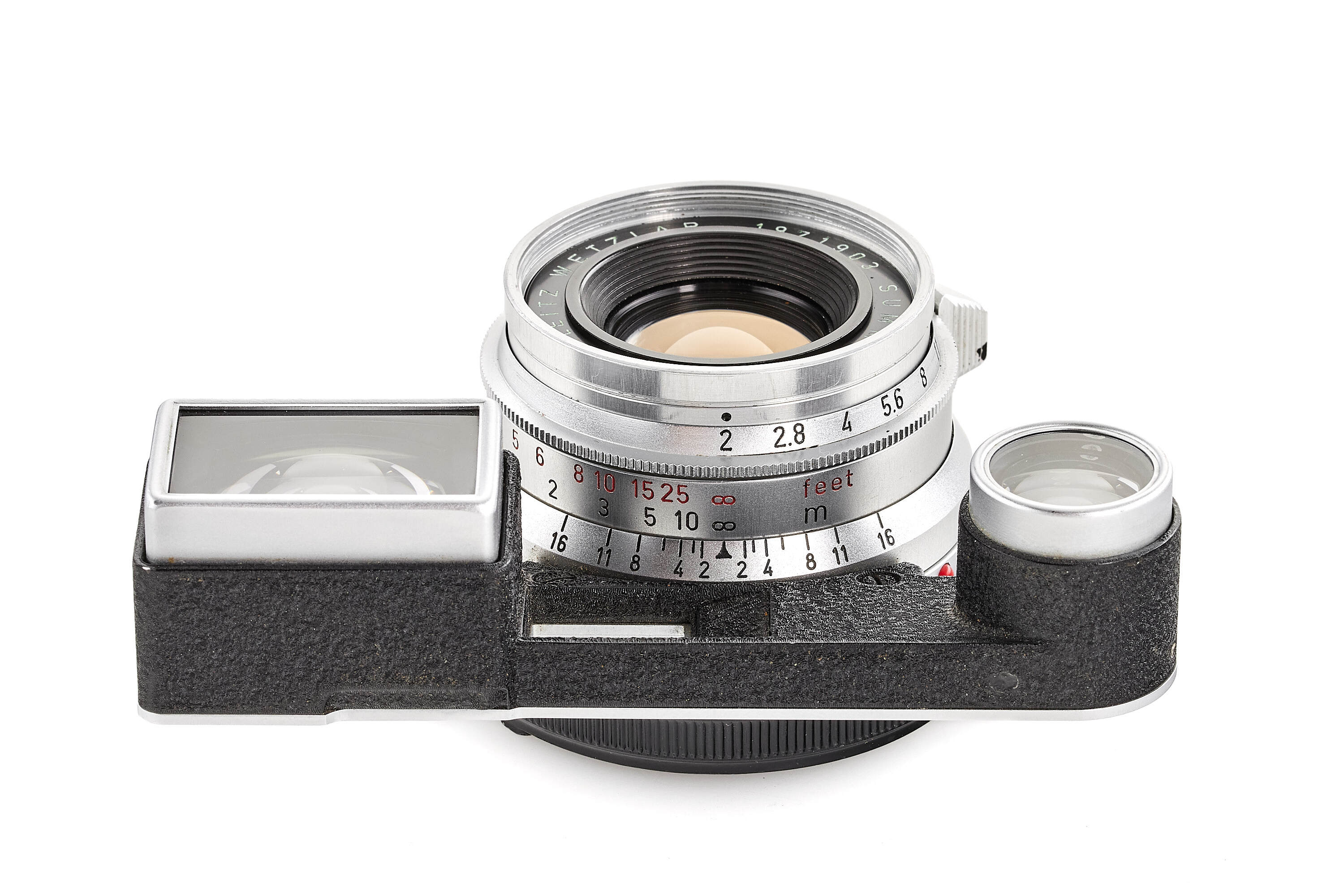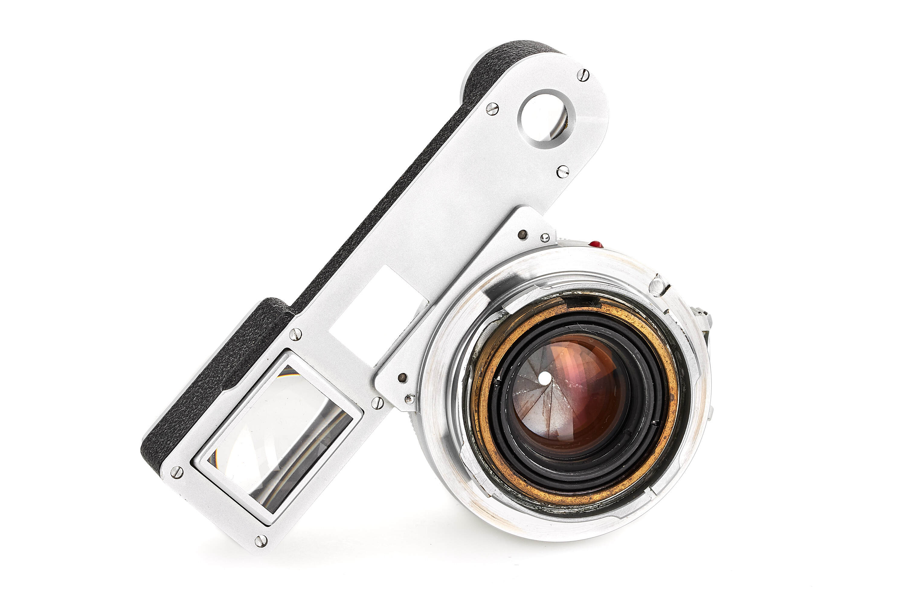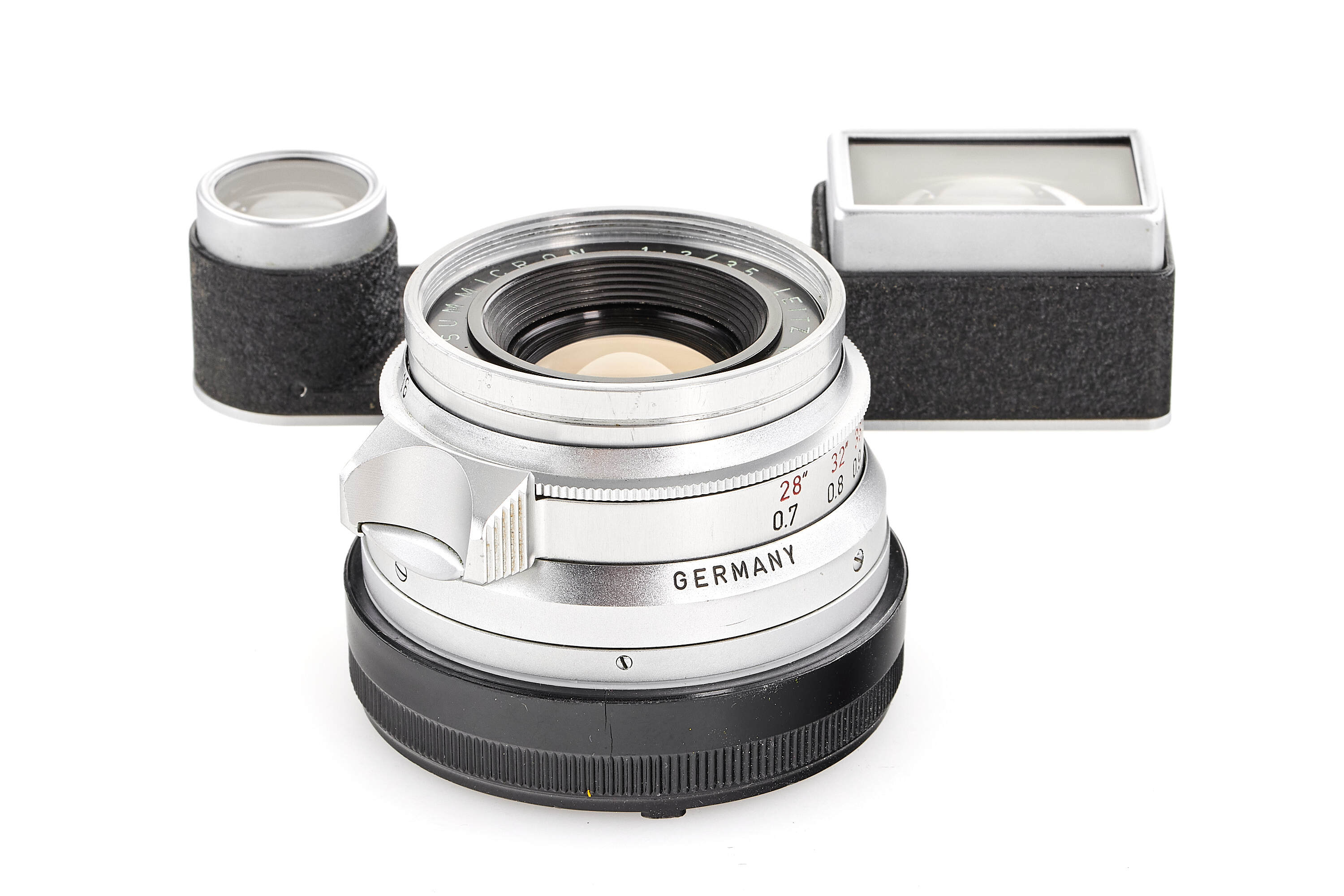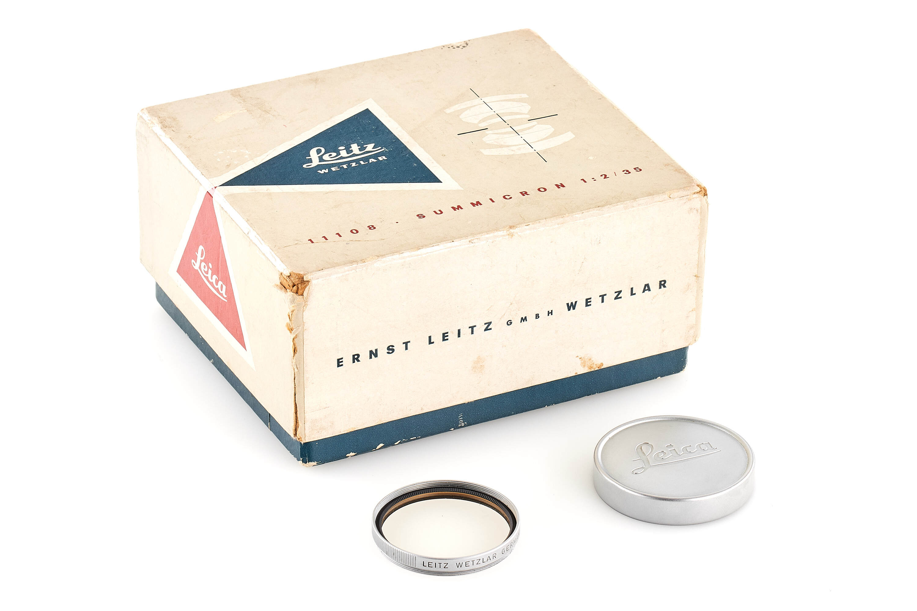 Beautiful sought-after 8-element Summicron chrome with goggles to use on an M3, in near-mint condition, almost perfect optics with only a few hairline cleaning marks, with both caps, UVa filter and maker's box.