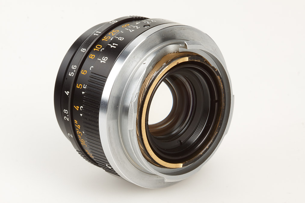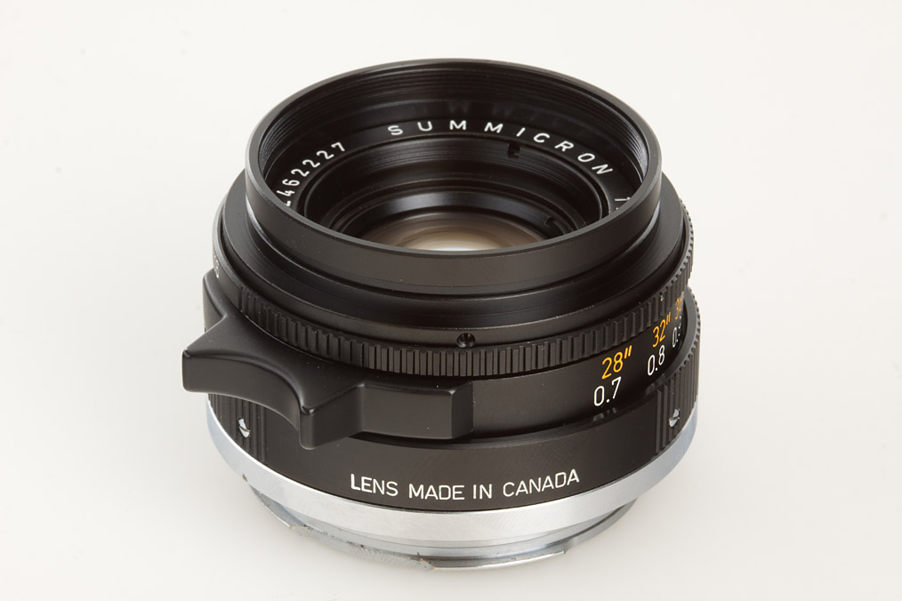 mint 6-element Summicron, second version, scooped focus control lever, clean lenses, E39 filter thread, cap, keeper