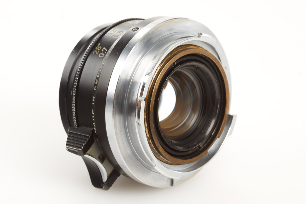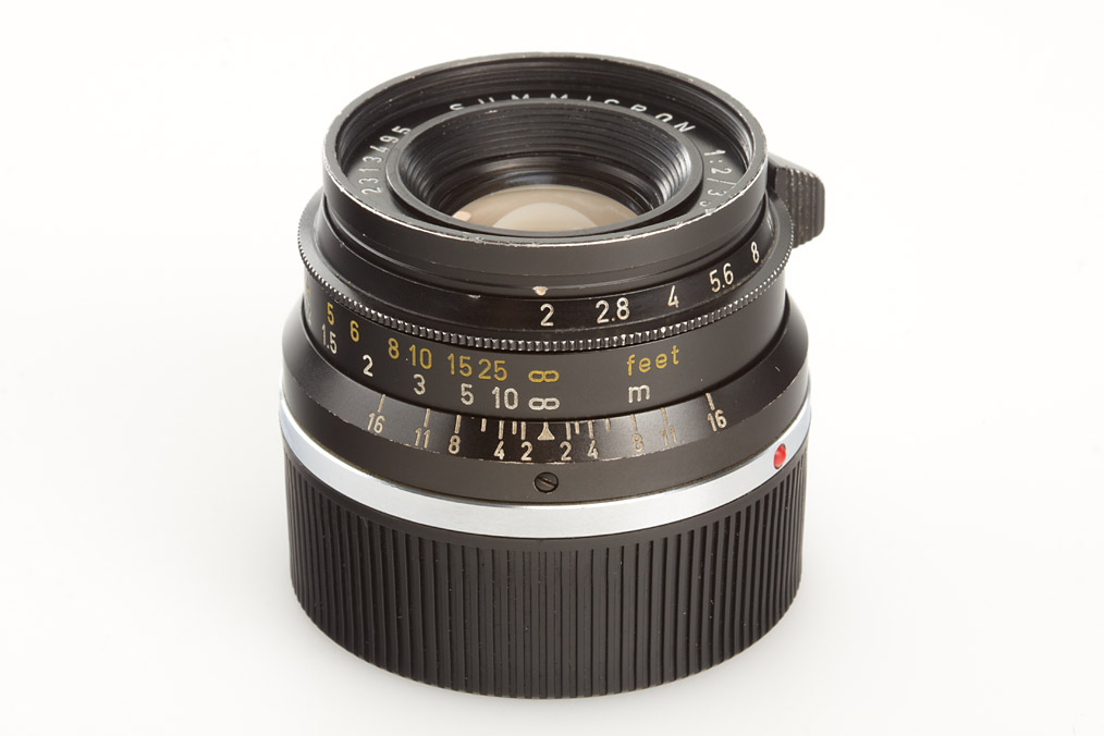 very rare black anodized 8-element Summicron for M2, clean lenses, one small scratch and a few fine cleaning marks on front lens element, smooth focus, chrome infinity lock knob, black front cap, rear cap, 12504 hood with UV filter, keeper