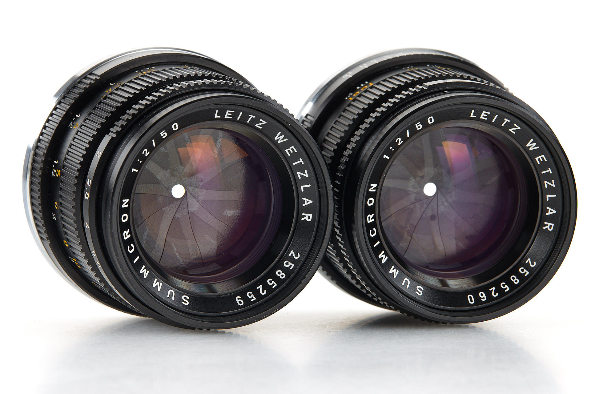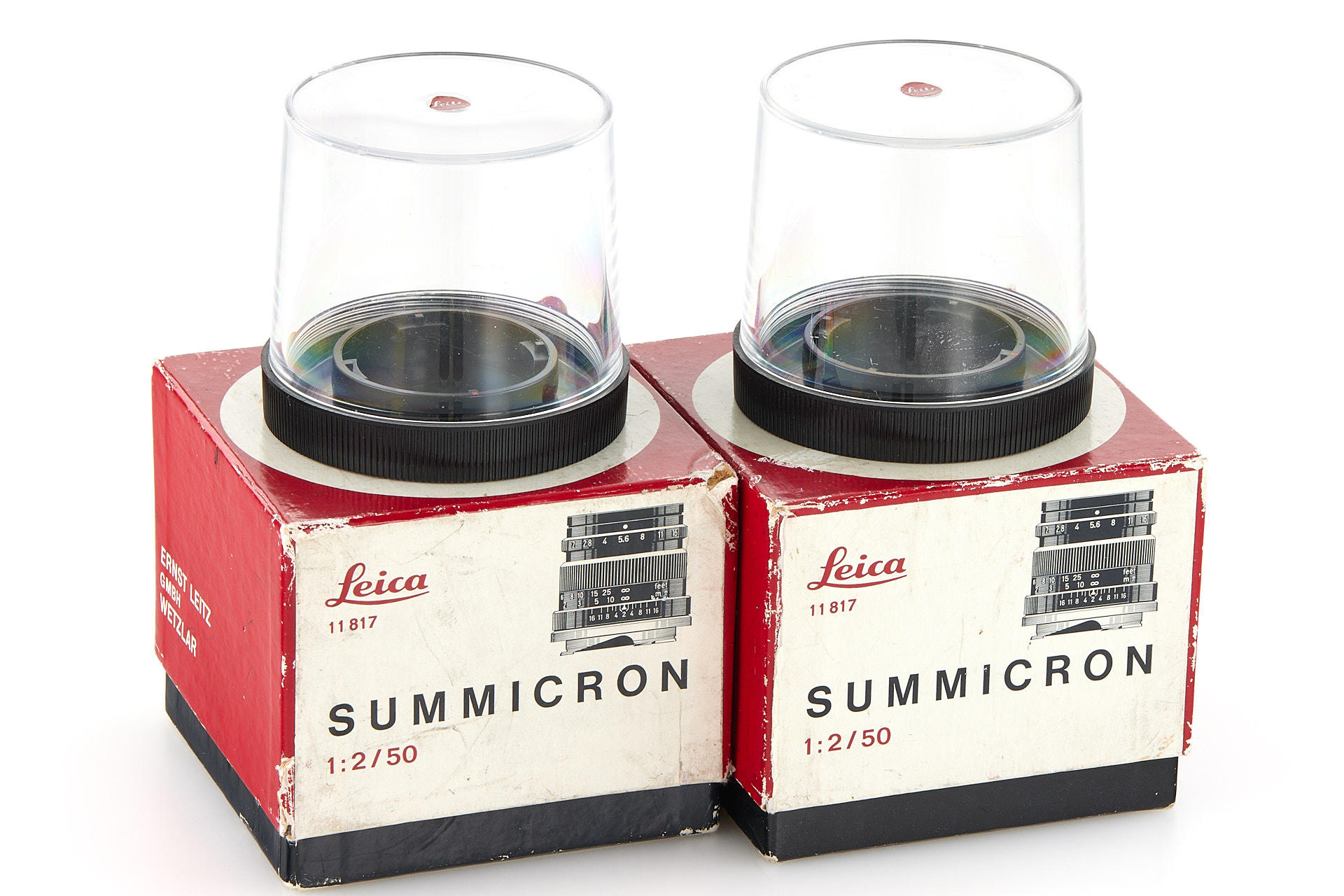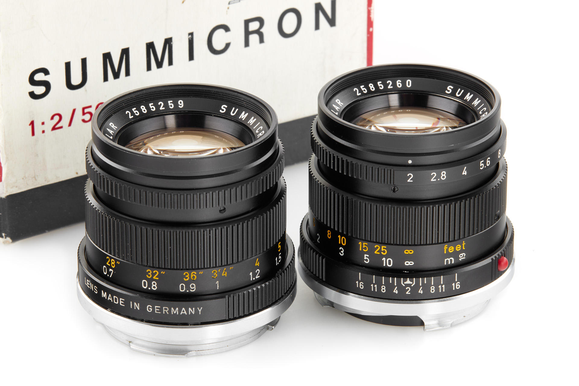 Very attractive set of two Summicron 2/50mm with consecutive serial numbers, both in mint condition and perfect lenses, with plastic keeper and maker's boxes