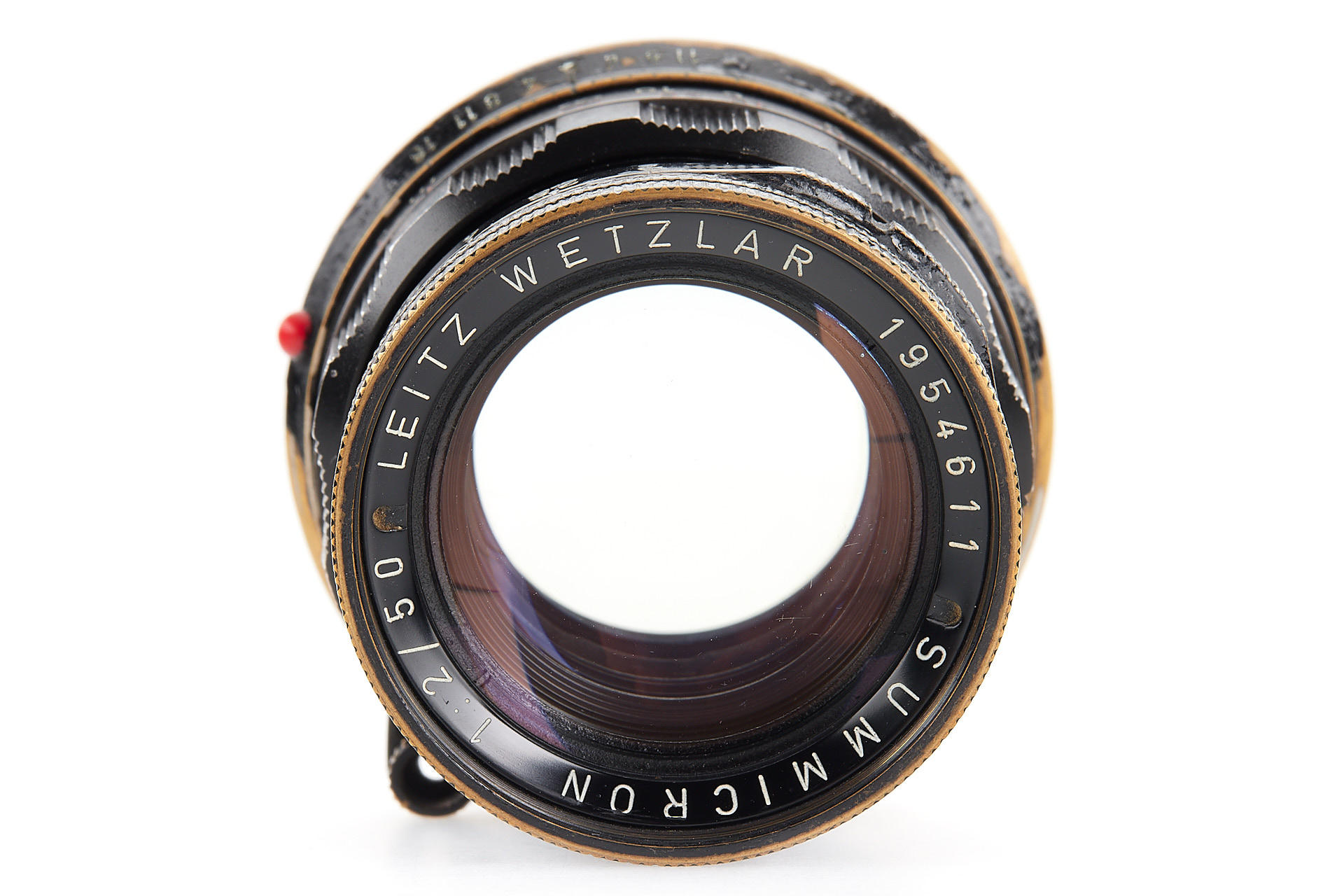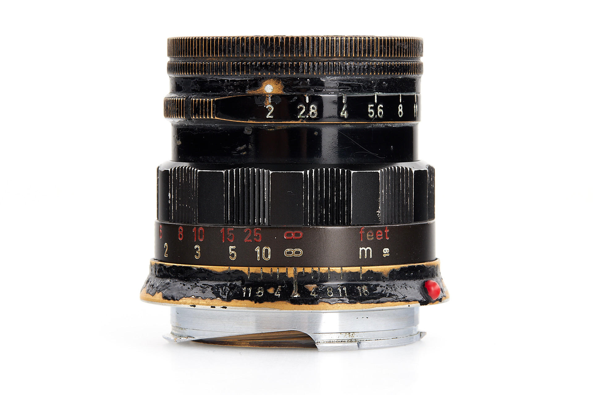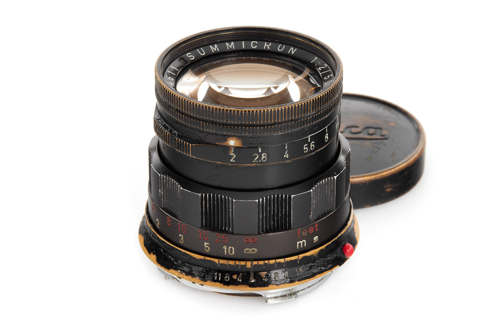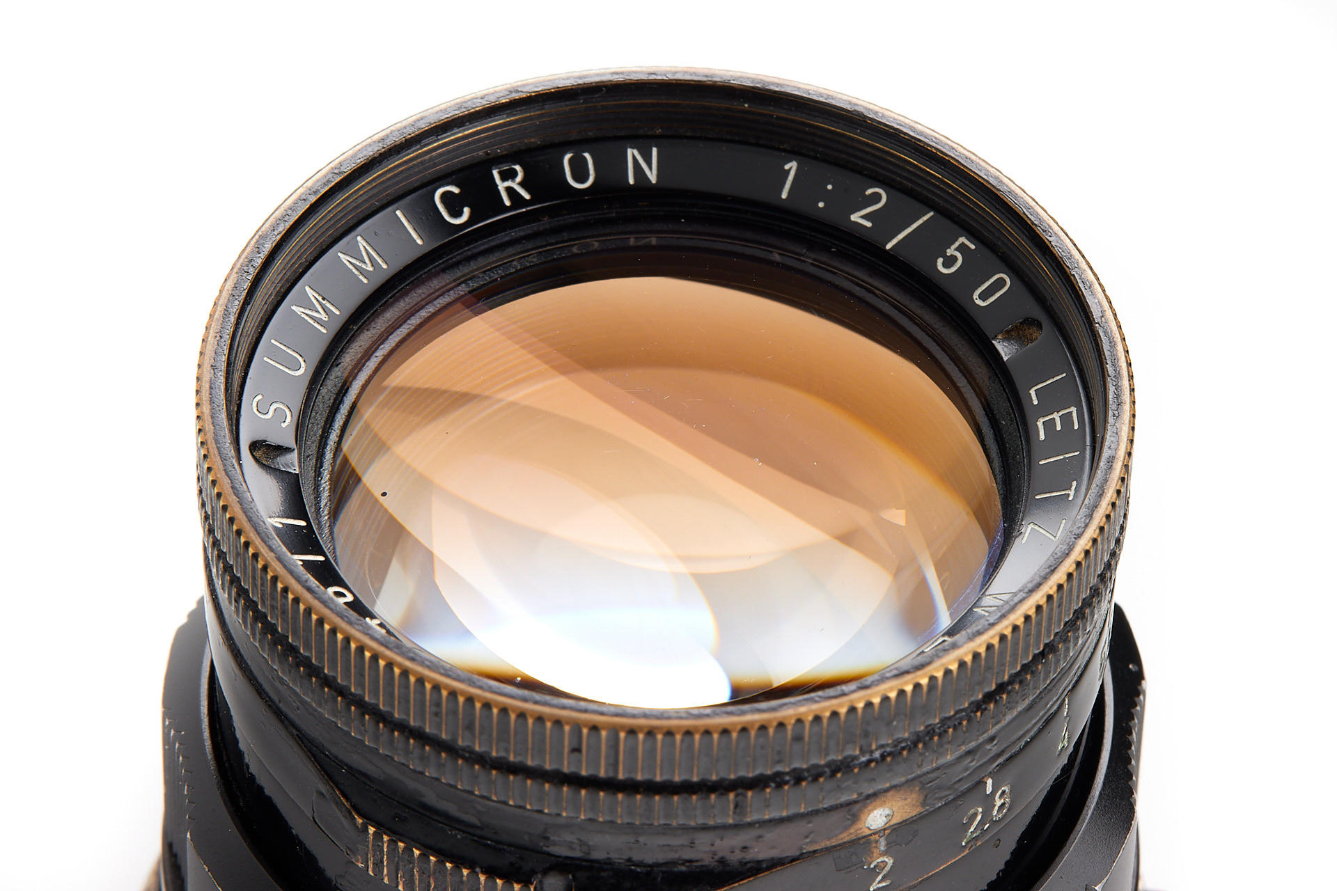 sought-after, original black paint Summicron with a patina of professional use, infinity-locking knob removed (often done by Leica on request of professional photographers), very good, clean optics, with black paint front cap and plastic keeper