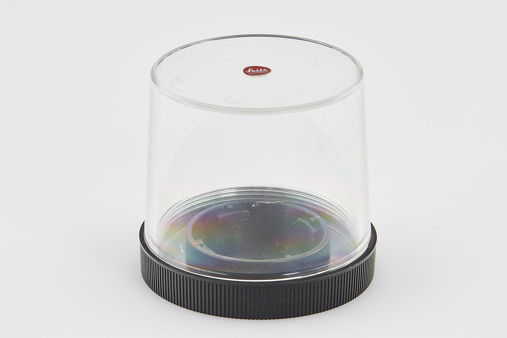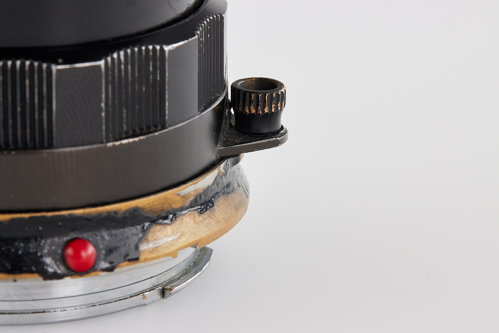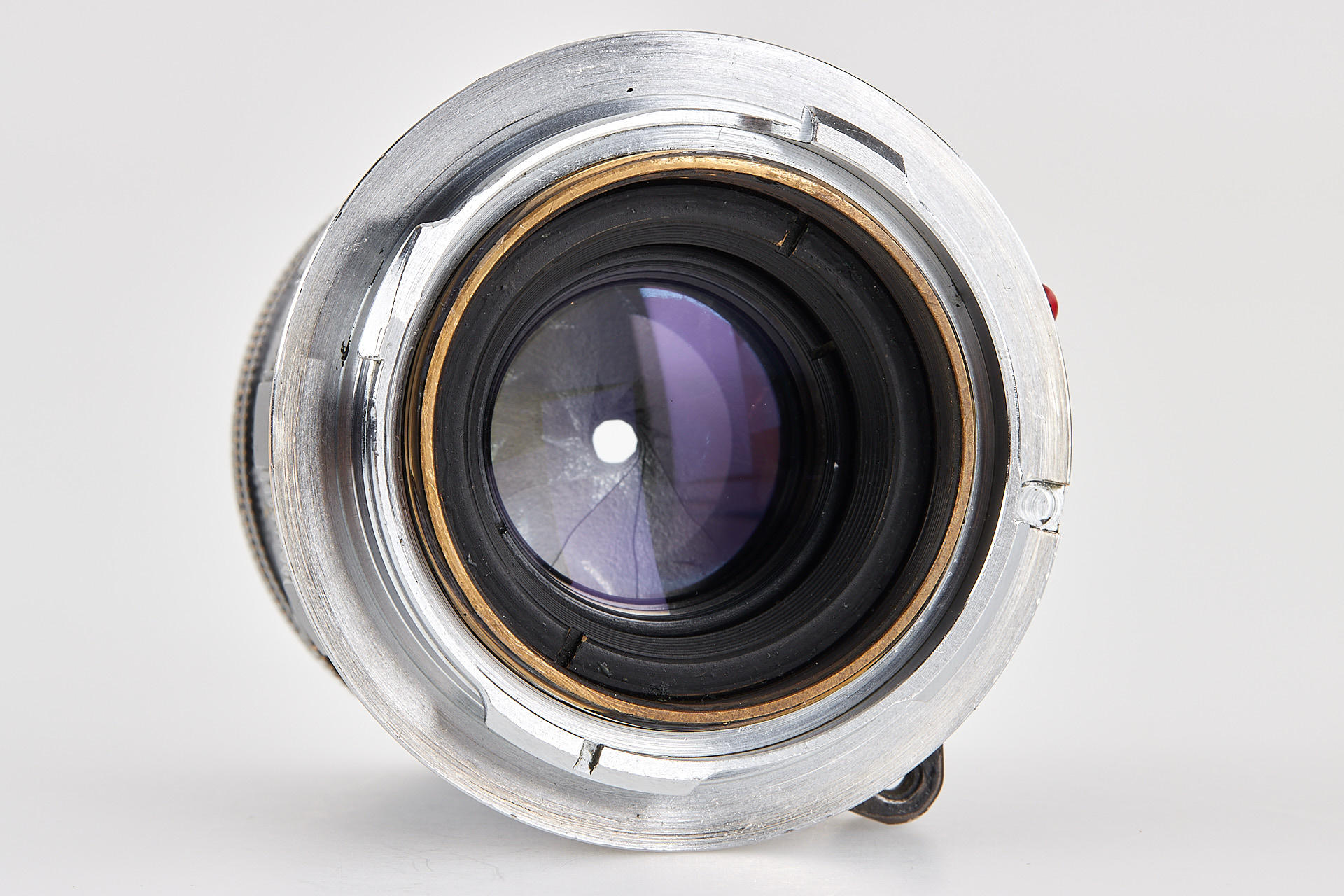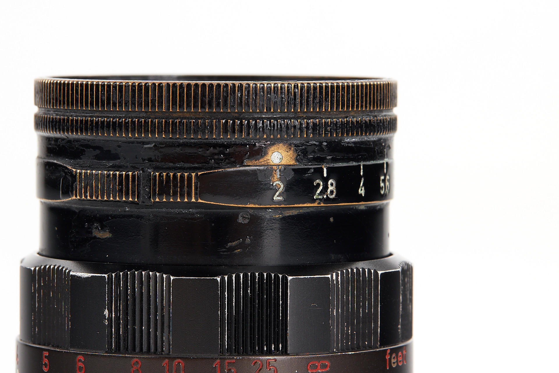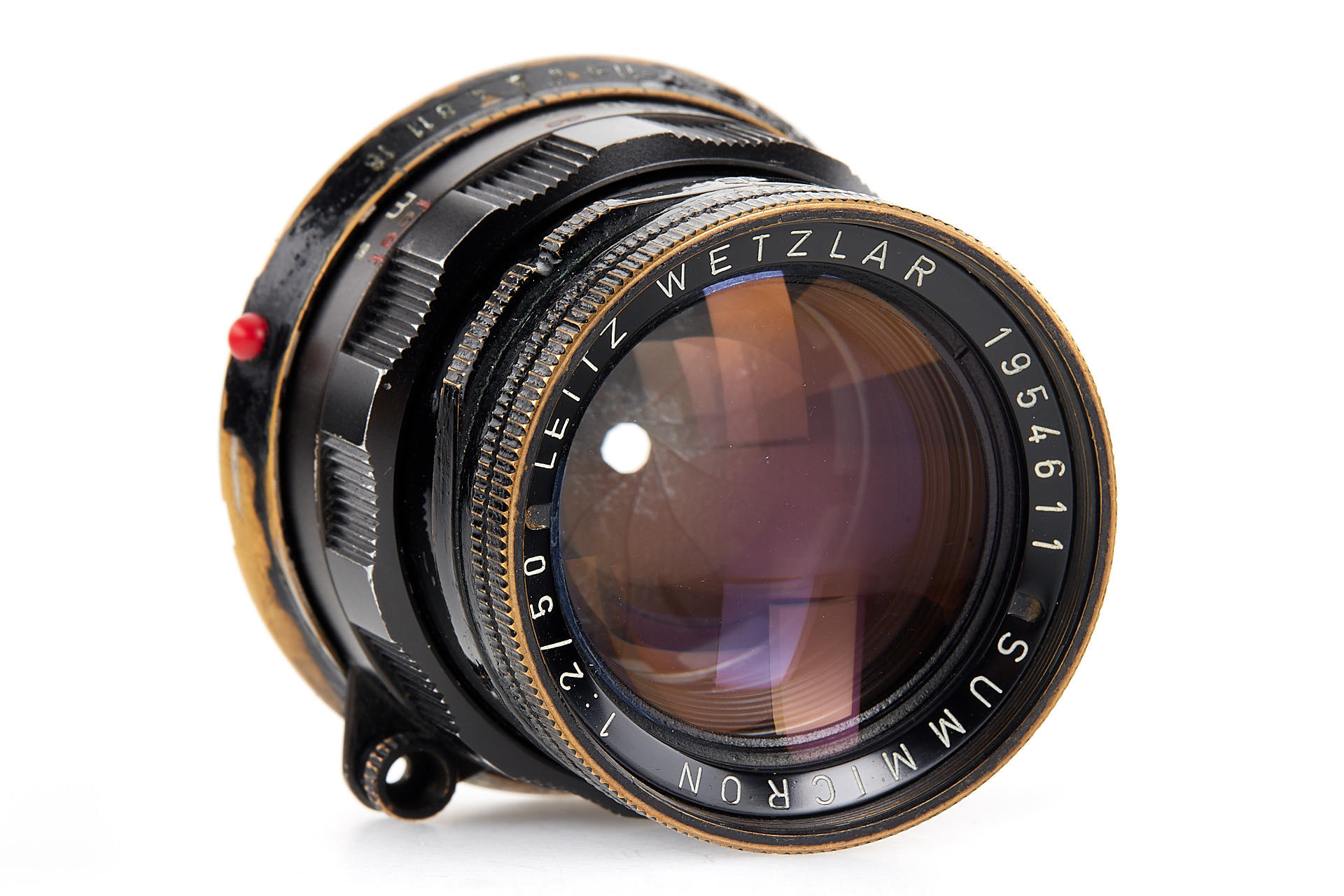 sought-after, original black paint Summicron with a patina of professional use, infinity-locking knob removed (often done by Leica on request of professional photographers), very good, clean optics, with black paint front cap and plastic keeper
