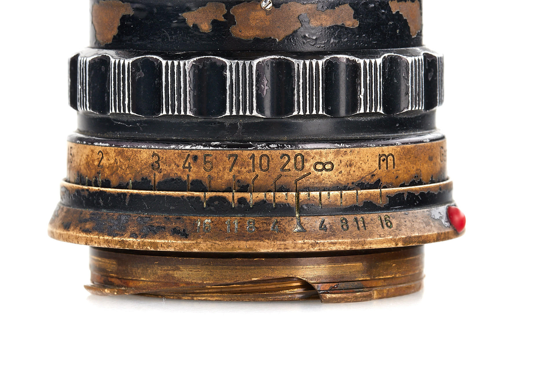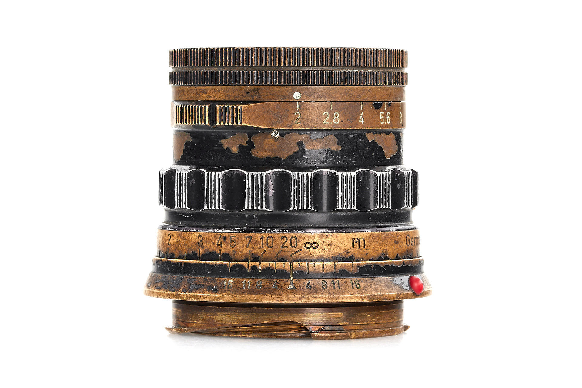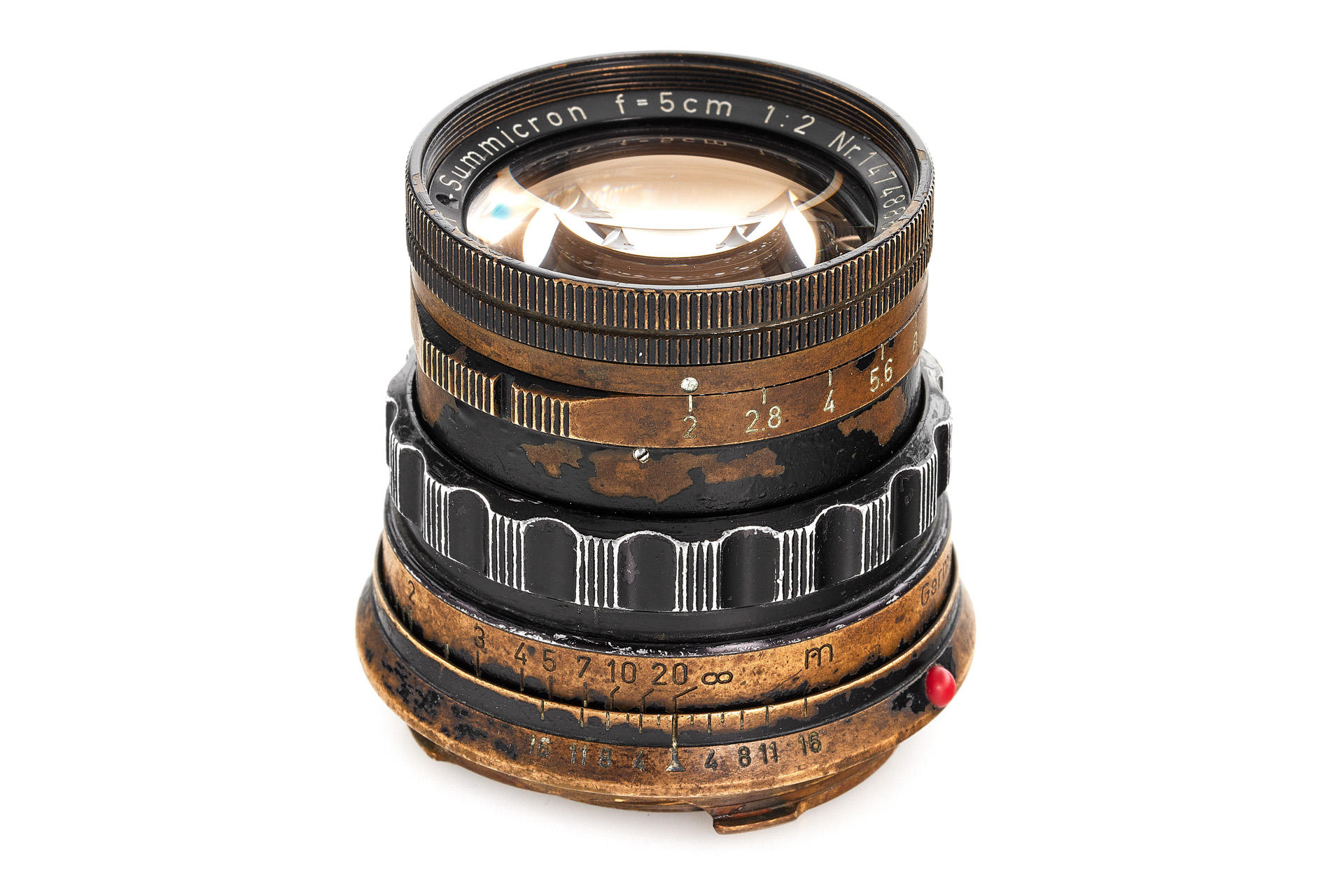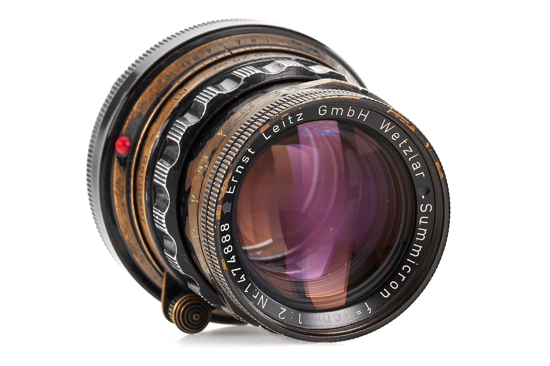 early and rare black paint Summicron with brass lens mount, meter scale, with patina of years of professional use, a matching lens for a brassy black paint Leica MP, good optics, with both caps, the lens was delivered to Sweden on 30.07.1957