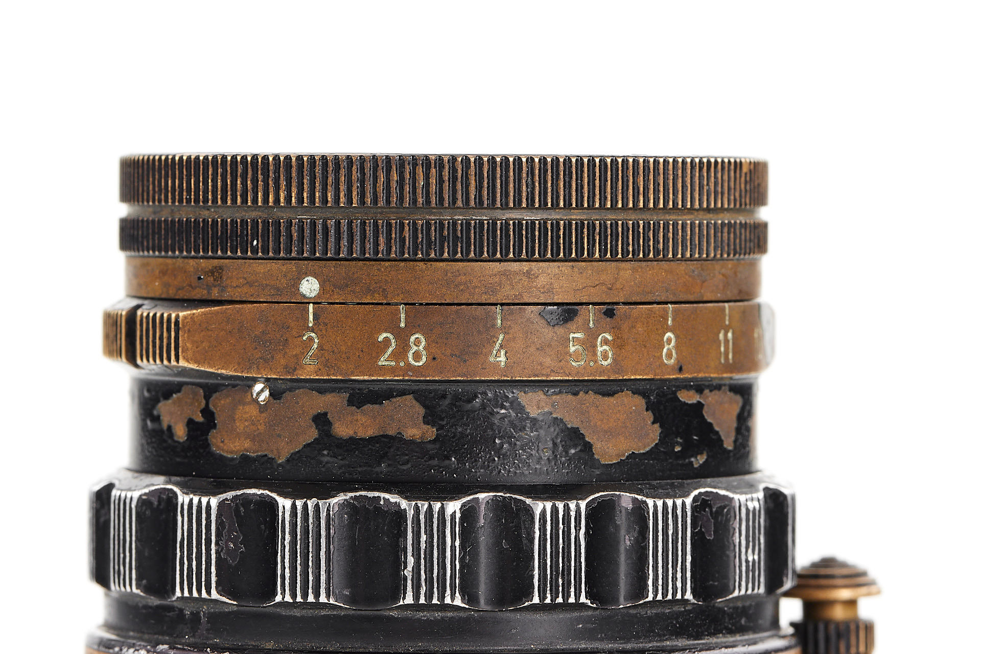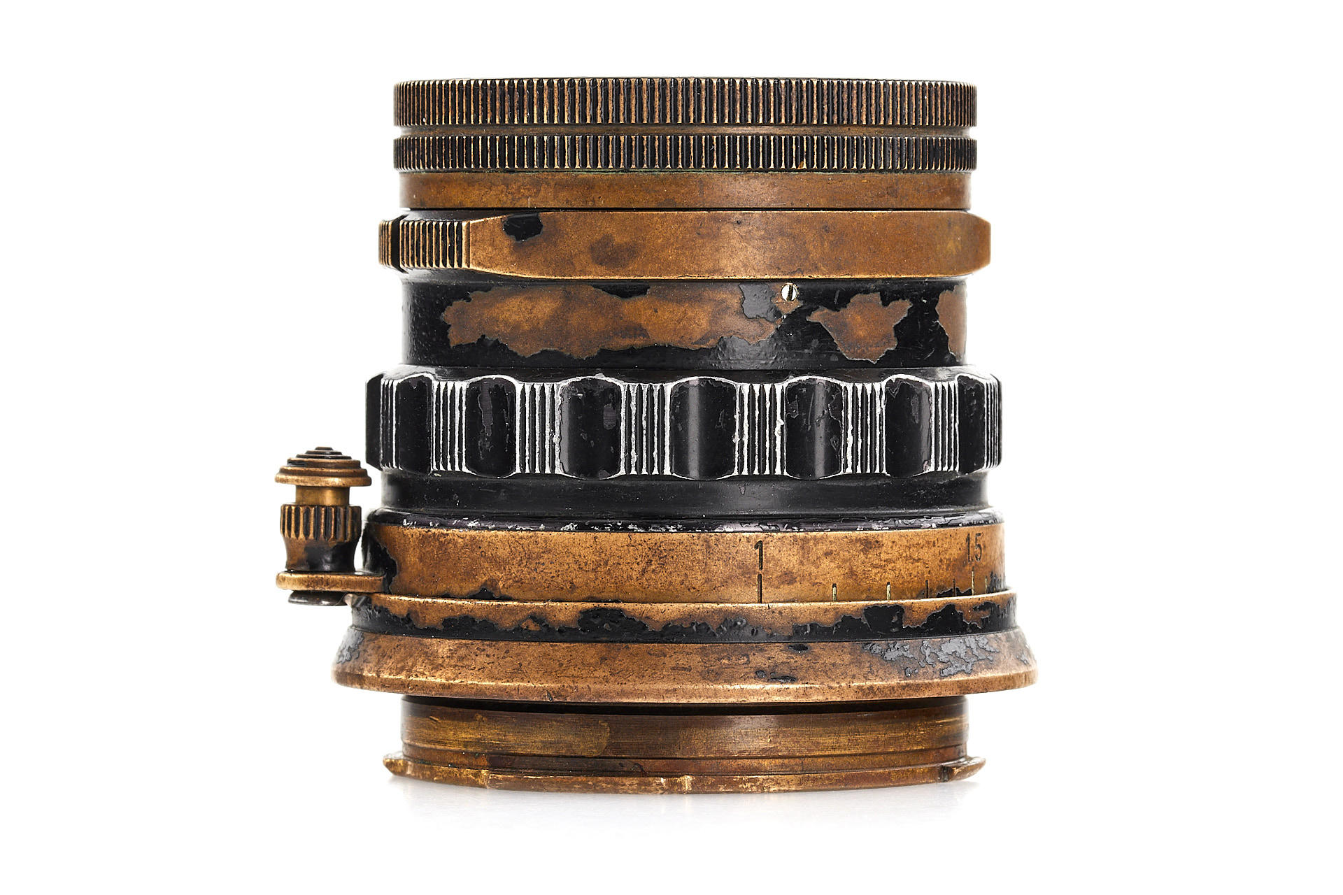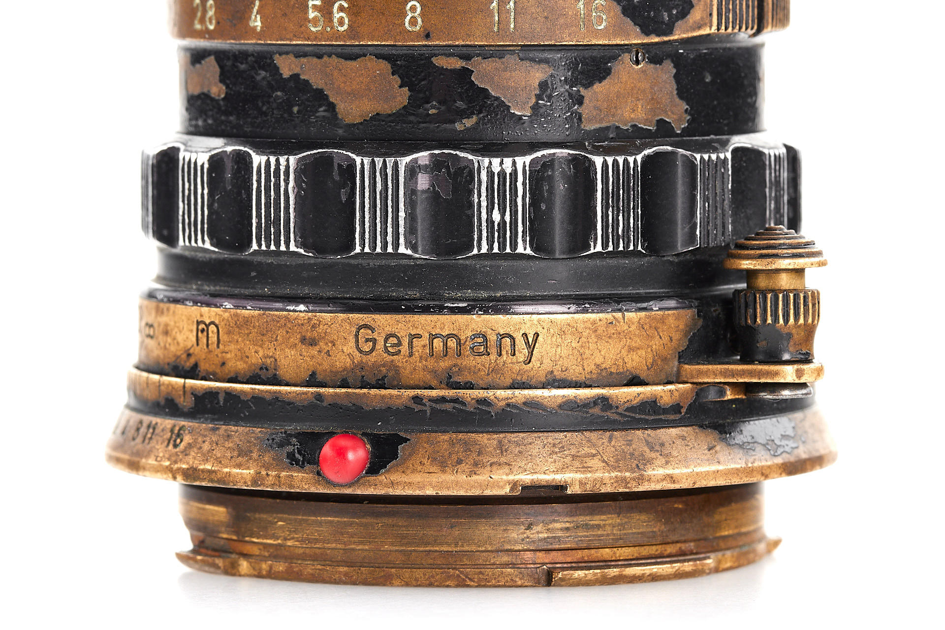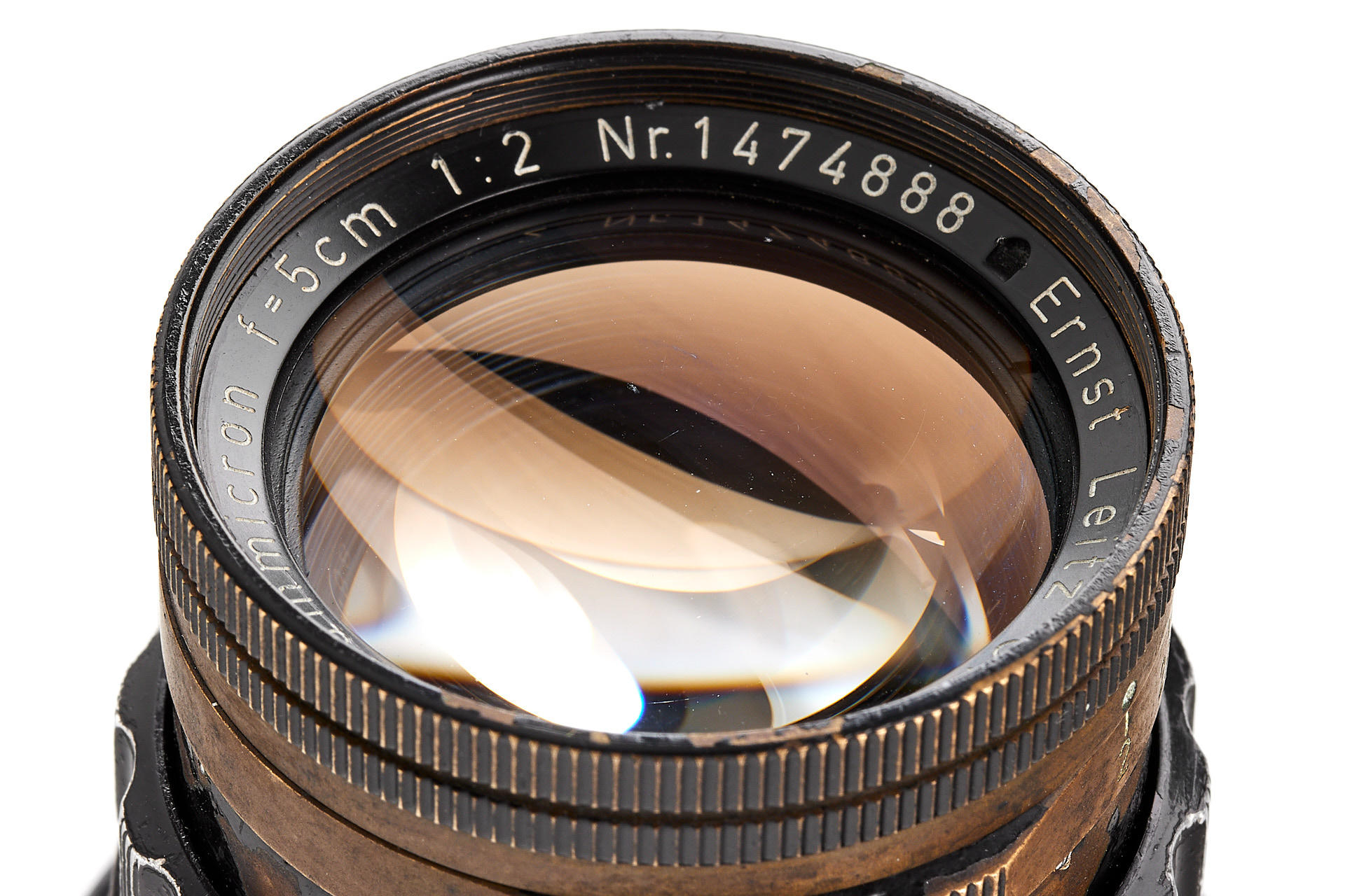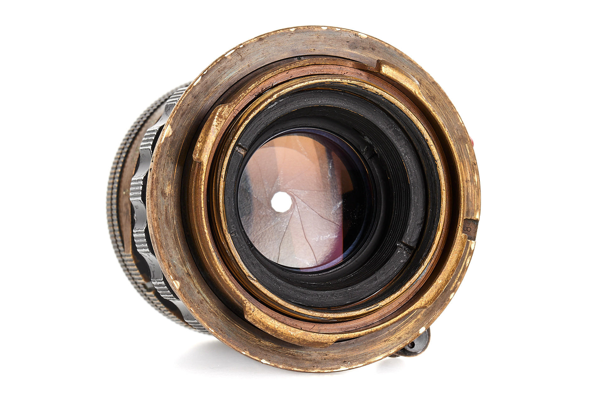 early and rare black paint Summicron with brass lens mount, meter scale, with patina of years of professional use, a matching lens for a brassy black paint Leica MP, good optics, with both caps, the lens was delivered to Sweden on 30.07.1957