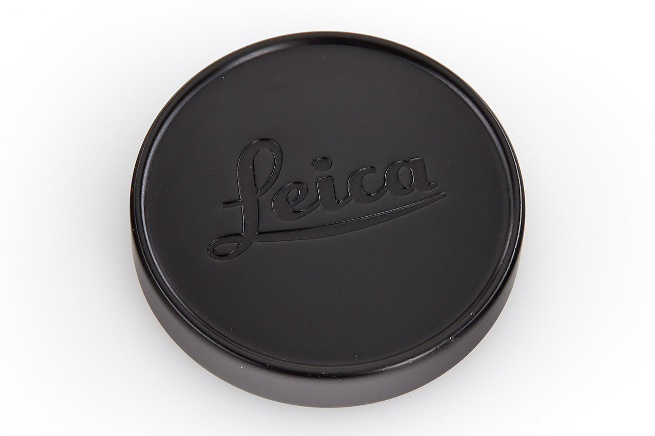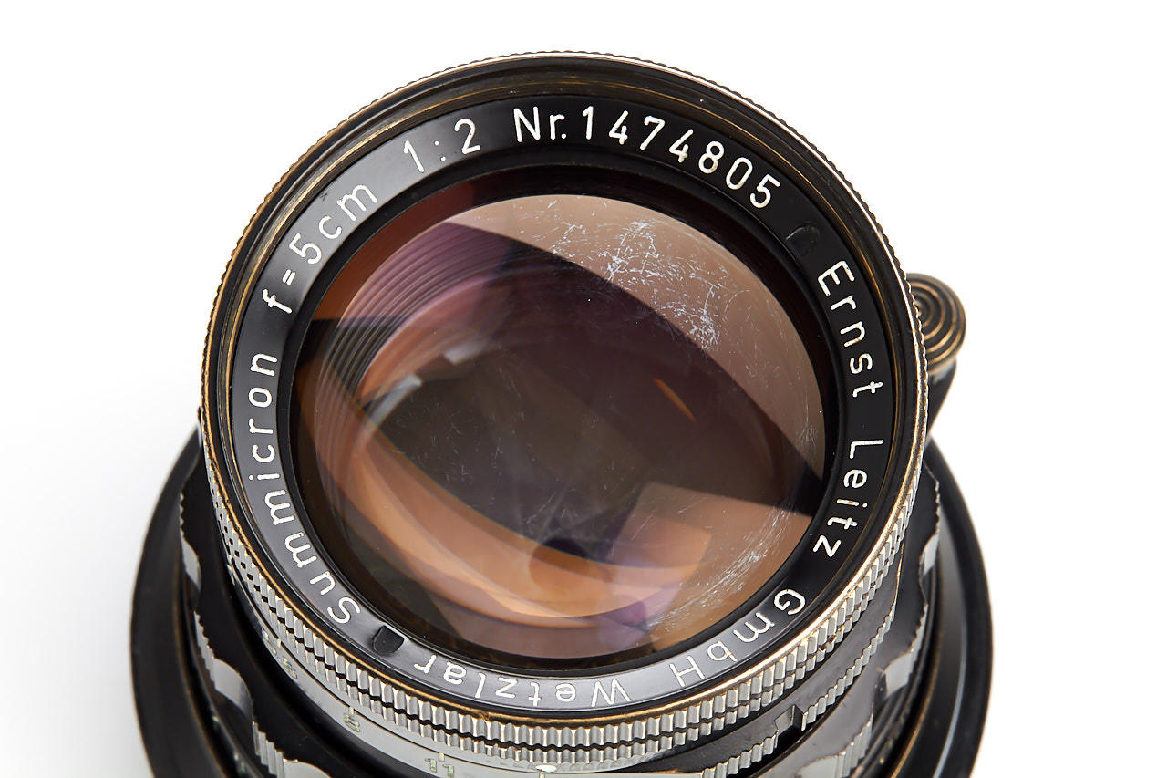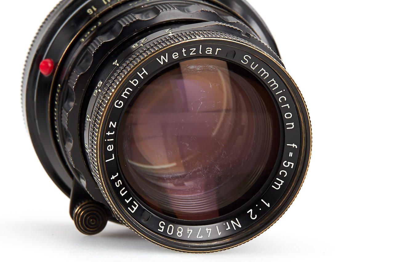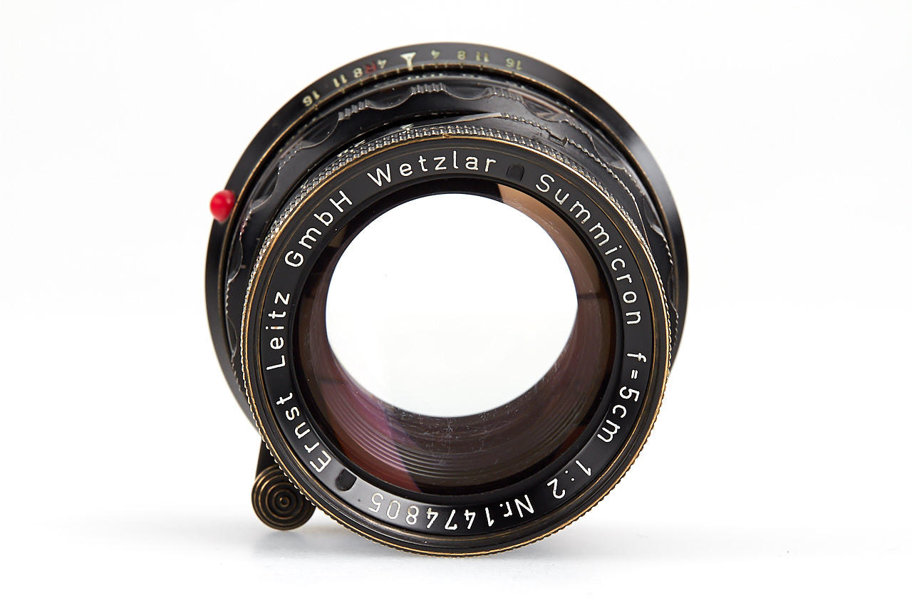 early and rare black paint Summicron with black brass lens mount, feet scale, in very fine condition, good optics (slight cleaning marks on front element), incl. IROOA hood, front and rear cap and keeper - a classic lens for a black MP