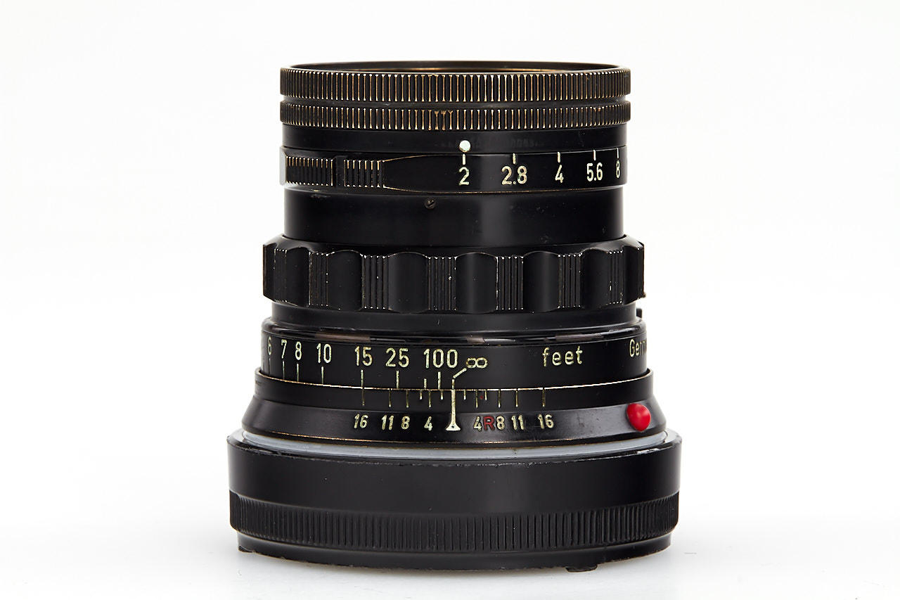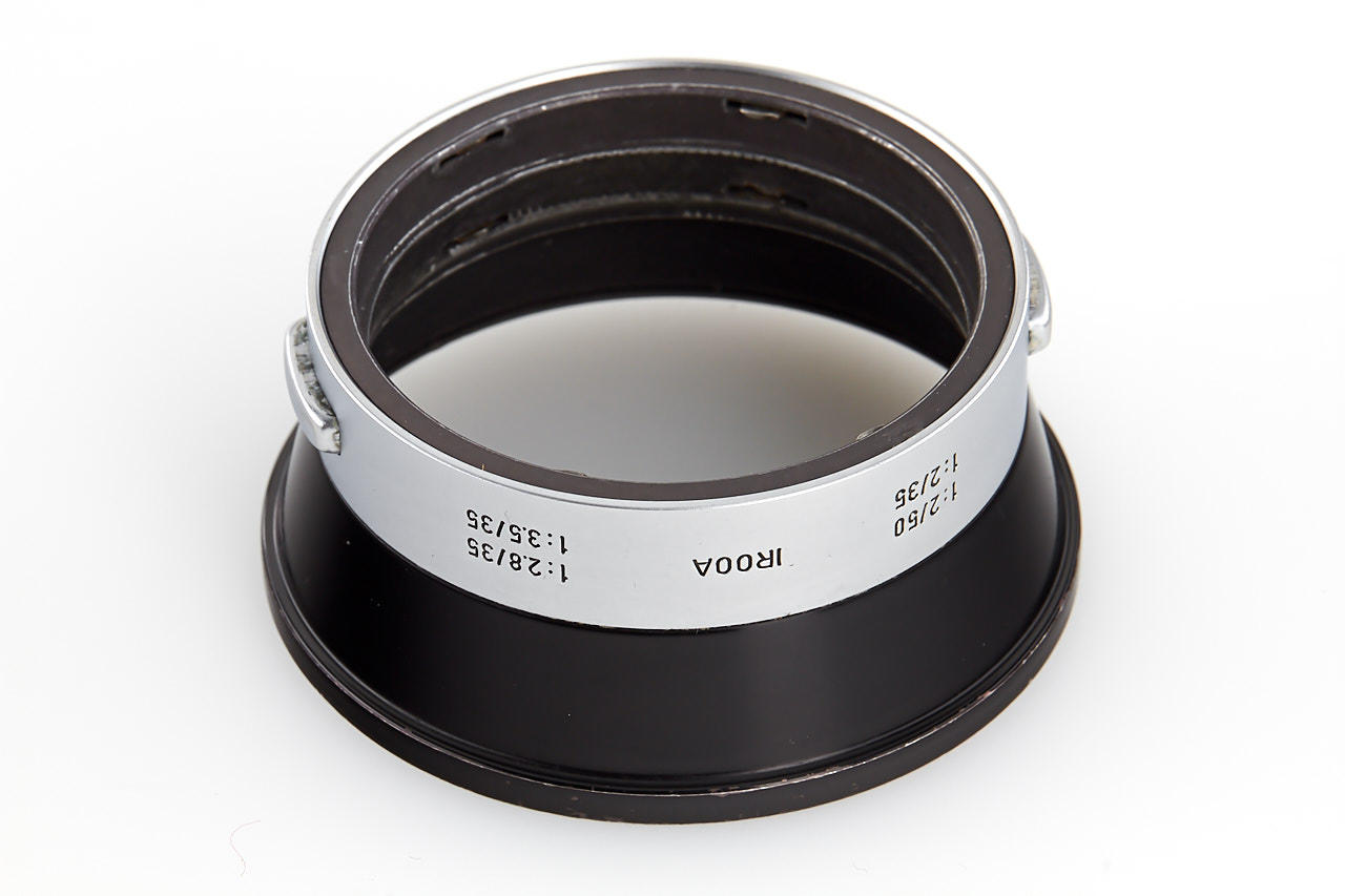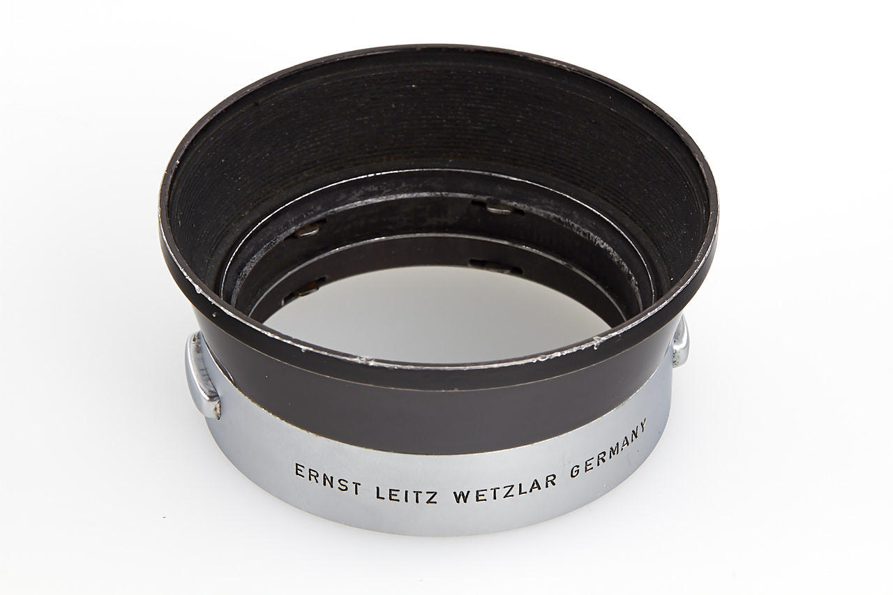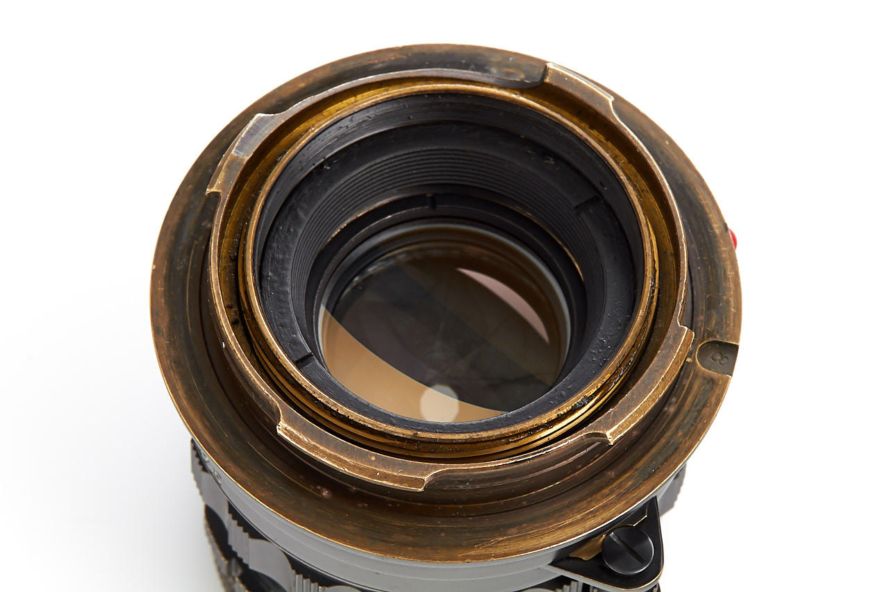 early and rare black paint Summicron with black brass lens mount, feet scale, in very fine condition, good optics (slight cleaning marks on front element), incl. IROOA hood, front and rear cap and keeper - a classic lens for a black MP