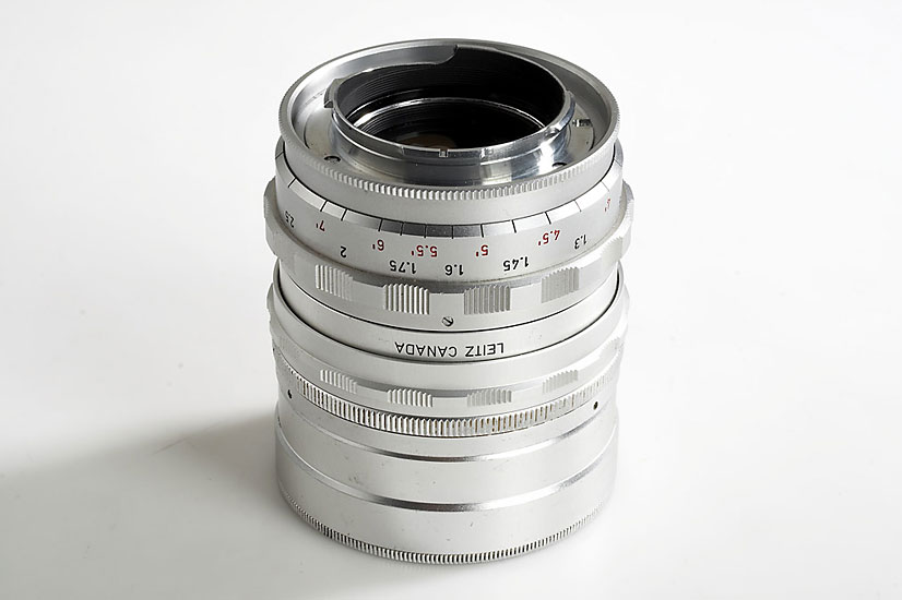 In early 1959 Leitz redesigned the focusing ring of the earlier SOOZI-M and give it a built-in lens hood, they started with no.1651001. So this is the 25th lens of the new 90mm Summicron of 1959. Engraved: Ernst Leitz Canada Ltd. Midland, fitted in short focusing mount ZOOEP with extension tube 16474, cap, plastic keeper
