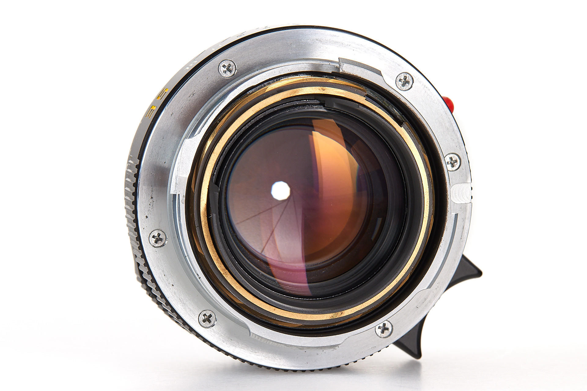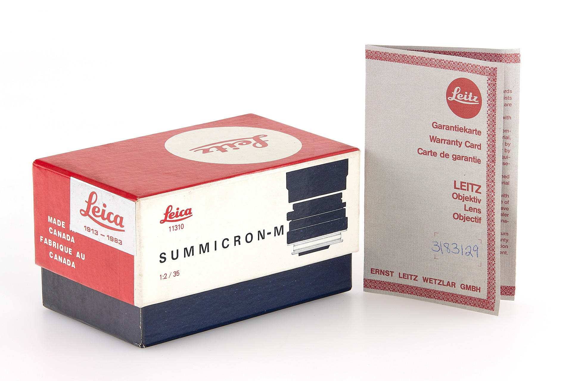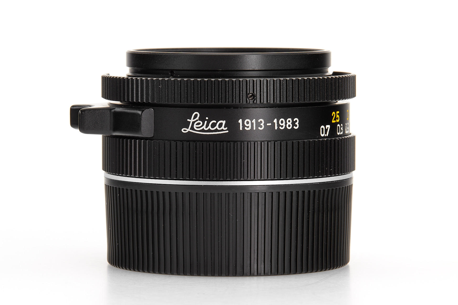 special edition Summicron issued to commemorate 70 years of Leica cameras 1913-1983, sought-after 7-element lens known for its exceptional bokeh, in mint, unused condition, with good optics, incl. both caps, 12524 hood (cond. A/B), warranty card and matching maker's box