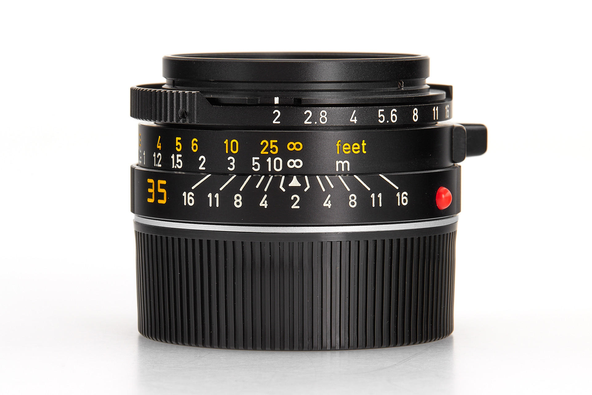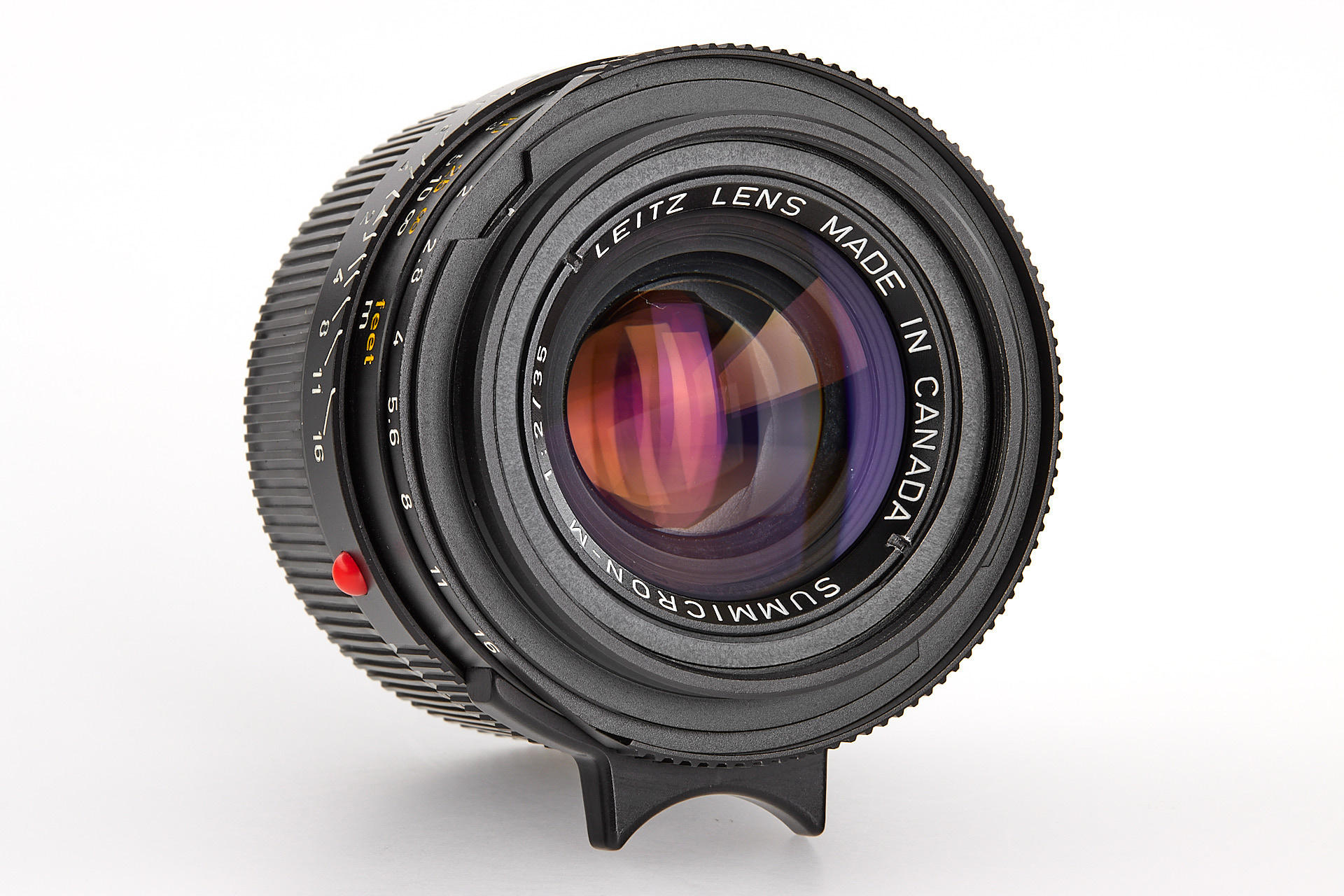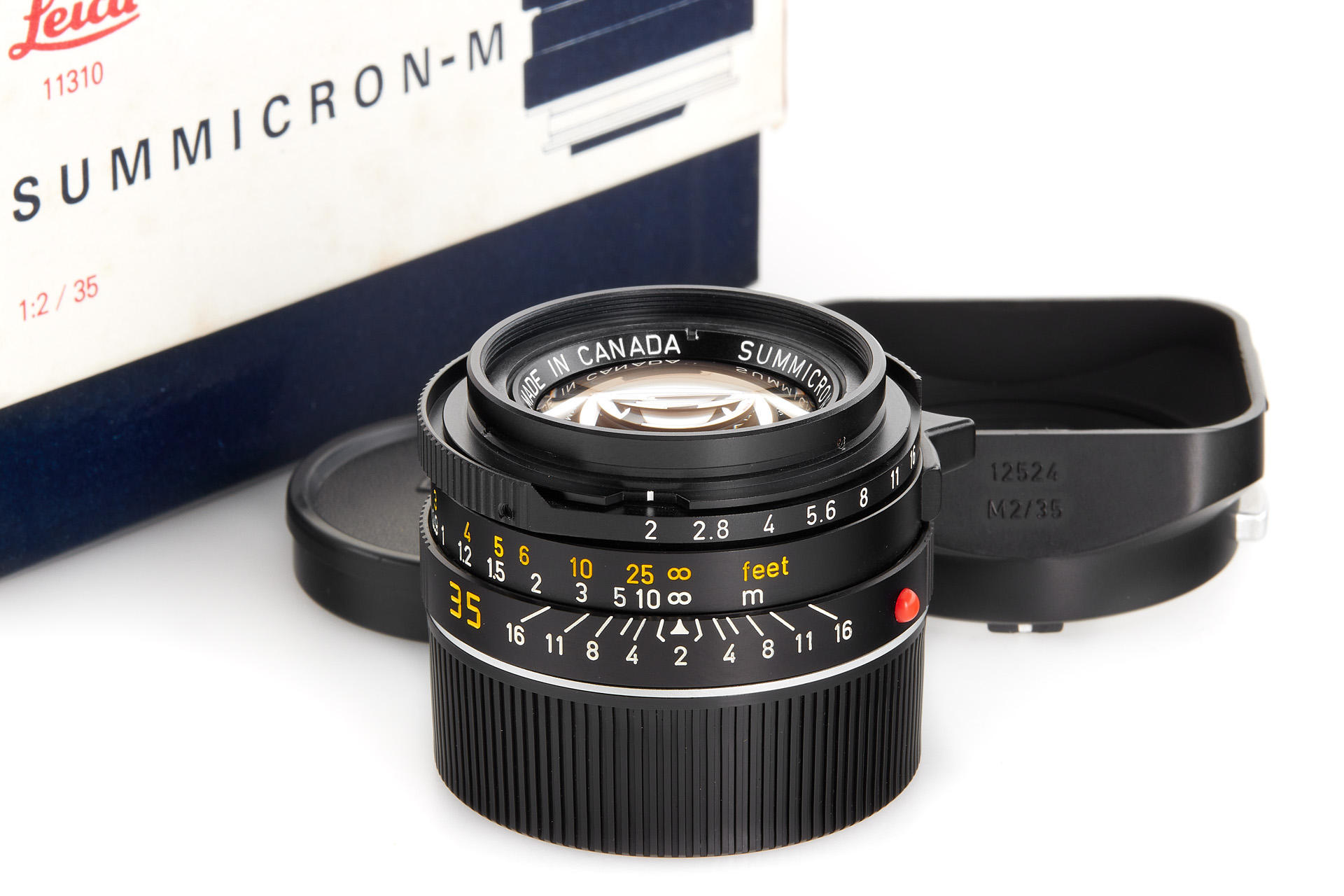 special edition Summicron issued to commemorate 70 years of Leica cameras 1913-1983, sought-after 7-element lens known for its exceptional bokeh, in mint, unused condition, with good optics, incl. both caps, 12524 hood (cond. A/B), warranty card and matching maker's box