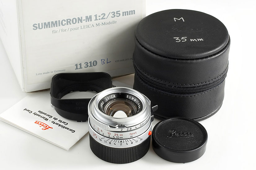 quite rare, mint Summicron-M 2/35mm in chrome finish with perfect lenses, hood 12524, caps, leather case, guarantee card, maker's box (for 11310)