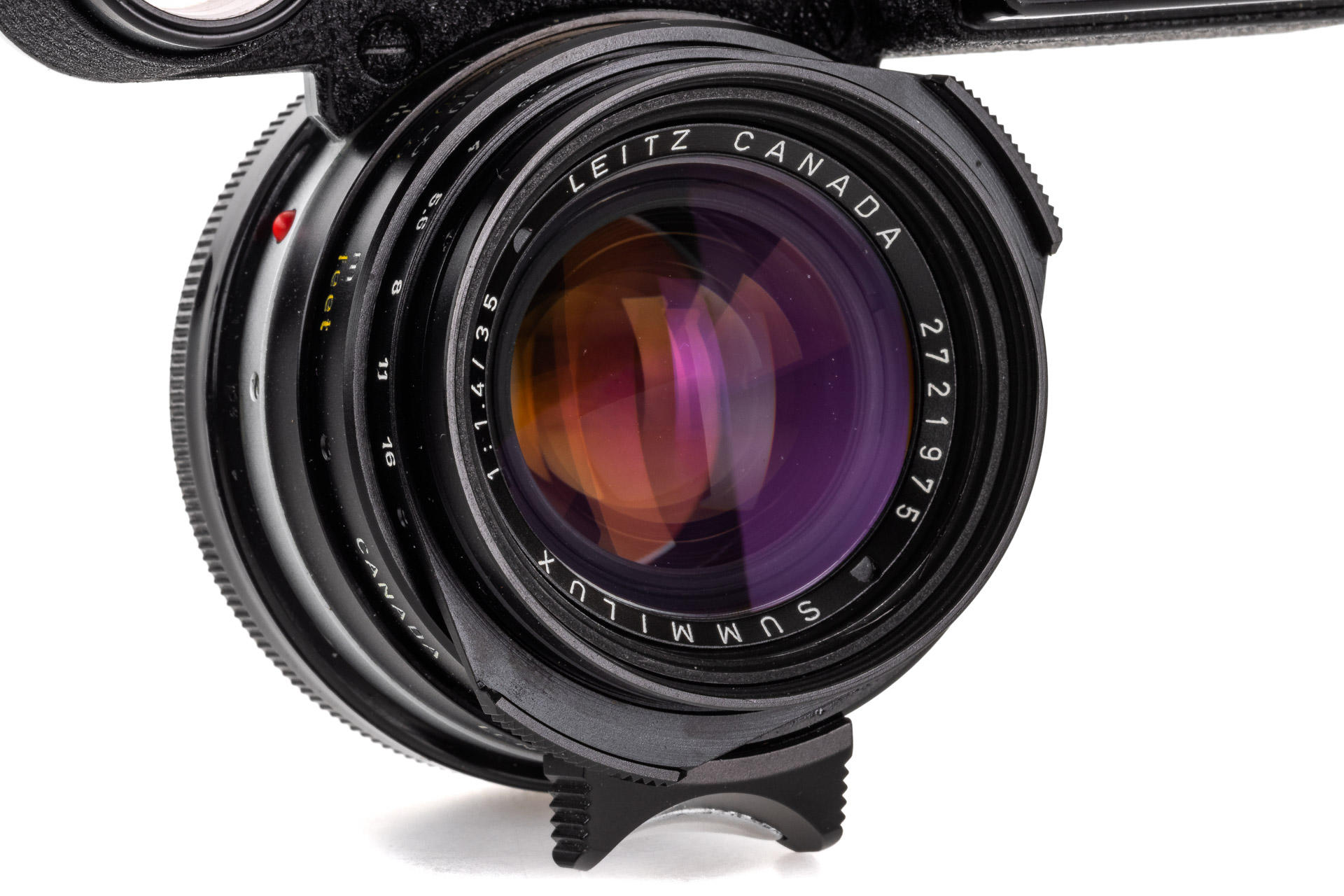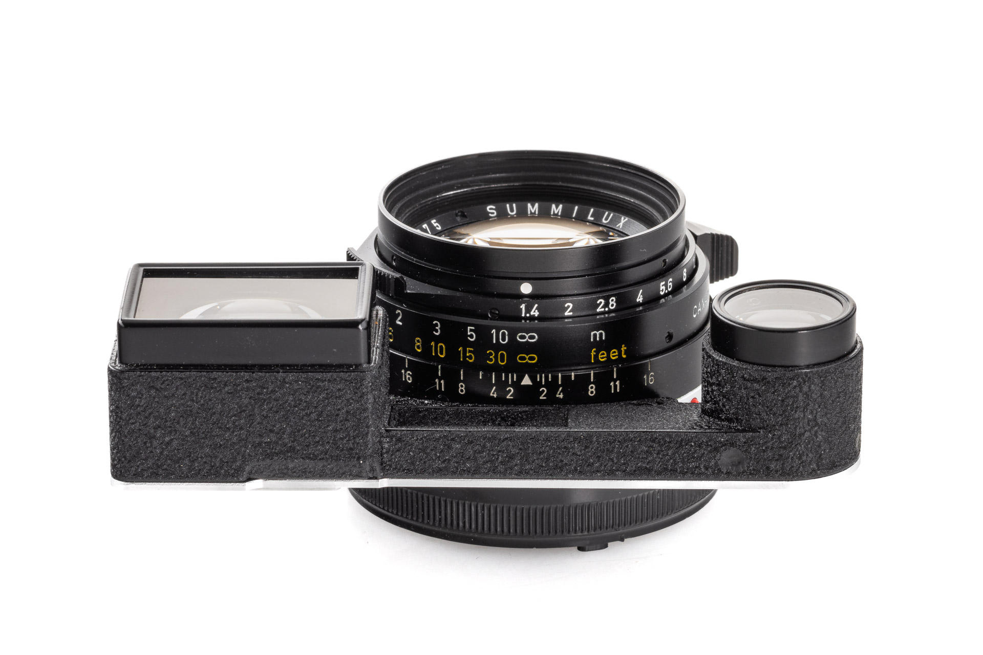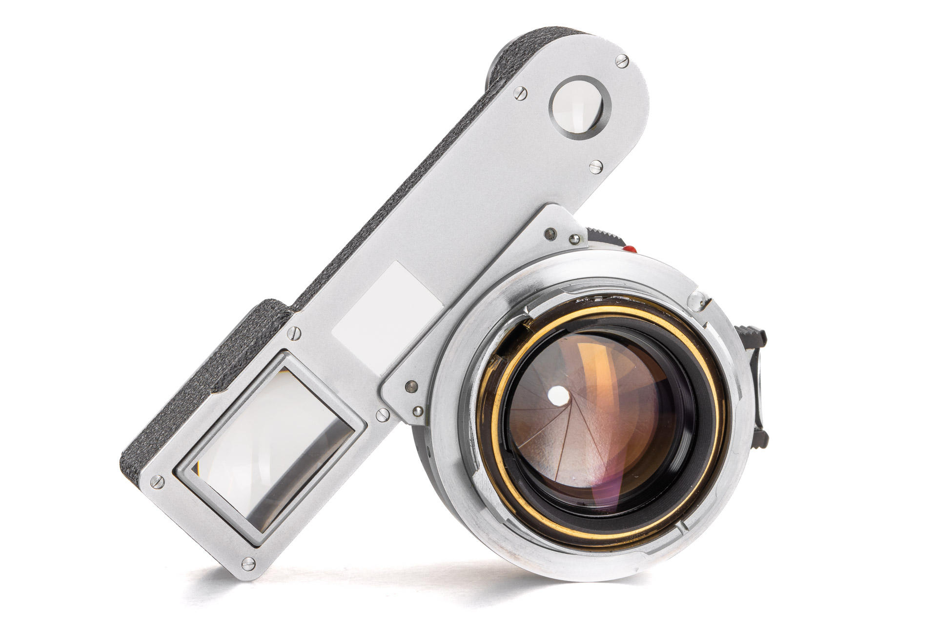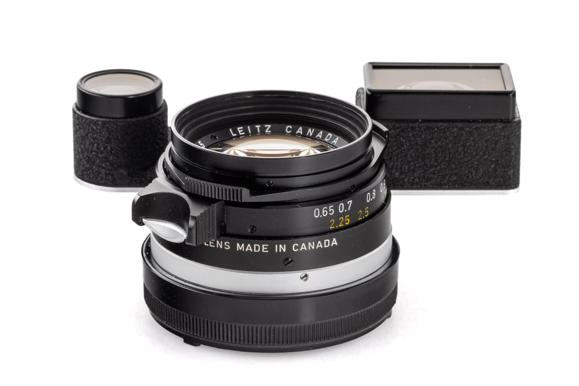 beautiful rare and sought-after Summilux with goggles for M3 in black chrome finish with black paint goggles and chrome infinity lock, in mint condition, clean and clear lenses, with both caps and matching maker's box