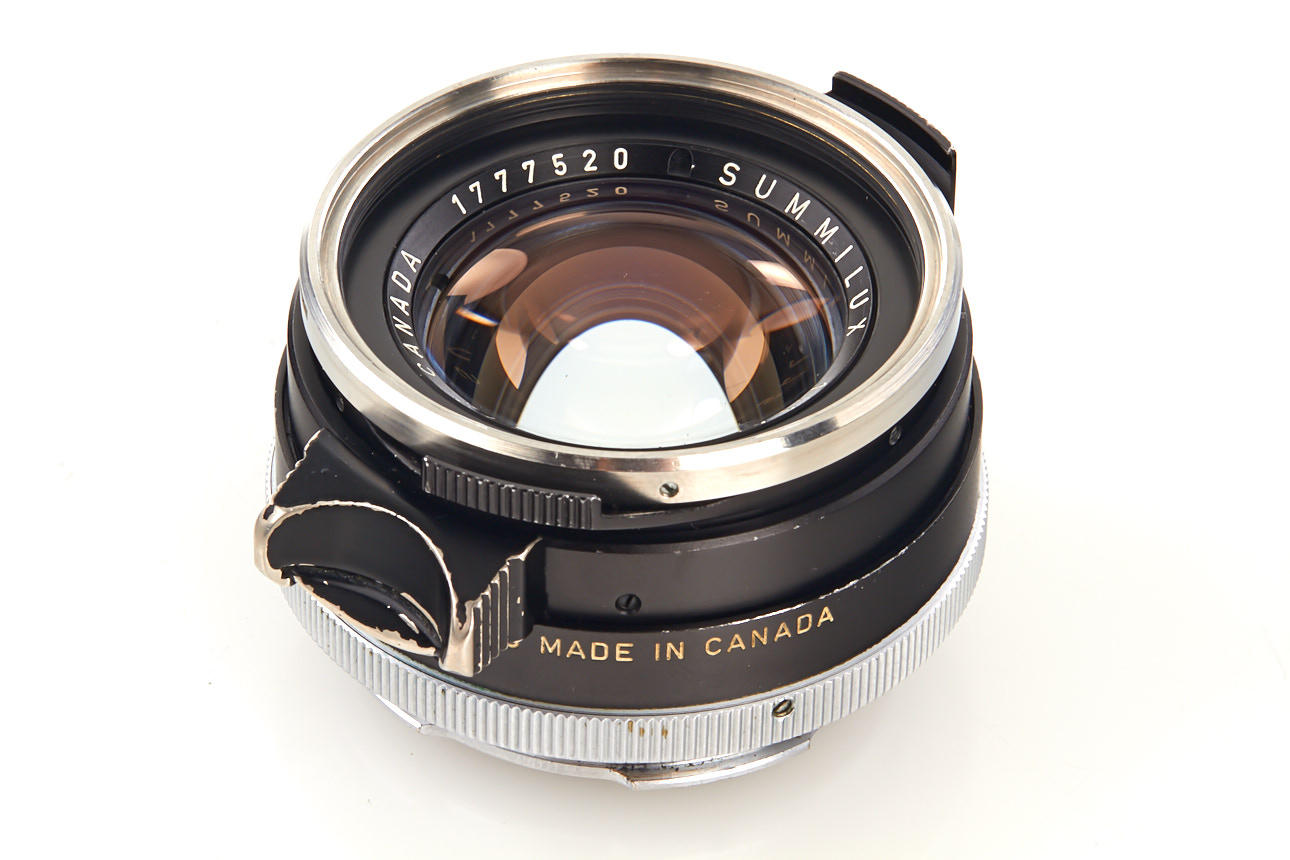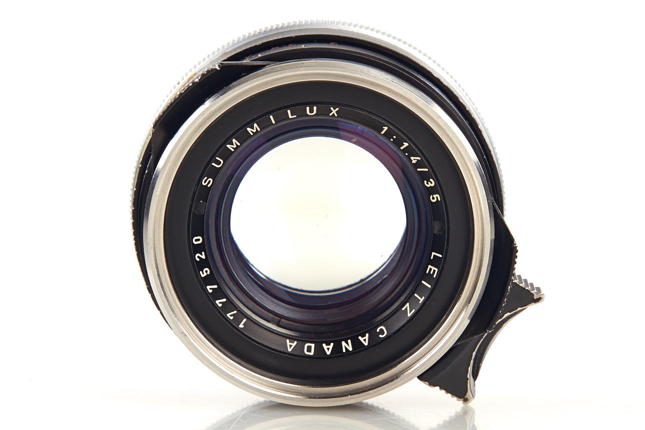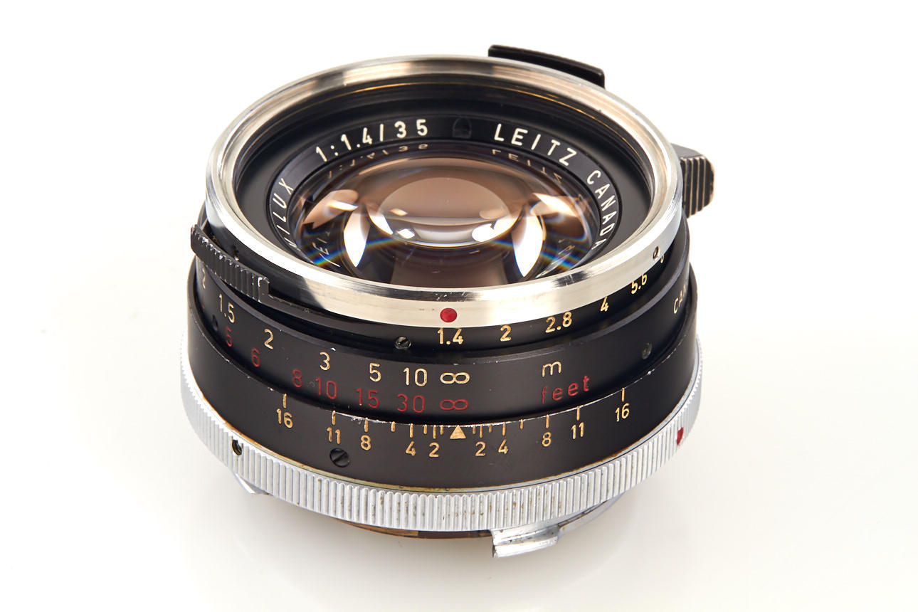 Rare black version with chrome front rim in fine condition, only the focusing handle and infinity lock button (black-painted) with some wear (crisp aperture stops, smooth focusing, clean lenses, keeper). A very rare and special, sought-after lens is the 35 mm Summilux f/1.4 lens in black finish with chrome front rim, catalogued as the 11869 model for M2. Designed by Dr. W. Mandler, the seven-element lens was only produced in Canada. There are no records showing how many lenses were made in black finish with chrome rim, but the numbers were very low. It accepted the special lens hood OLLUX.