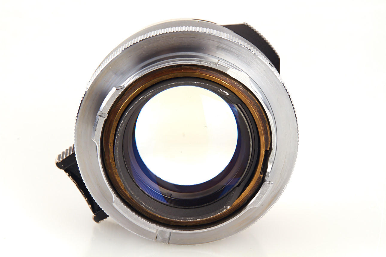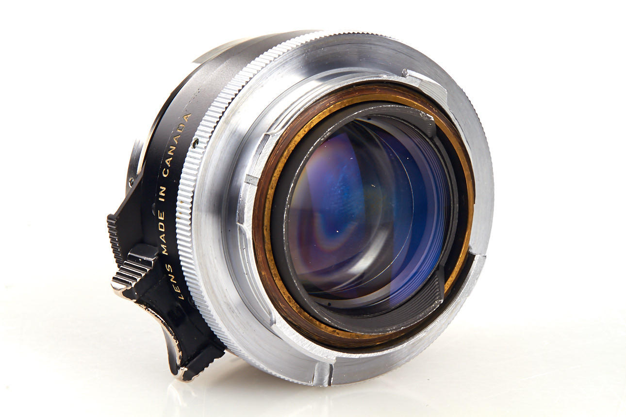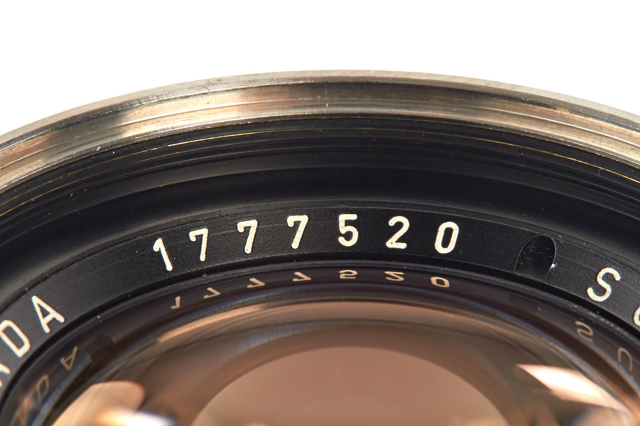 Rare black version with chrome front rim in fine condition, only the focusing handle and infinity lock button (black-painted) with some wear (crisp aperture stops, smooth focusing, clean lenses, keeper). A very rare and special, sought-after lens is the 35 mm Summilux f/1.4 lens in black finish with chrome front rim, catalogued as the 11869 model for M2. Designed by Dr. W. Mandler, the seven-element lens was only produced in Canada. There are no records showing how many lenses were made in black finish with chrome rim, but the numbers were very low. It accepted the special lens hood OLLUX.
