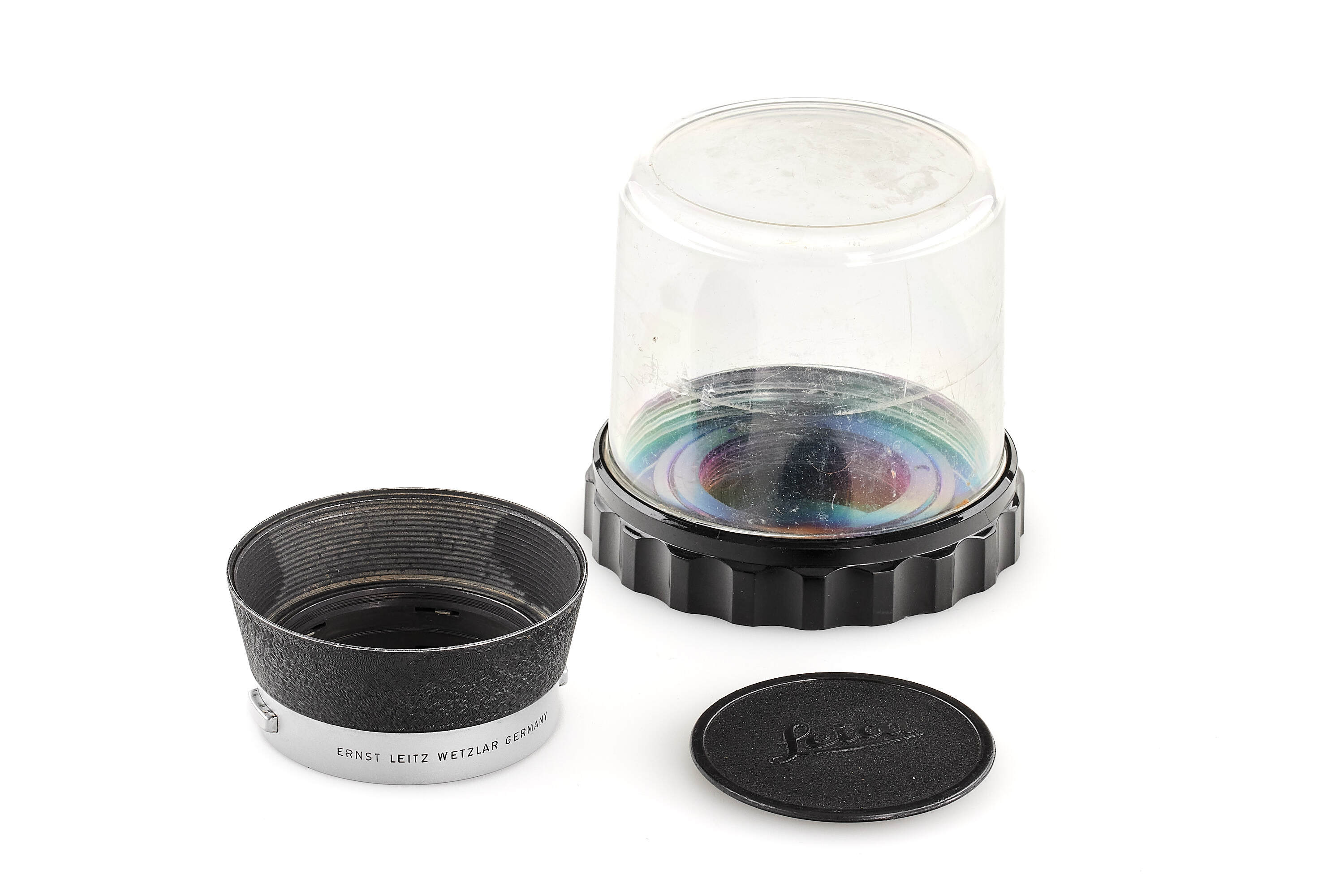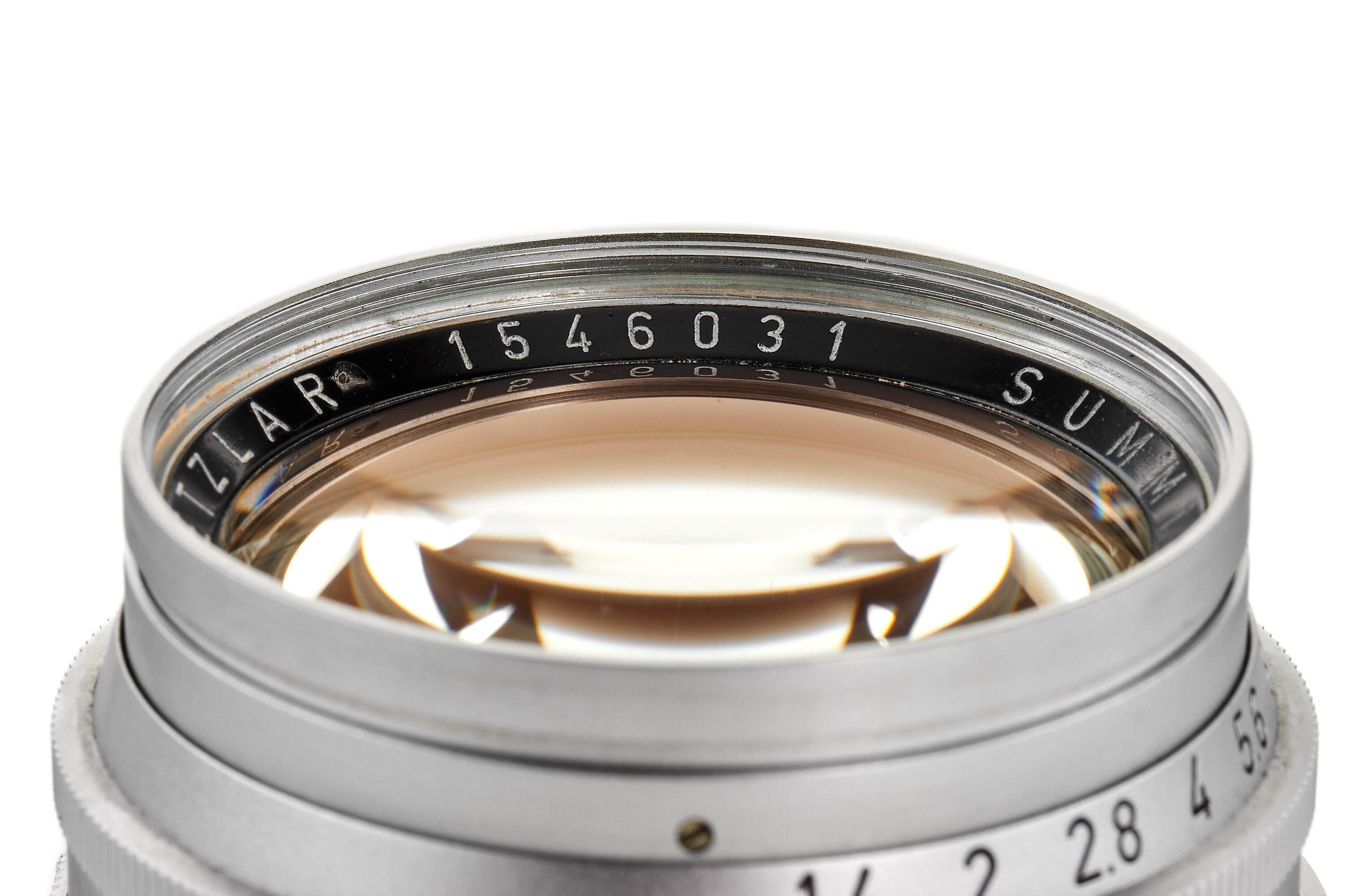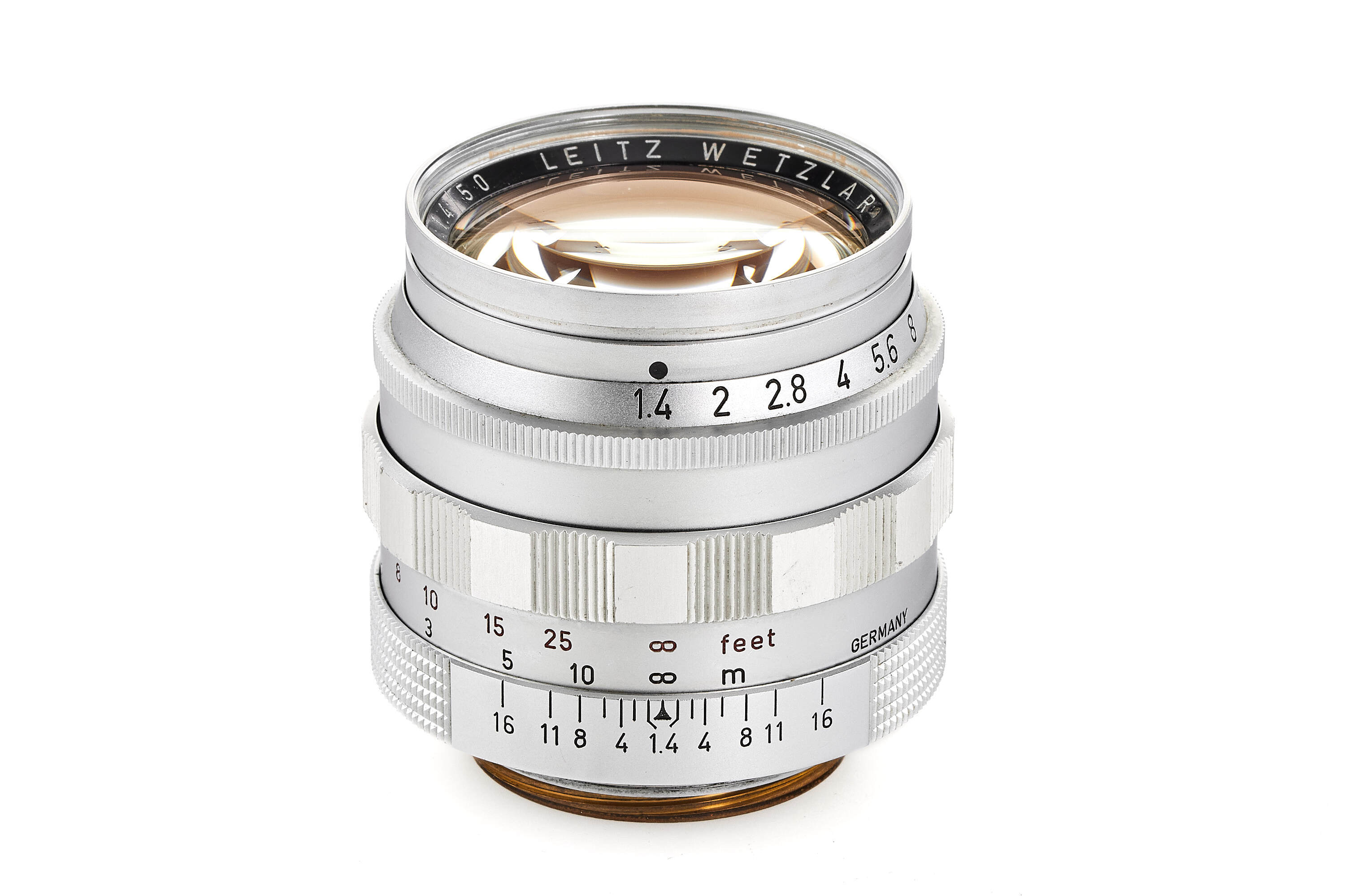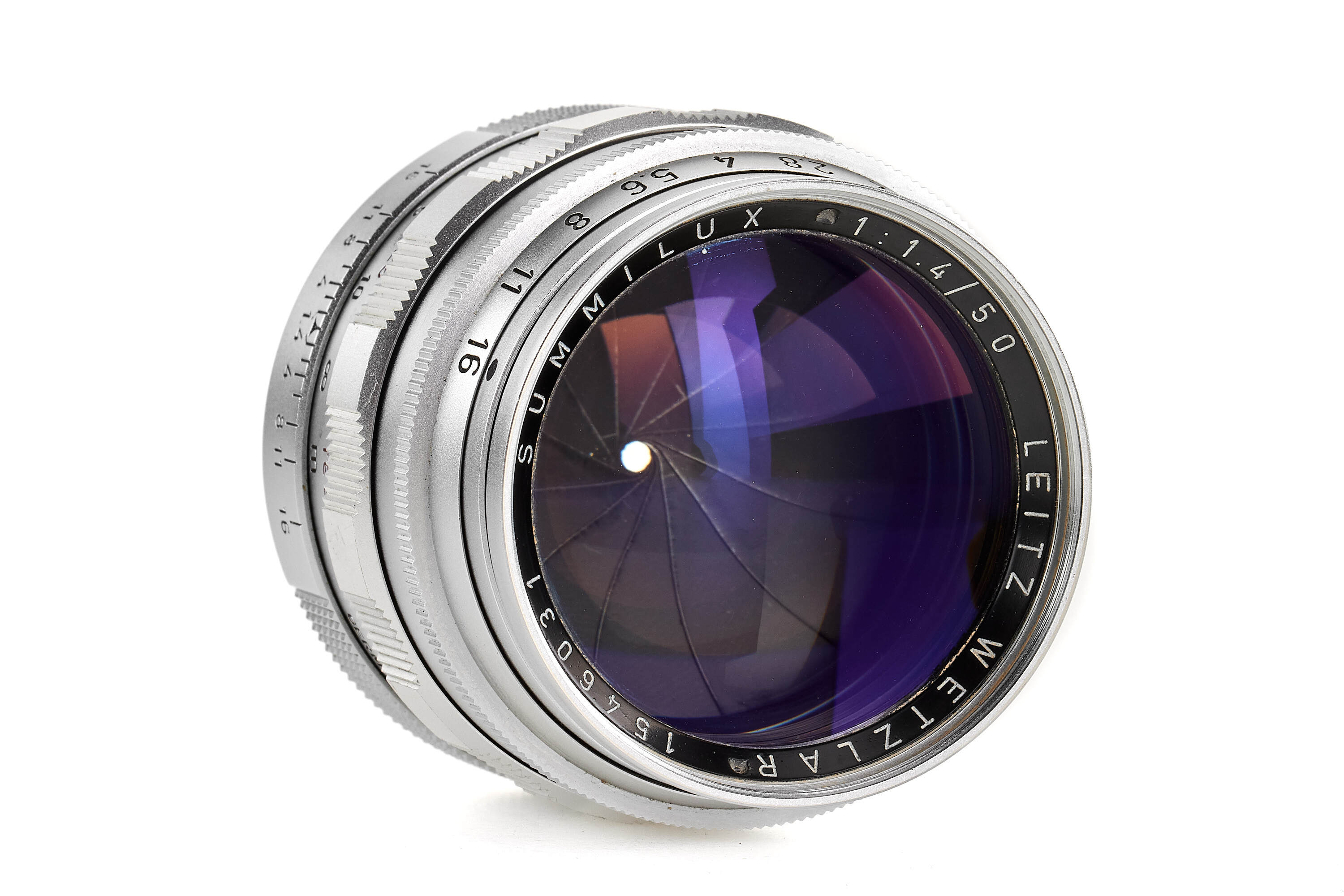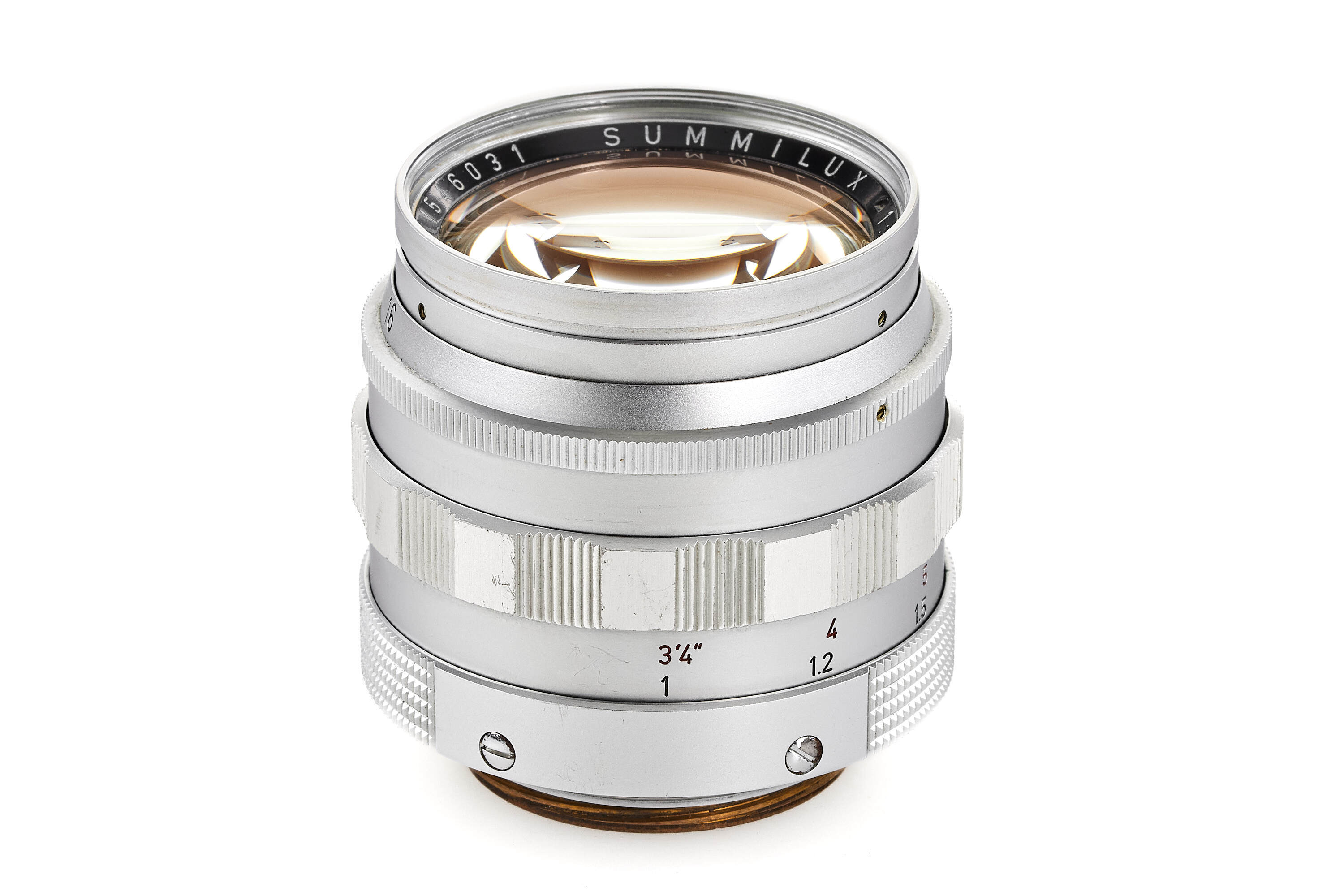 Extremely rare Summilux pre-series, from the first batch of production, starting with no.1546001 and including lenses with Summarit or Summilux engravings, in very good condition, good optics with a few discrete cleaning marks on the front element, typical for these pre-series, the numbers on the aperture scale are engraved bigger, '1.4' engraved on the depth of field scale, glass in the front element is slightly radioactive, interesting late delivery to Munich on 23.06.1961, Leitz probably updated the front ring as the Summilux version was already available on the market, together with XOOIM hood with cap and plastic keeper.
